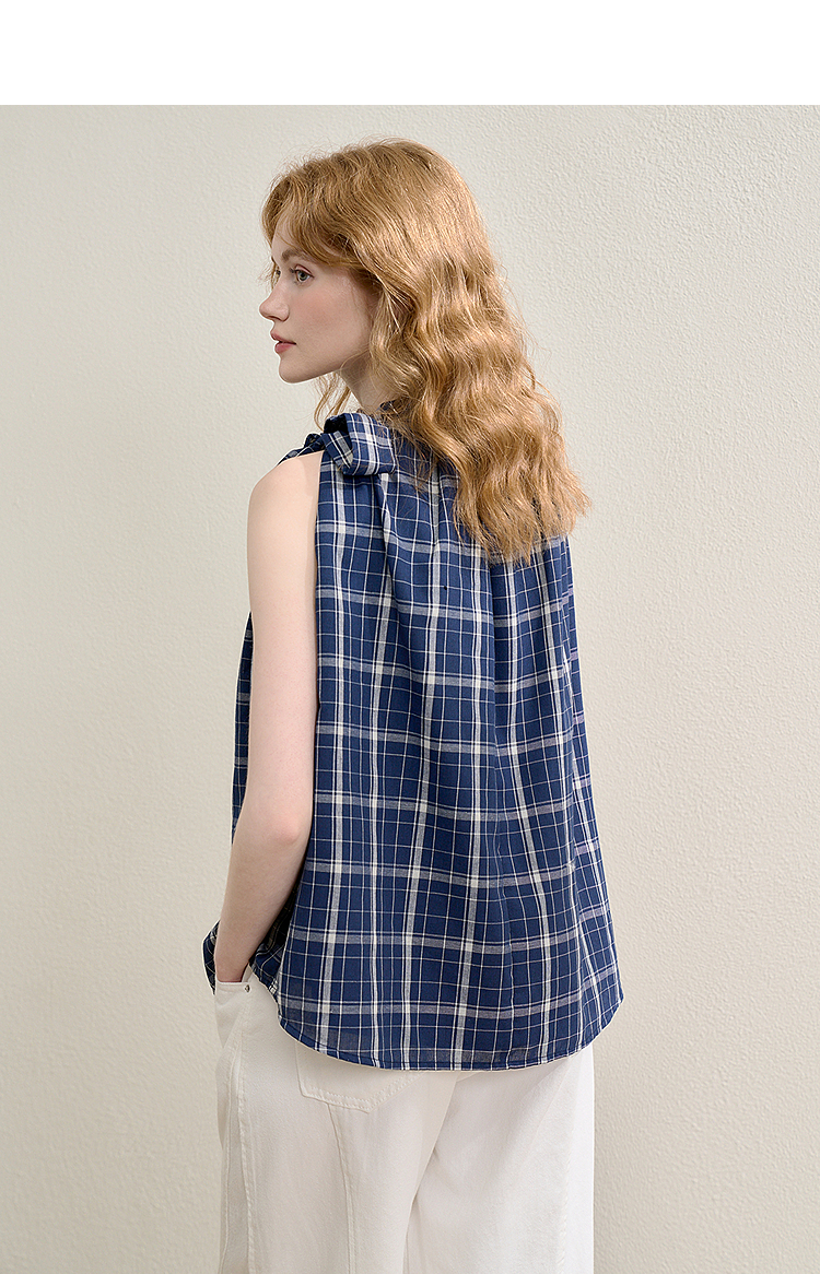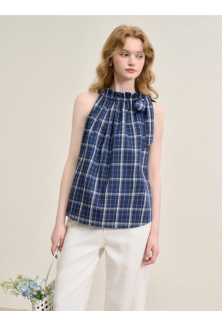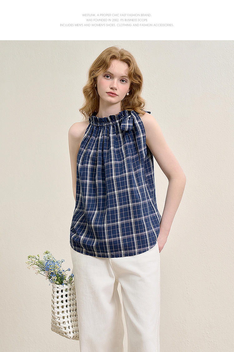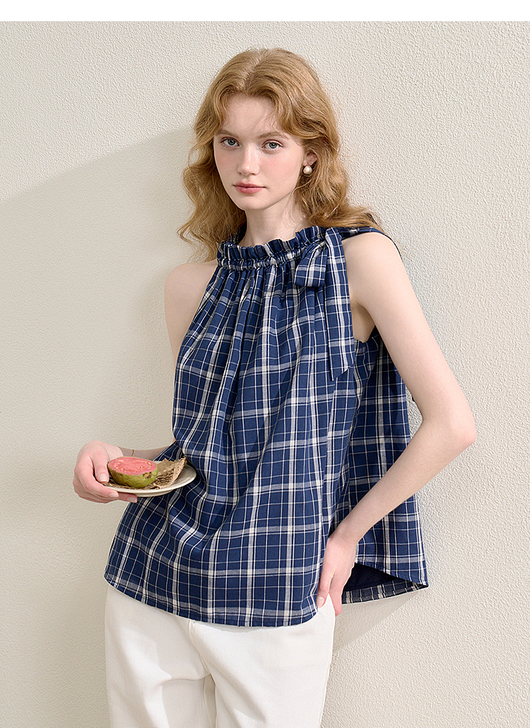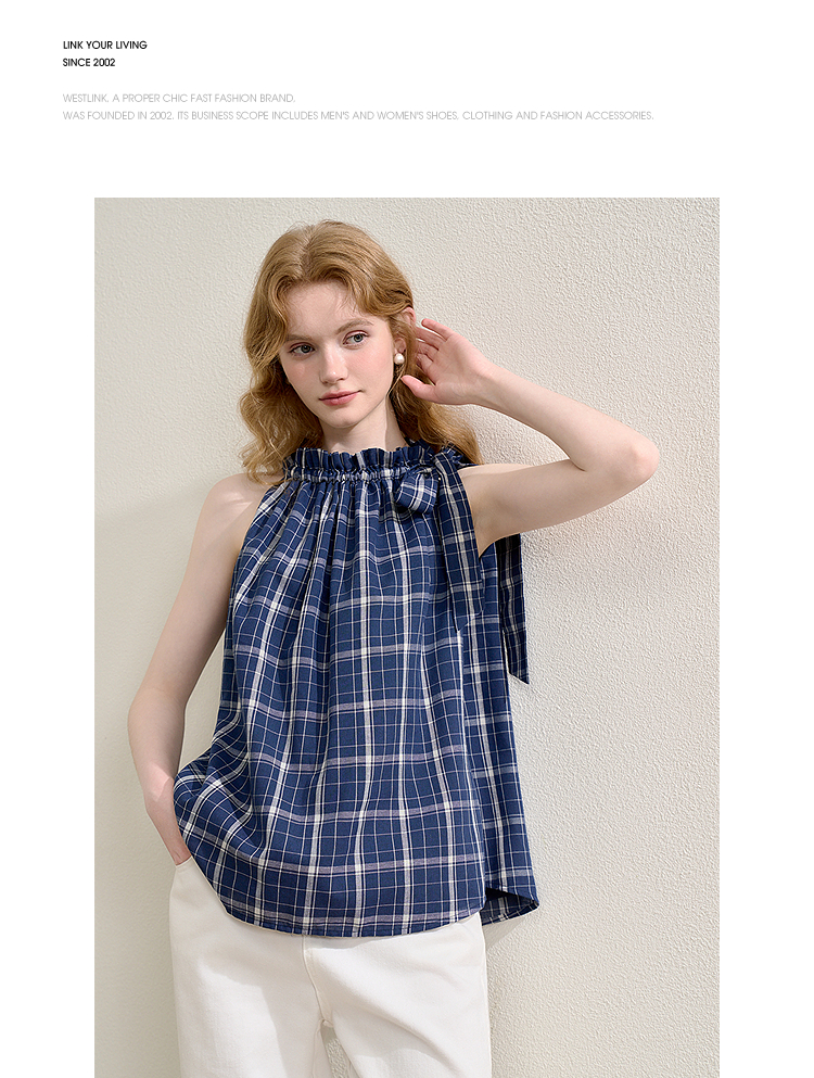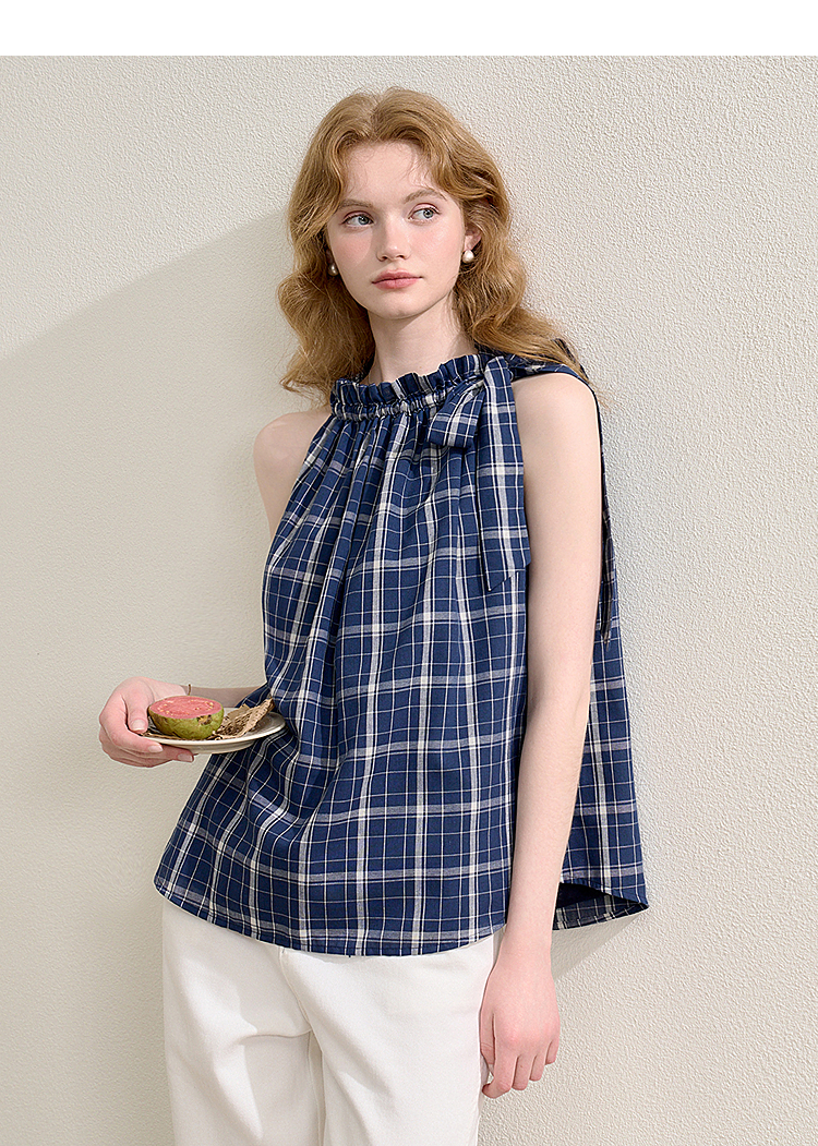 复古格纹绑带蝴蝶结挂脖衬衫女夏季俏皮可爱宽松衬衣V1050637