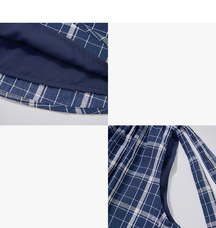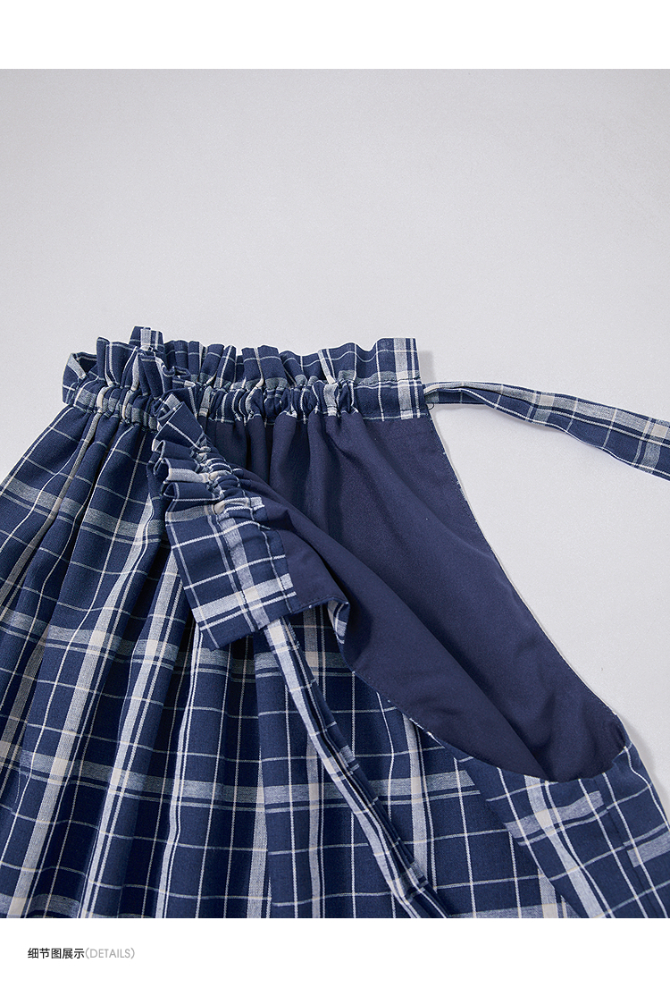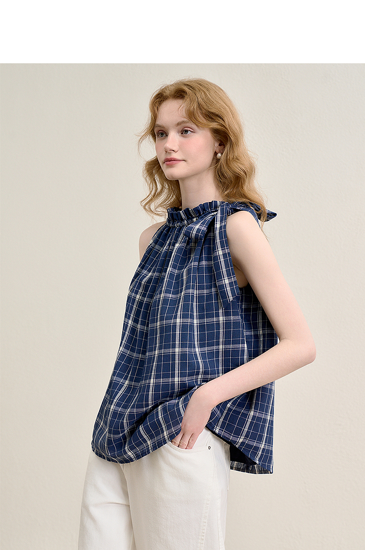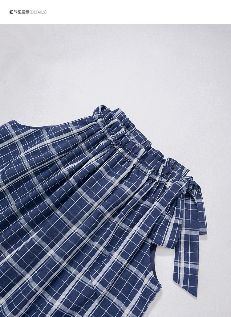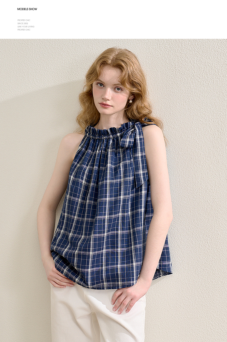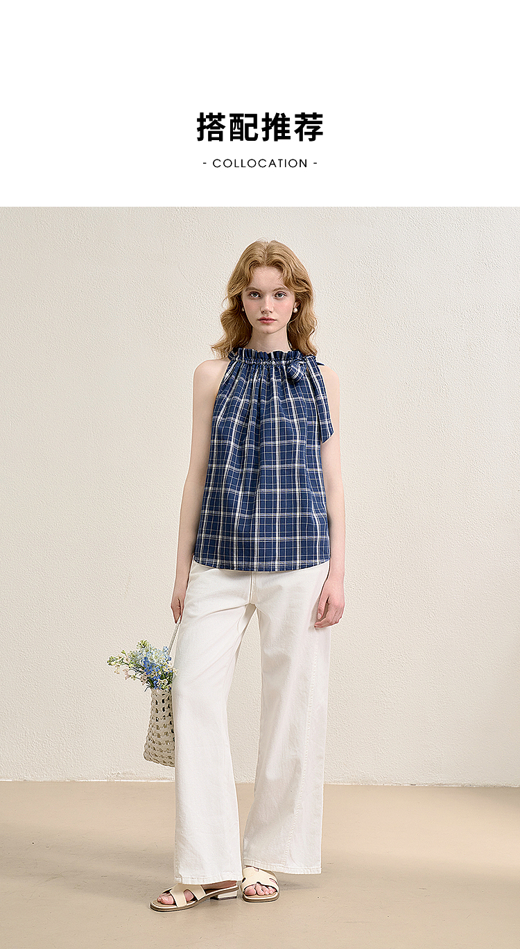 复古格纹绑带蝴蝶结挂脖衬衫女夏季俏皮可爱宽松衬衣V1050637