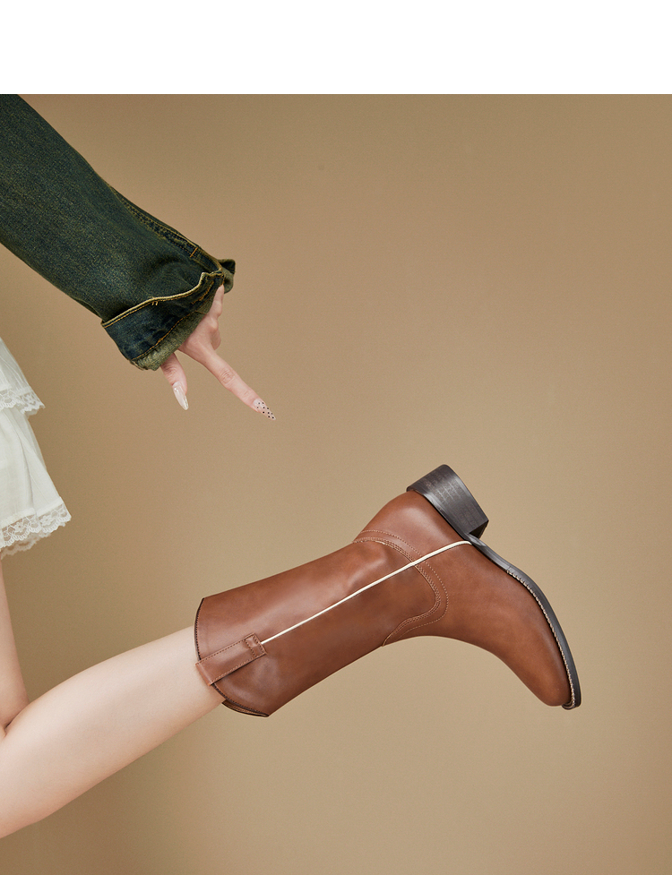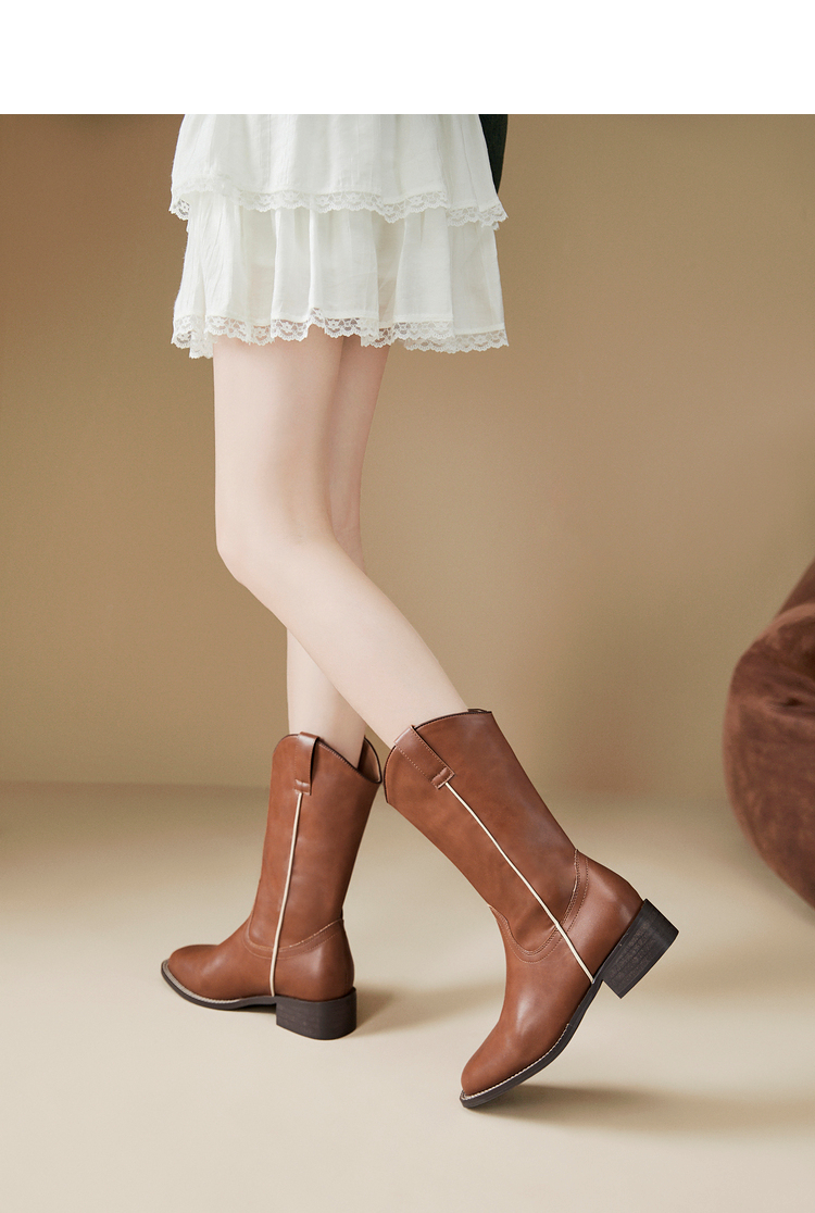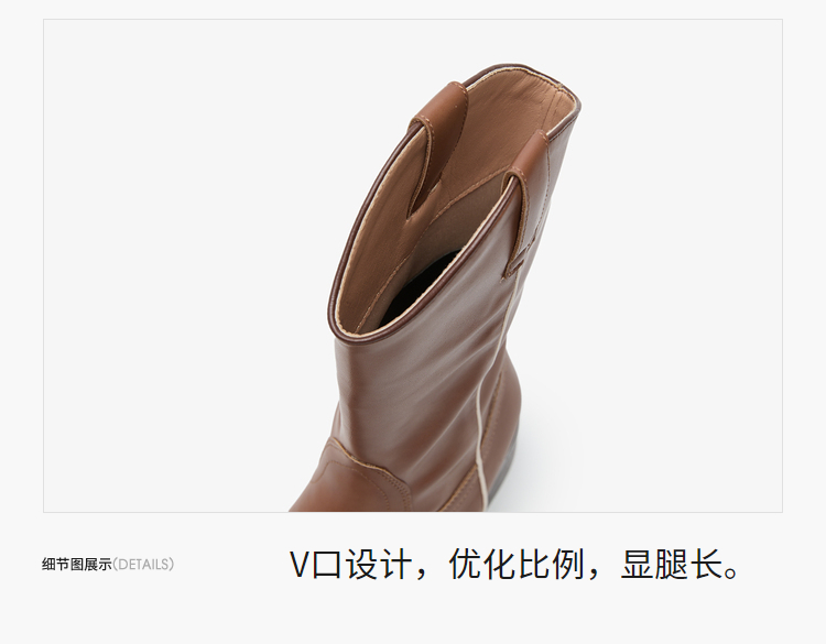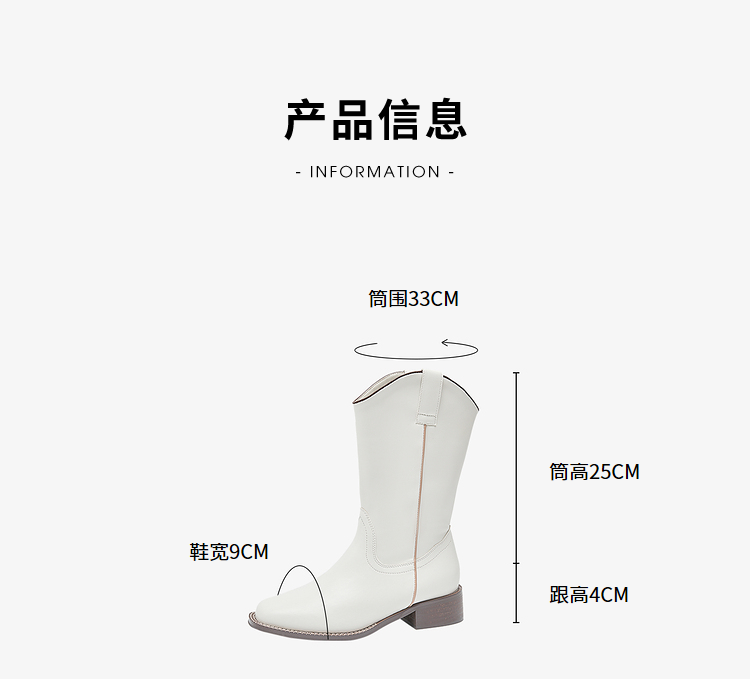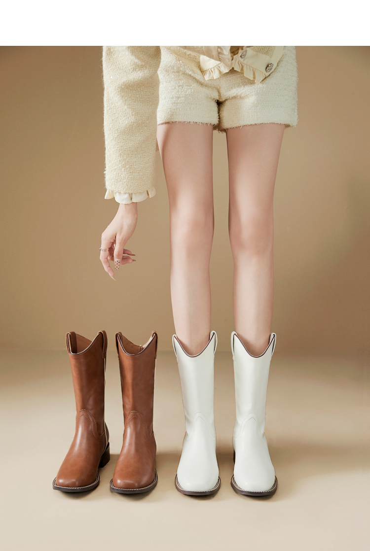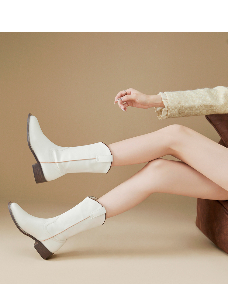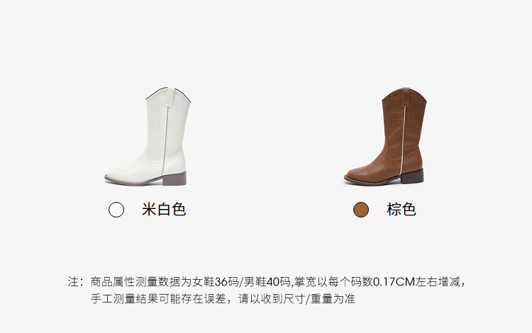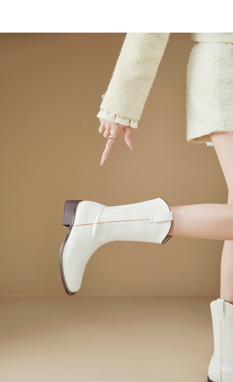 西遇西部牛仔靴女新款秋冬美拉德马丁靴中筒V口方头白色短靴D0047794