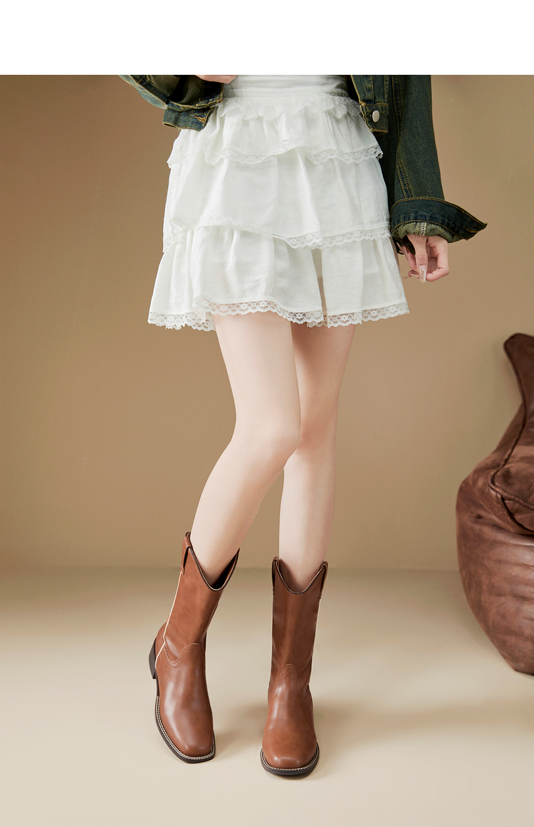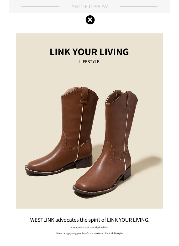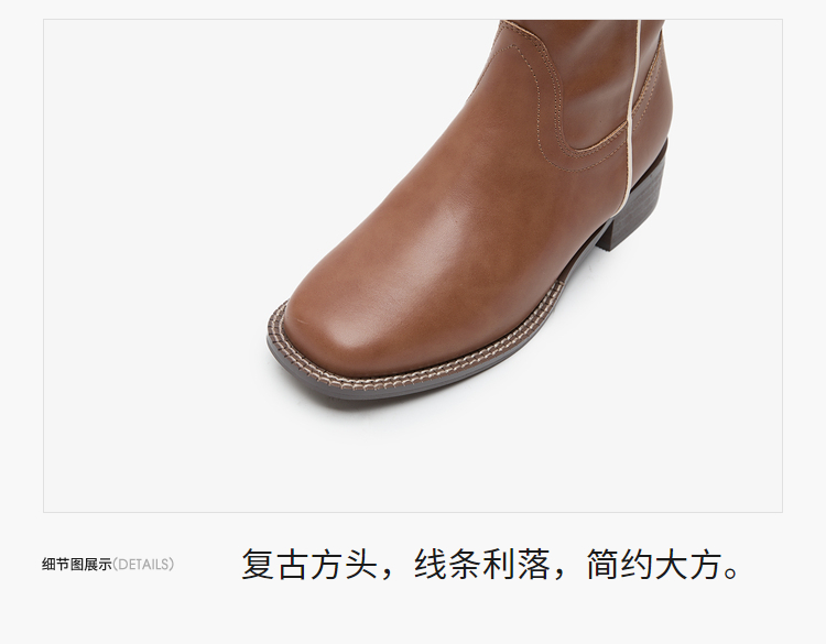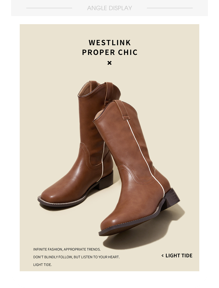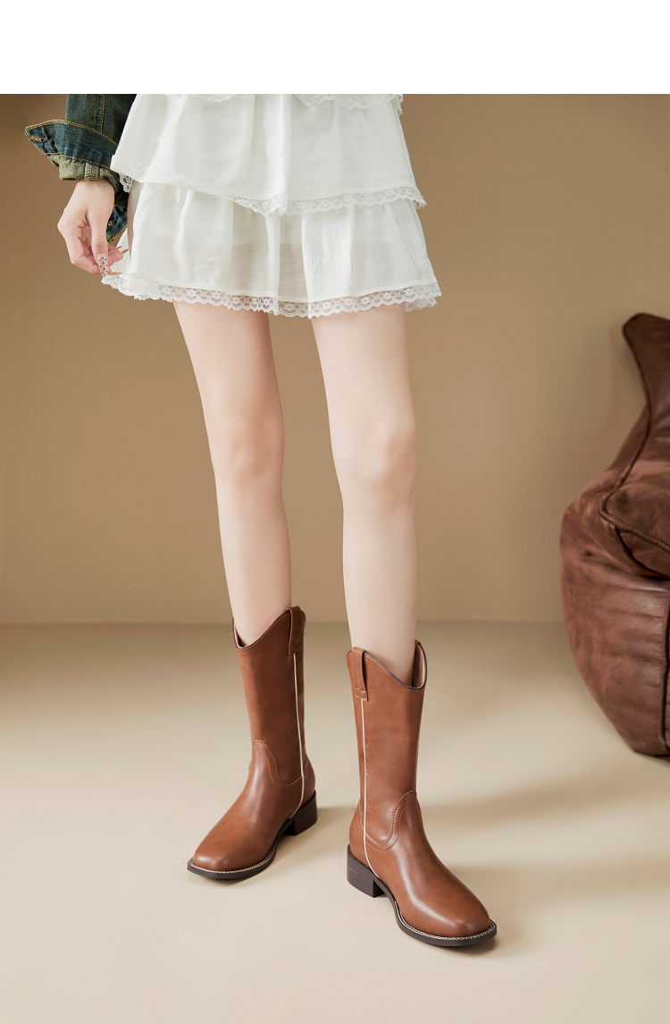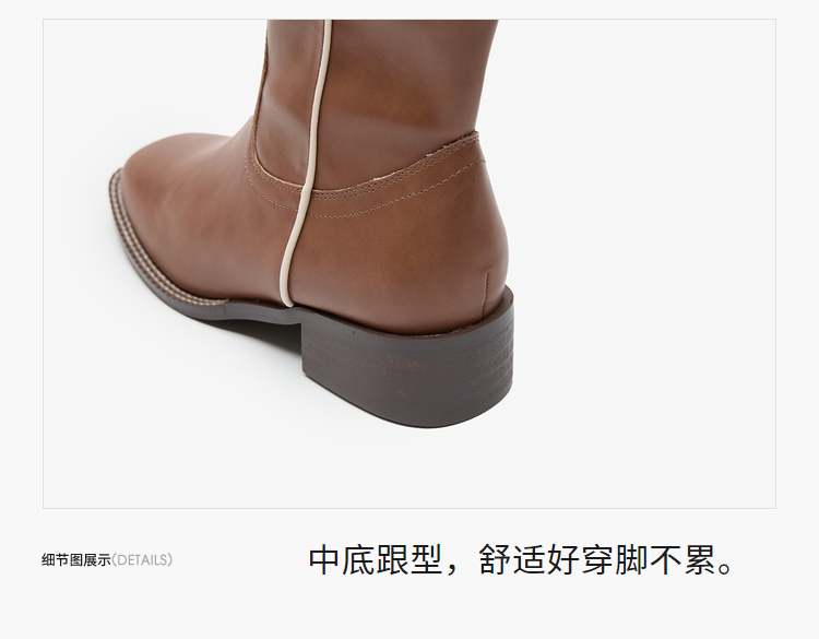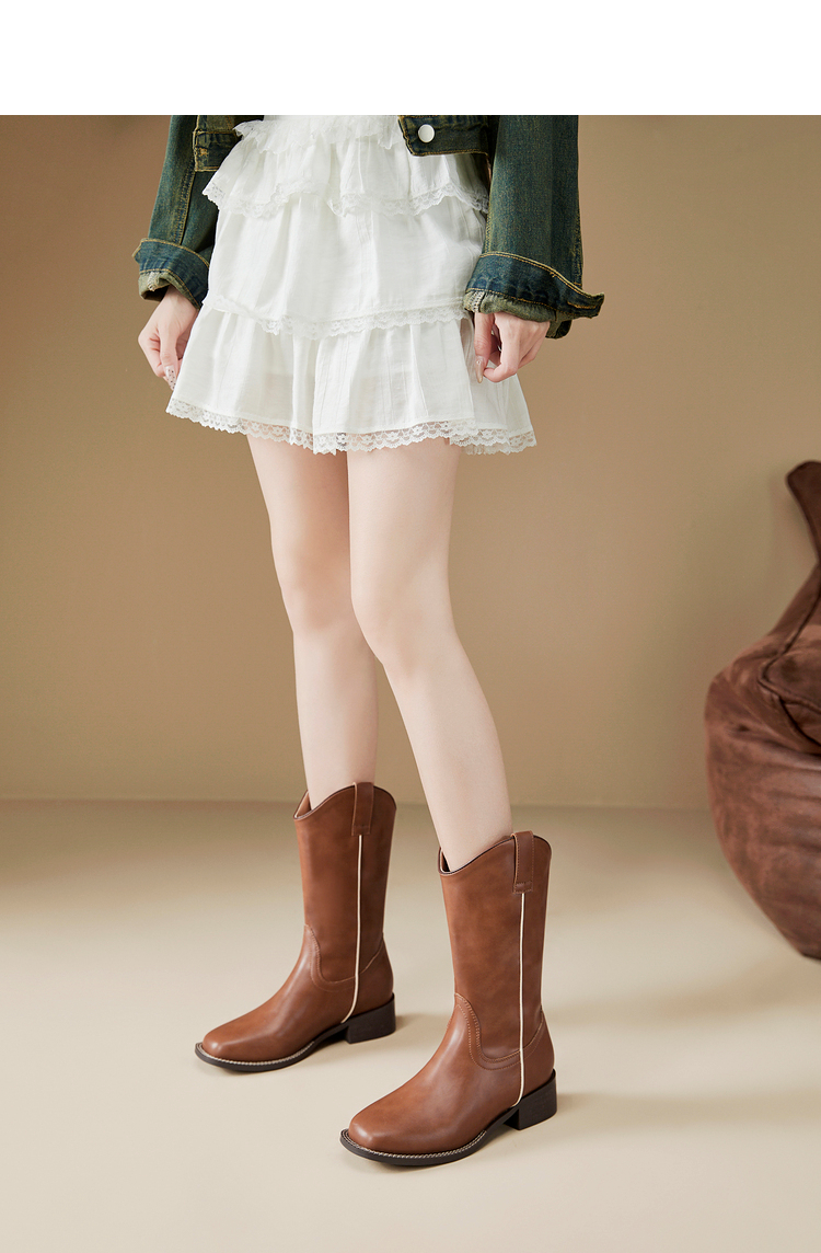 西遇西部牛仔靴女新款秋冬美拉德马丁靴中筒V口方头白色短靴D0047794