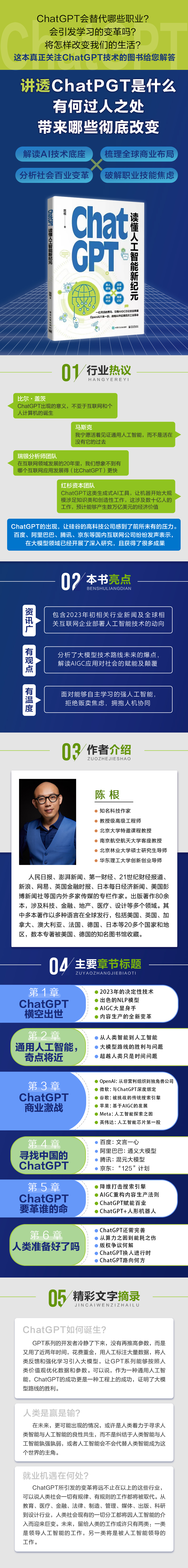 ChatGPT爆火,标志着人工智能从量变到质变的飞跃,一场新的人工智能革命已经到来。本书共6章,介绍了ChatGPT的诞生和发展,以及ChatGPT背后的技术路线;分析了ChatGPT及大模型训练对全球商业格局的冲击与影响,涉及OpenAI、微软、谷歌、百度、腾讯、阿里巴巴等广受关注的互联网科技公司;选取了具有代表性的行业,解读ChatGPT狂潮引发的产业颠覆与模式创新。同时,本书对未来的强人工智能与人类社会的关系进行了深度研讨。