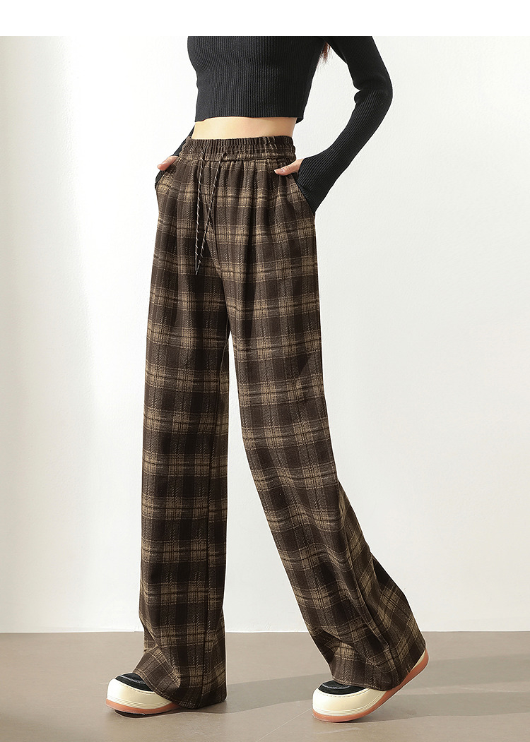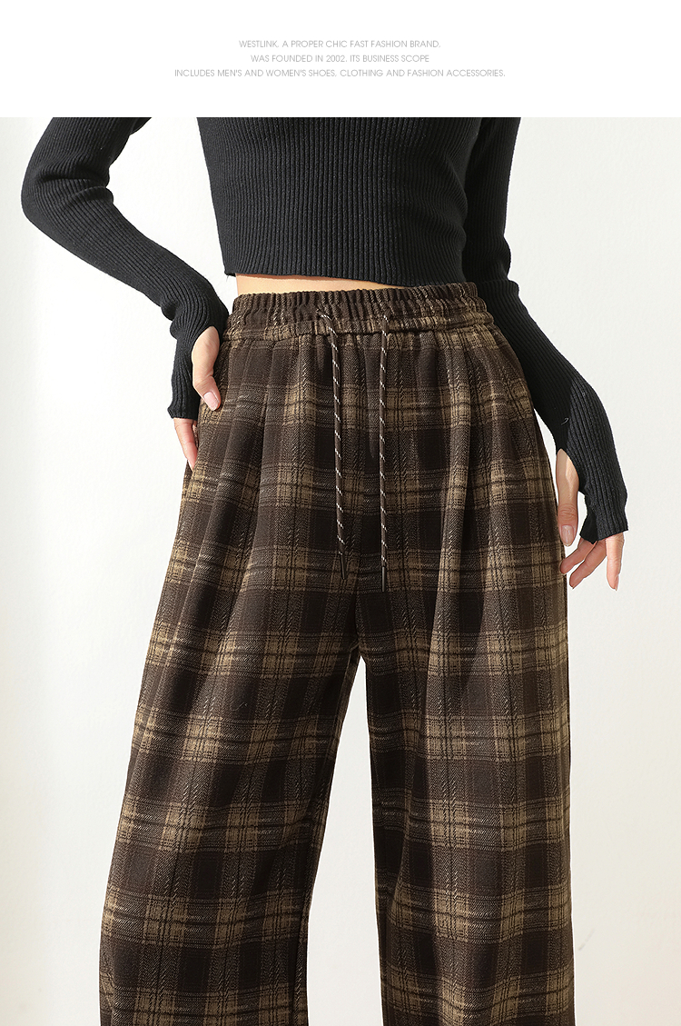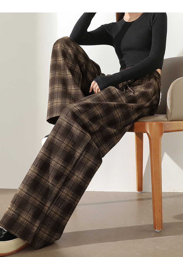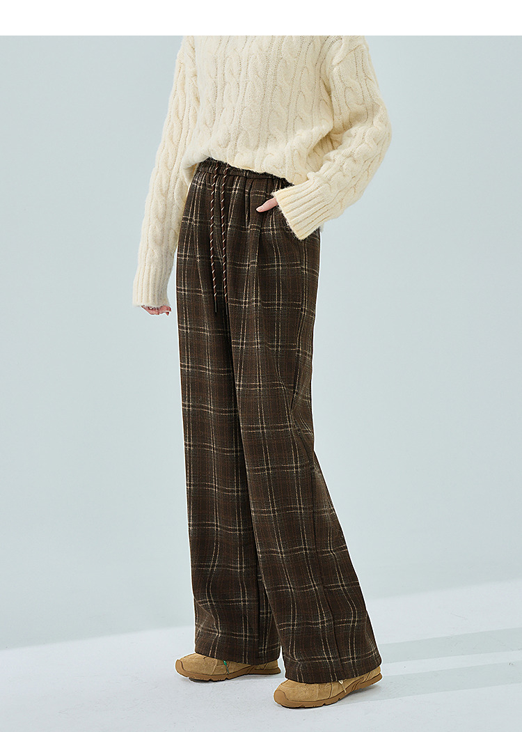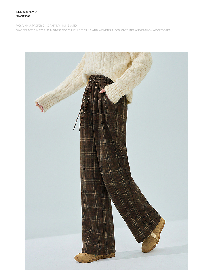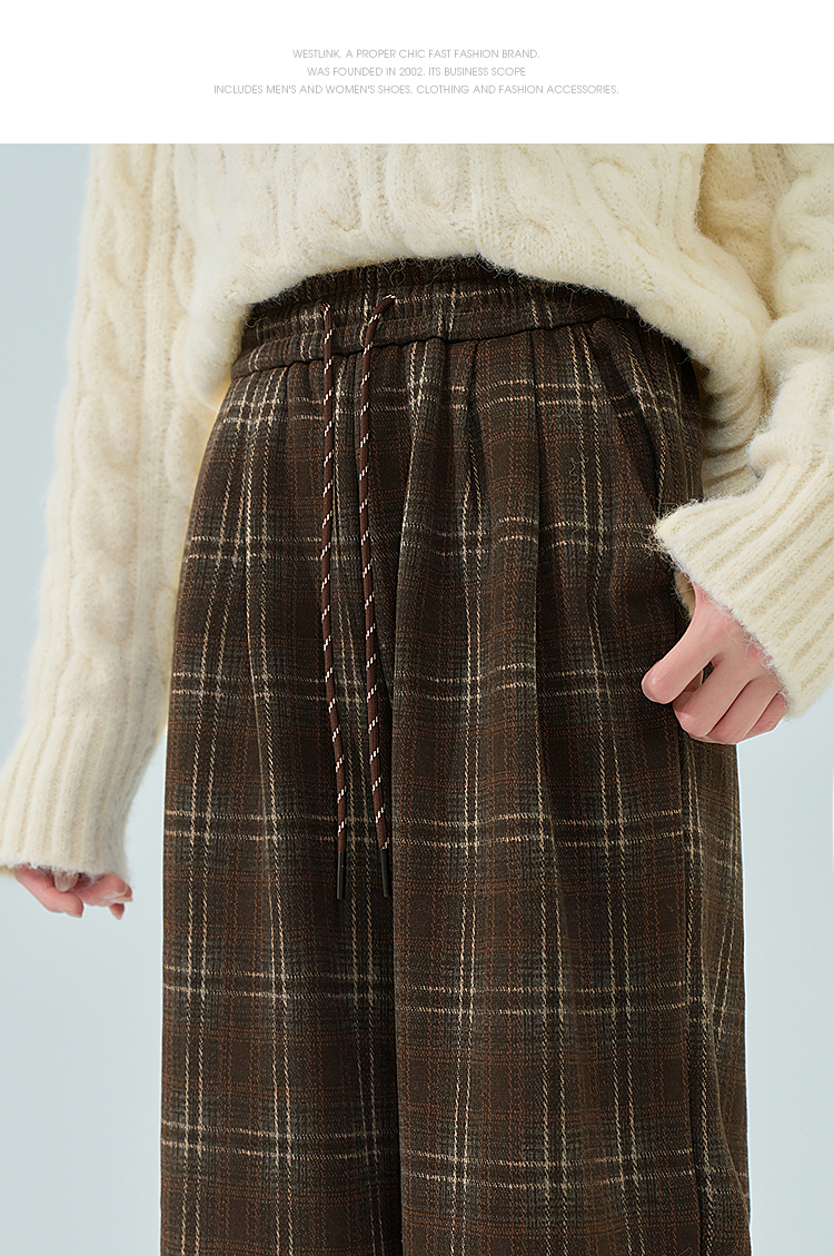 西遇咖色格纹直筒裤女新款复古高腰抽绳休闲百搭休闲裤D0043924(单层)