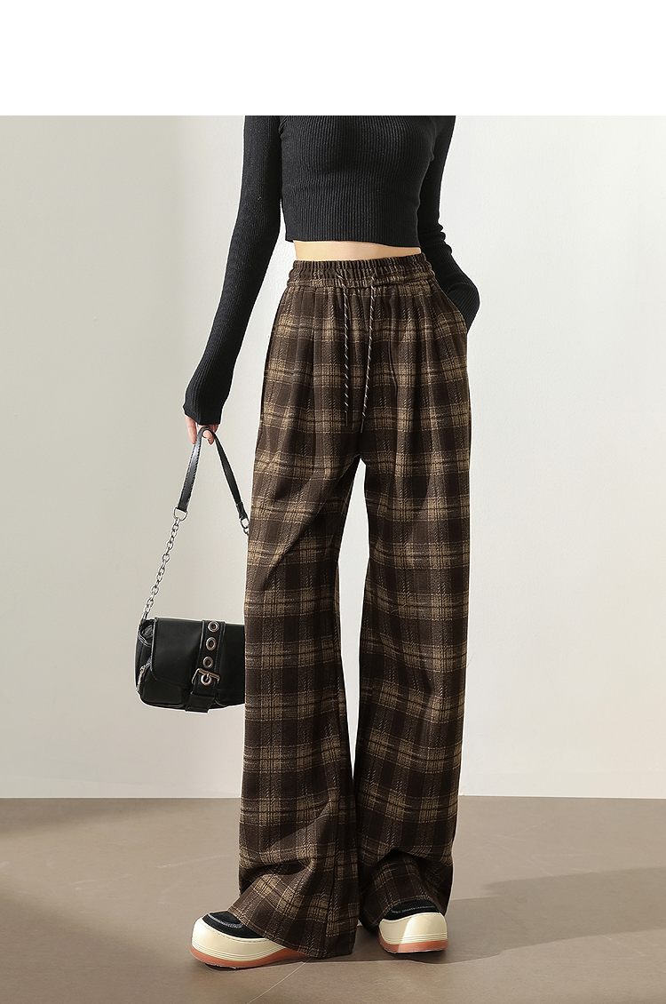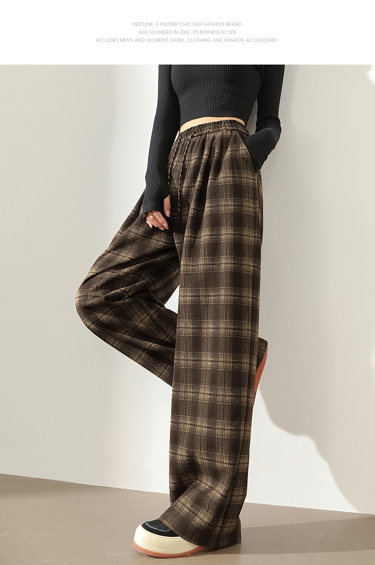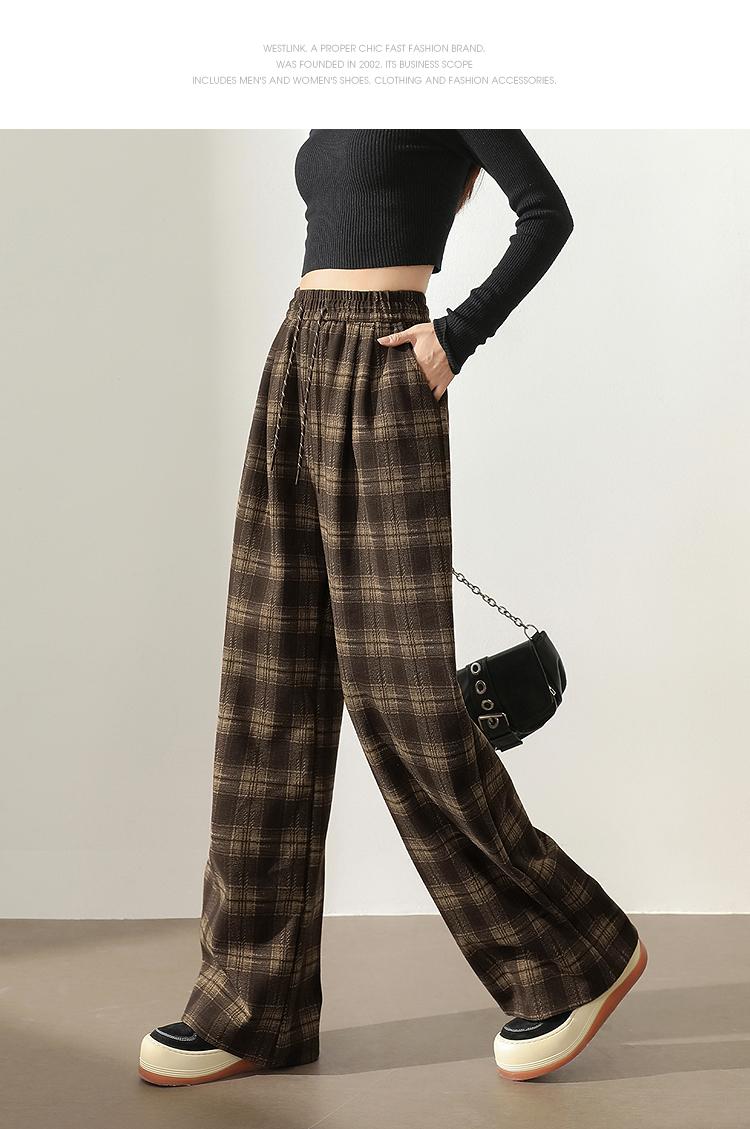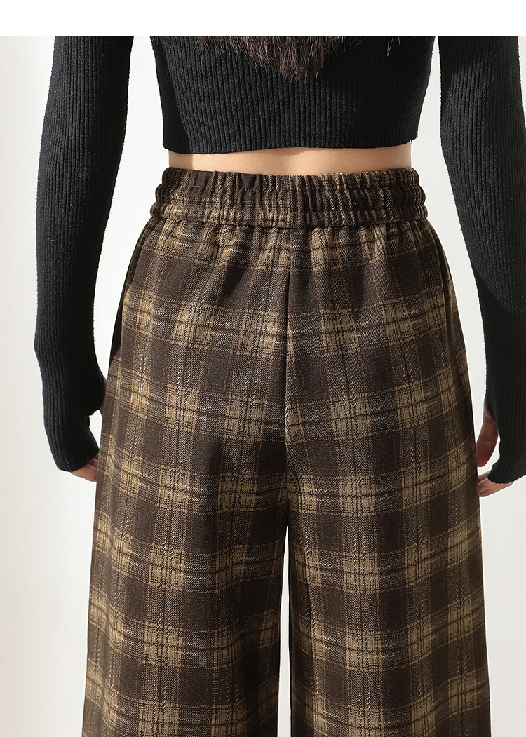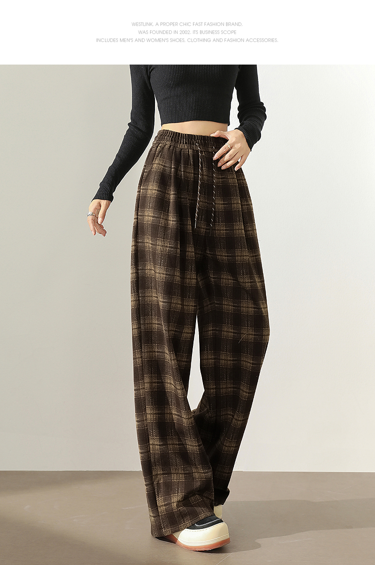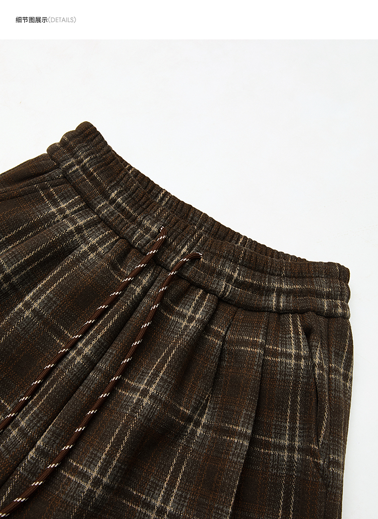 西遇咖色格纹直筒裤女新款复古高腰抽绳休闲百搭休闲裤D0043924(单层)