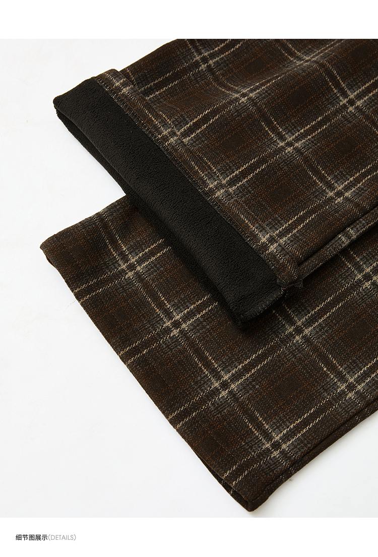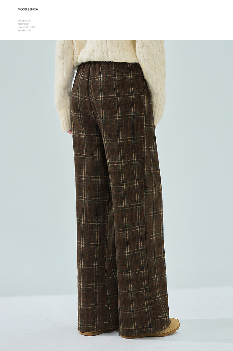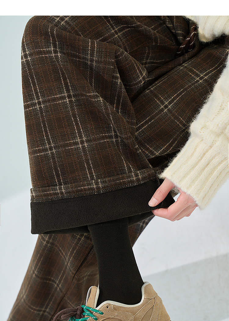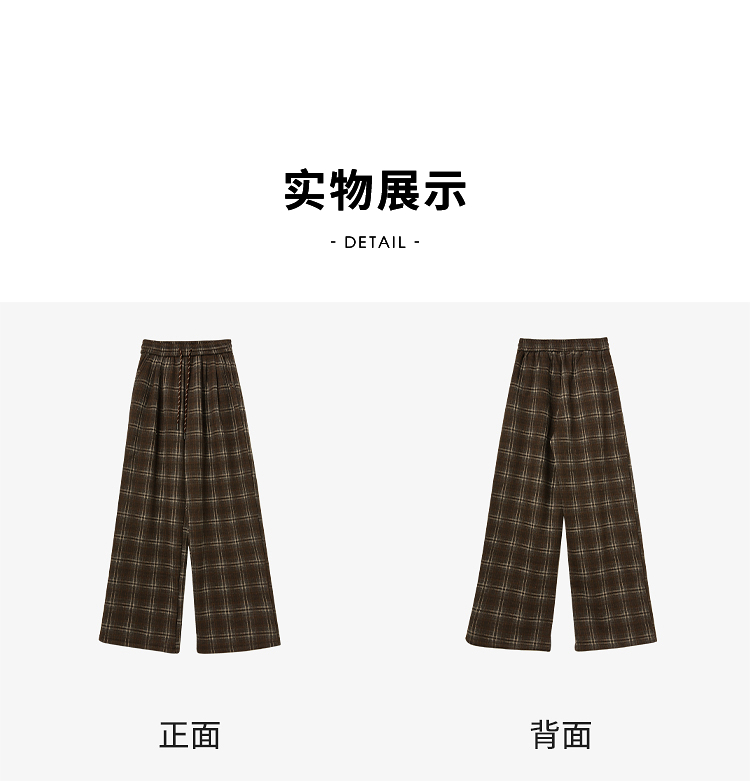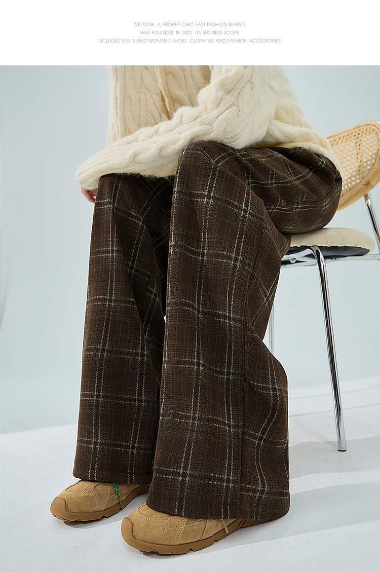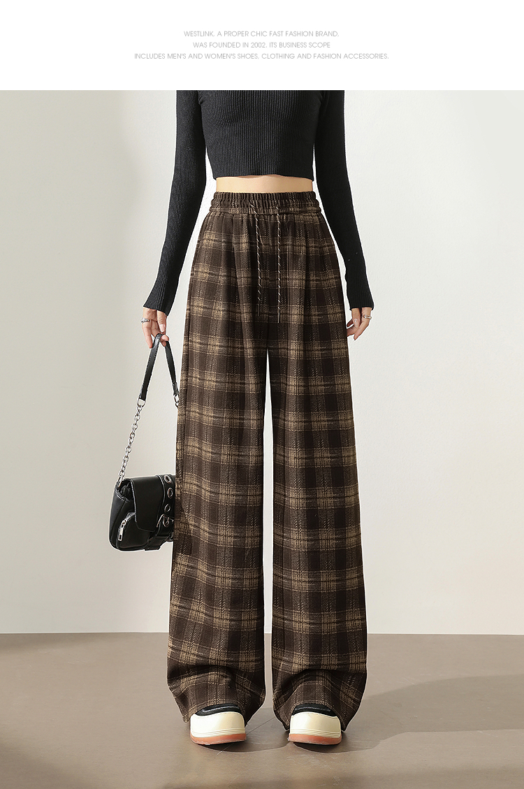 西遇咖色格纹直筒裤女新款复古高腰抽绳休闲百搭休闲裤D0043924(单层)