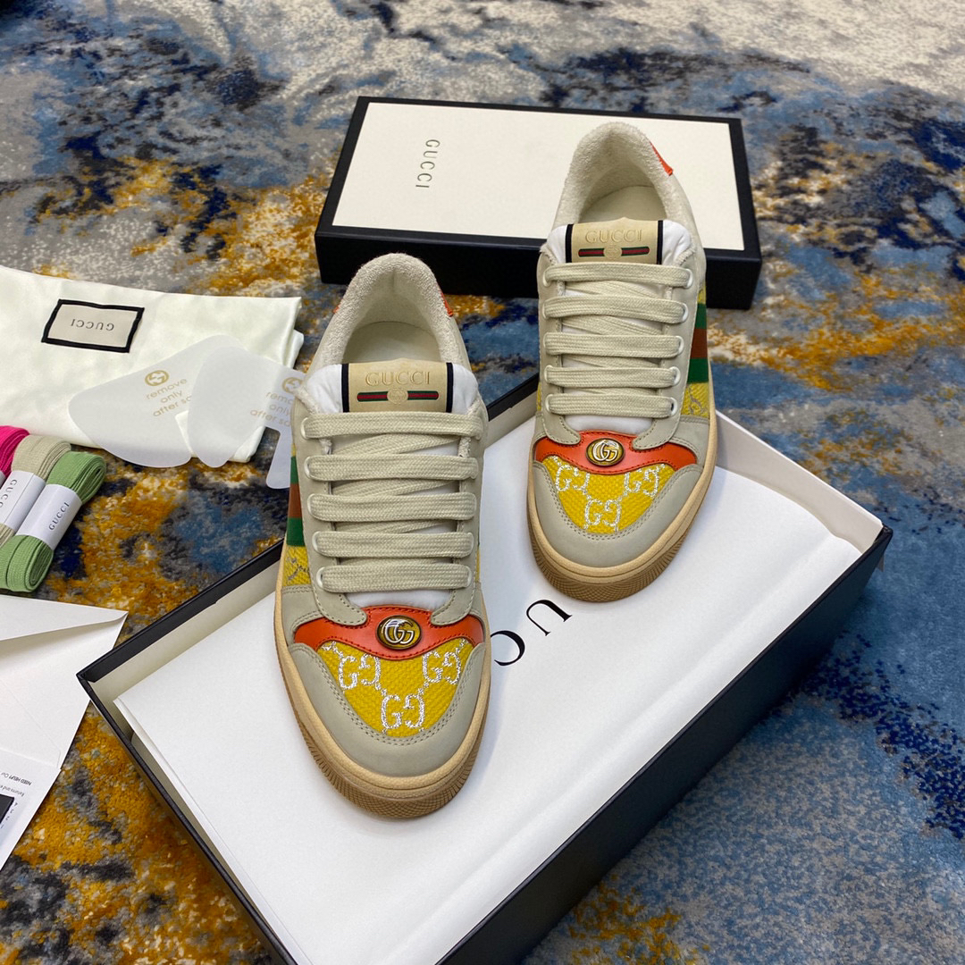 鞋面擦色牛皮拼接经典双G布面料,皮面切口全油边封口工艺,原版毛巾布里细腻柔软更舒适透气,垫脚乳胶注塑一体,私模钢印双色原版TPU大底(下层宽,上层窄)