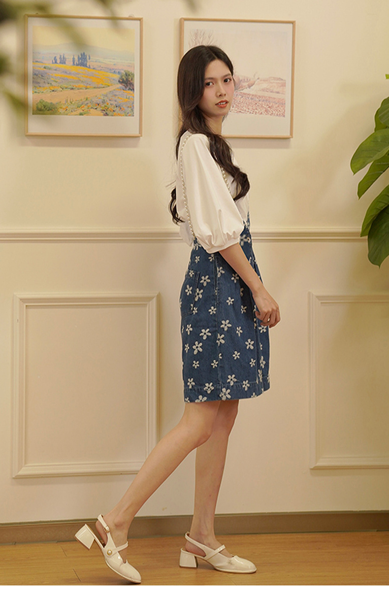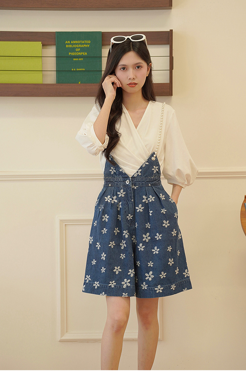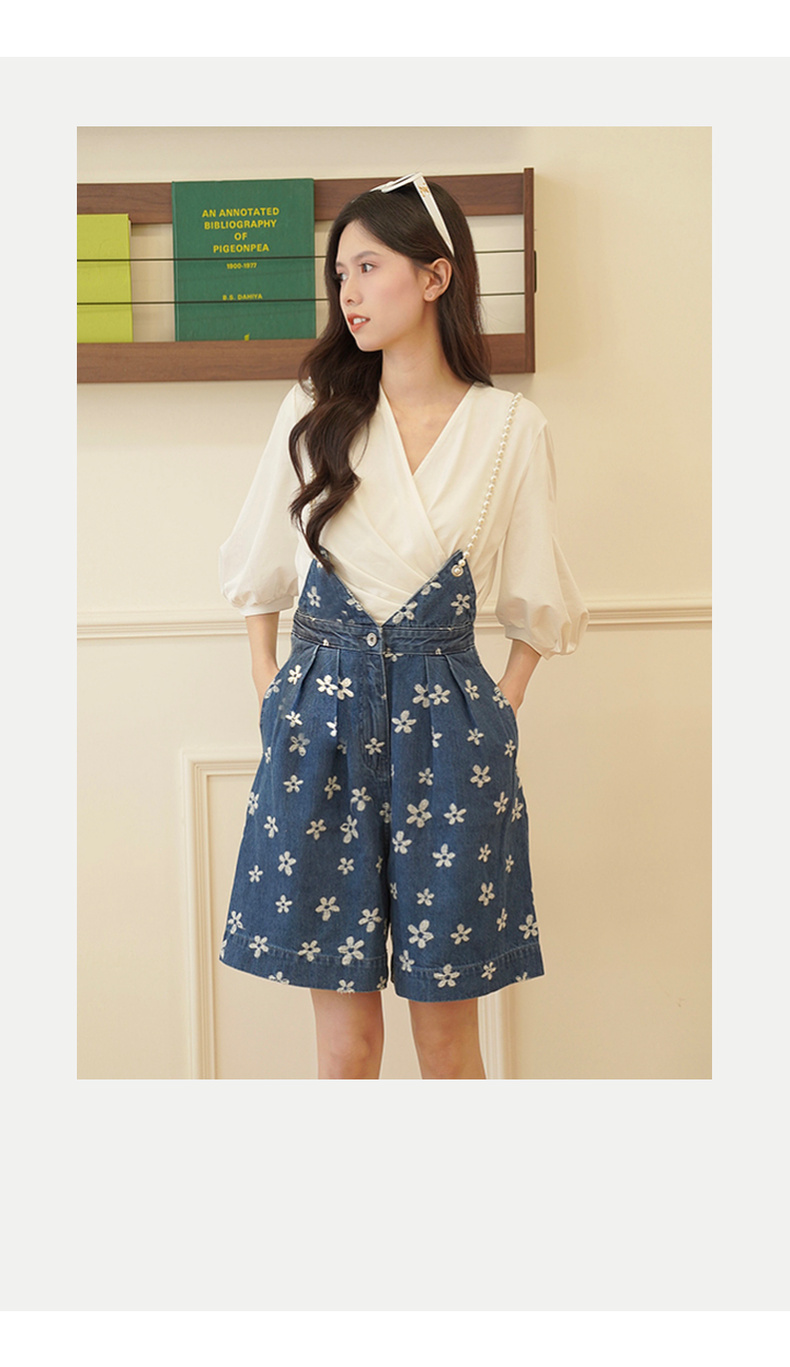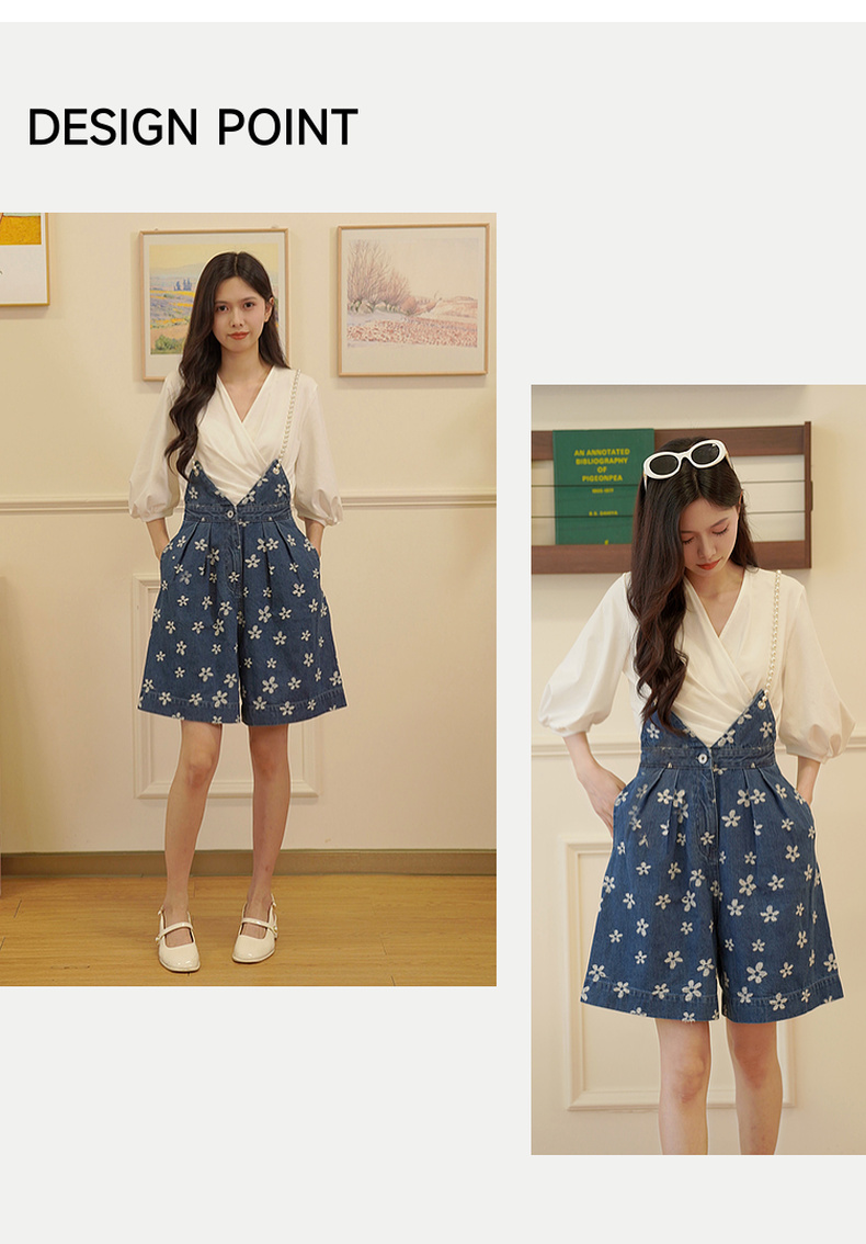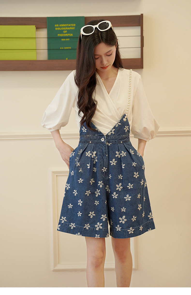 两三事 落花凝玉 2024新款碎花印花串珠背带牛仔裤女