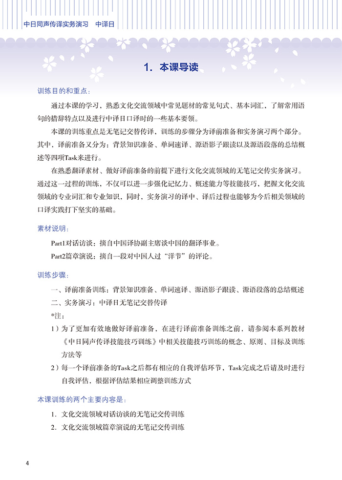 《中日同声传译实务演习 中译日》主教材的每一课主要由以下四个部分构成:*部分:本课导读第二部分:实务演习第三部分:课后练习第四部分:训练日志和小专栏其中 “实务演习”作为每一课内容的核心部分,因素材类型的不同,在每一课中分成对话访谈和篇章演说两部分。同时针对每一个训练内容或环节还明确提出“训练内容”“训练要求”“训练目的”。学习者只要在认真思考并学习“本课导读”的前提下,按照课程所设置的环节和步骤进行练习,就能在课程结束时极大地提高口译技能技巧的相关专业知识与能力。另外,根据练习内容,主教材还设计了自我评估环节,学习者可以根据列出的评估项目自我测试相关技能技巧的掌握情况,并根据自己的评估结果选择相应的步骤,进行适合的后续训练。