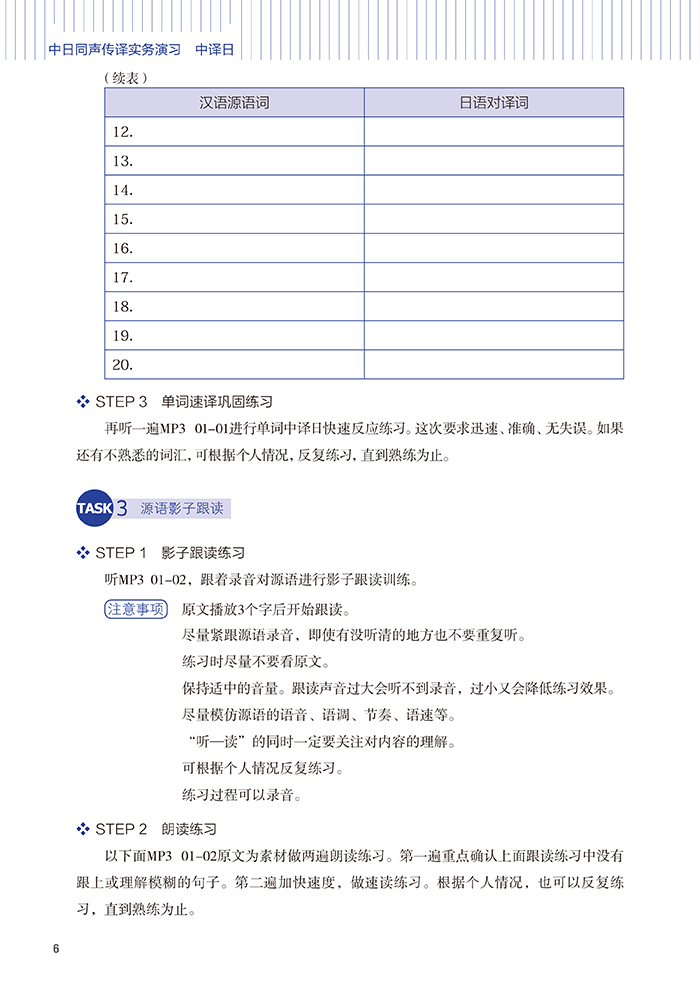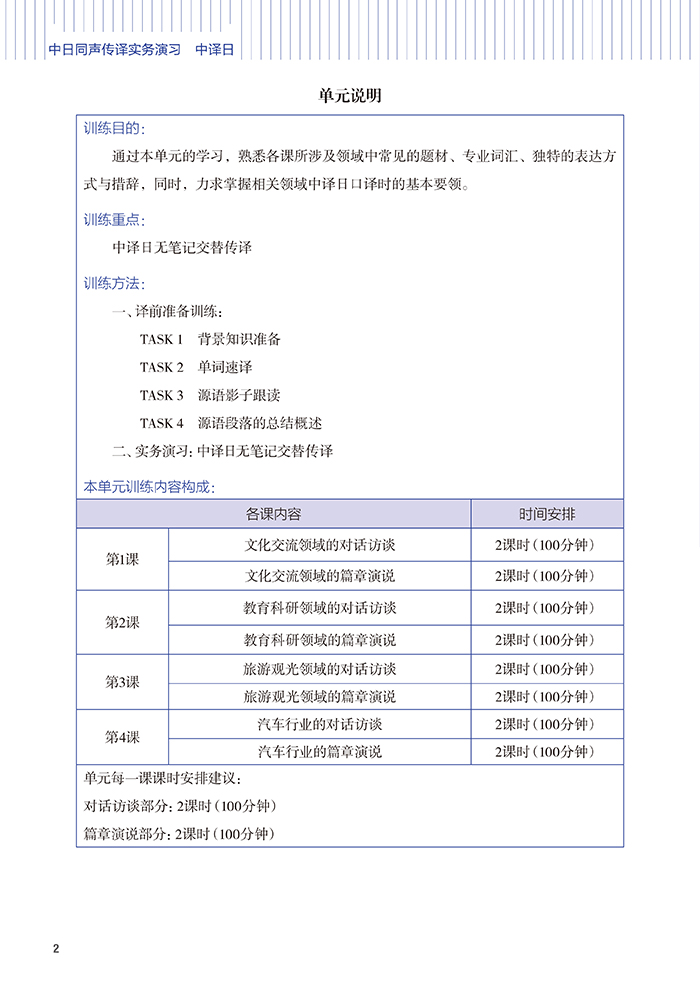 《中日同声传译实务演习》素材的难易程度设计了四个单元,并分别设定了每个单元的训练目标。从译前准备部分的快速反应、跟读、复述、概述、转述、视译等技能技巧到实务演习部分的无笔记交替传译、有笔记交替传译、耳语传译和同声传译等综合训练环节的模块设计,教材遵循由易到难、从简至繁、循序渐进的认知规律,在打好语言技能功底的基础上,逐步转入日译中和中译日的双语转换训练。训练素材的语言单位由词汇开始,逐步进入句子、段落、语篇,由小至大,由易到难。与此同时,教材还引导学习者对每次训练的效果进行反思,有助于学习者通过反复的实践真正去了解并把握口译活动。除翻译技巧外,为提高学习者的翻译职业能力,本教材还在课后以“小专栏”的形式介绍相关领域的基础知识来扩充学习者的知识面。