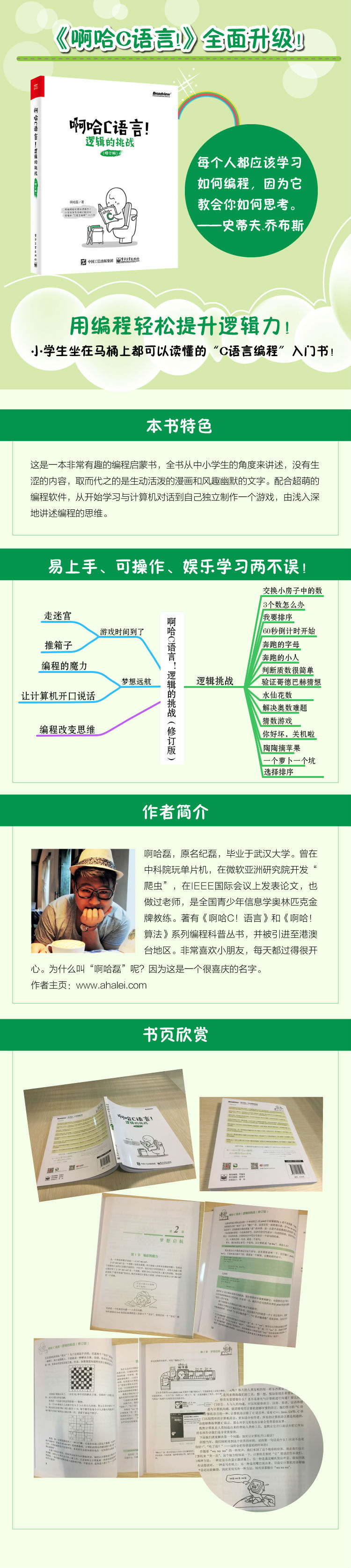 《啊哈C语言!逻辑的挑战(修订版)》是一本非常有趣的编程启蒙书,《啊哈C语言!逻辑的挑战(修订版)》从中小学生的角度来讲述,没有生涩的内容,取而代之的是生动活泼的漫画和风趣幽默的文字。配合超萌的编程软件,《啊哈C语言!逻辑的挑战(修订版)》从开始学习与计算机对话到自己独立制作一个游戏,由浅入深地讲述编程的思维。同时,与计算机展开的逻辑较量一定会让你觉得很有意思。你可以在茶余饭后阅读《啊哈C语言!逻辑的挑战(修订版)》,甚至坐在马桶上也可以看得津津有味。编程将会改变我们的思维,教会我们如何思考,让我们的思维插上计算机的翅膀,以一种全新的方式来感知世界。