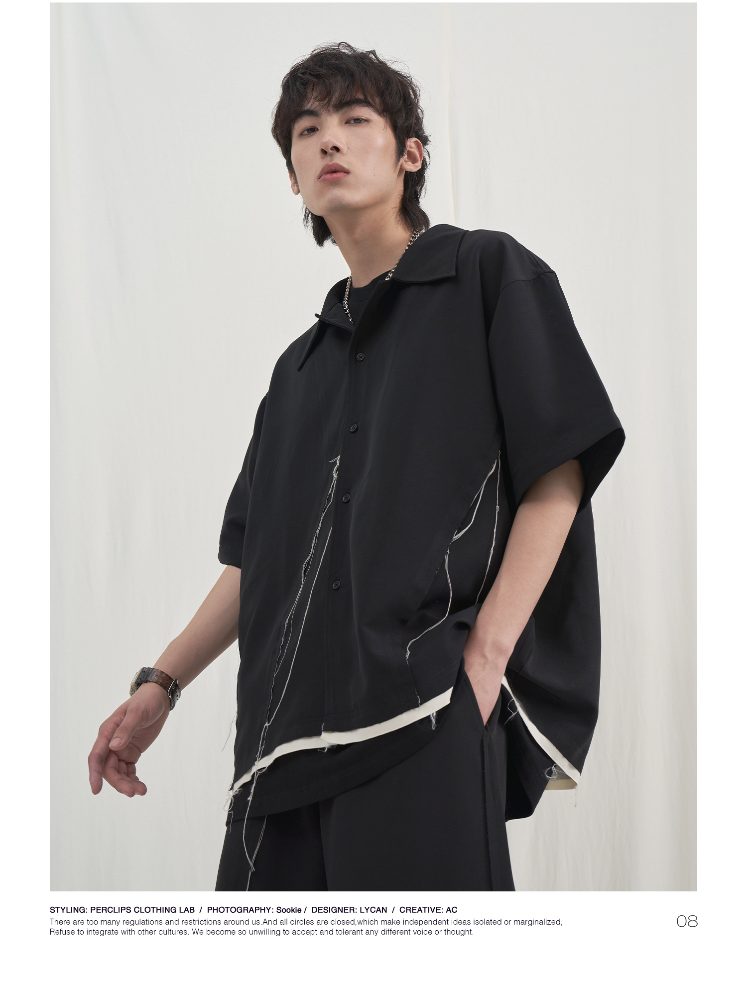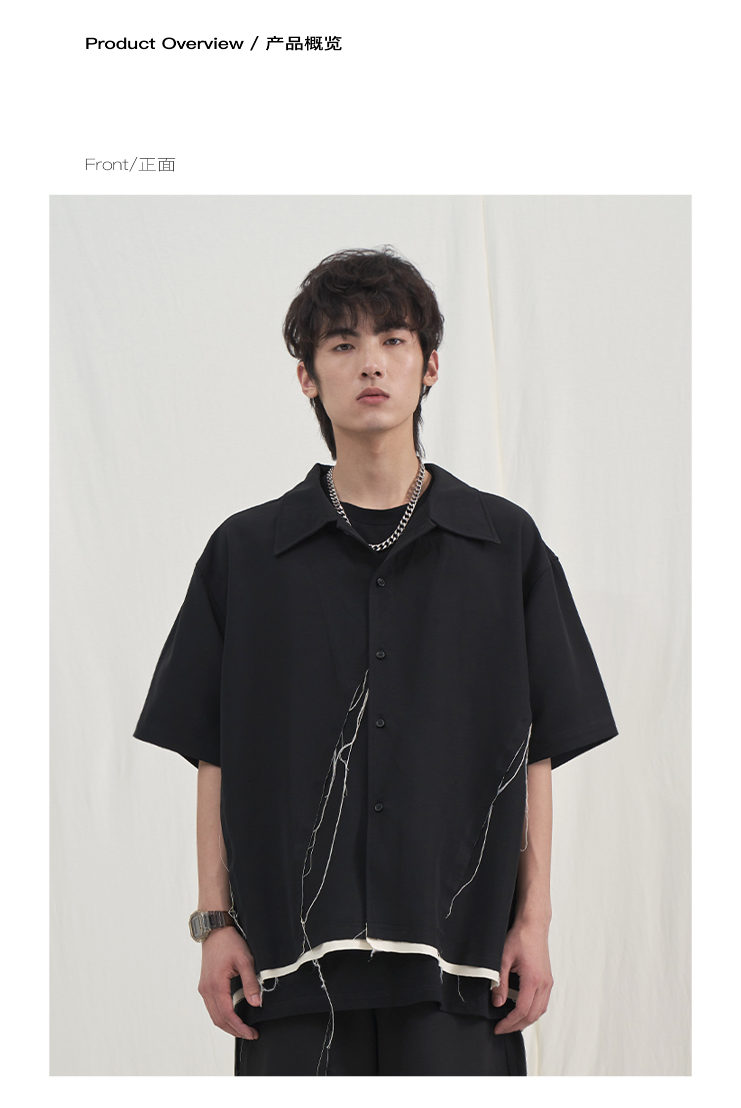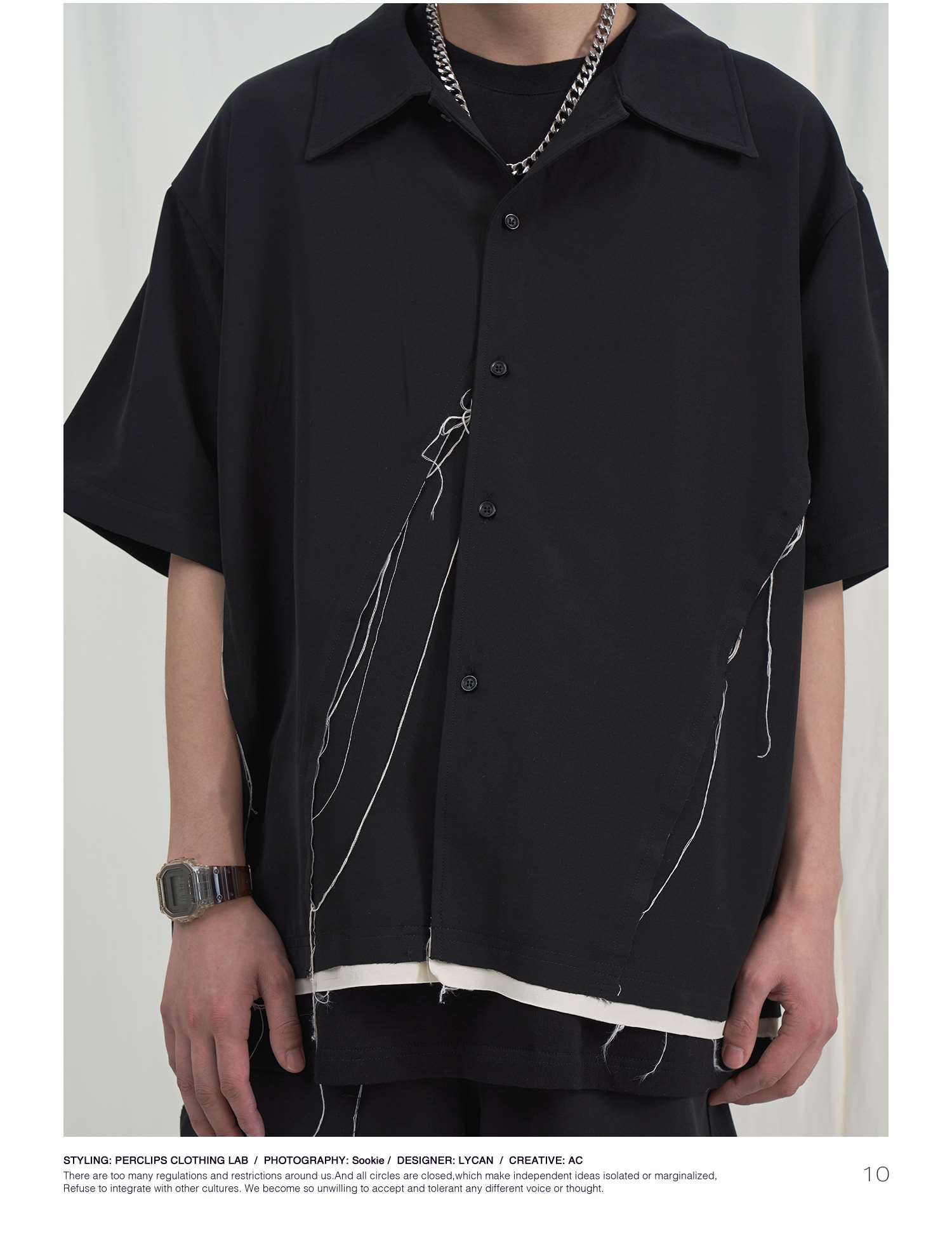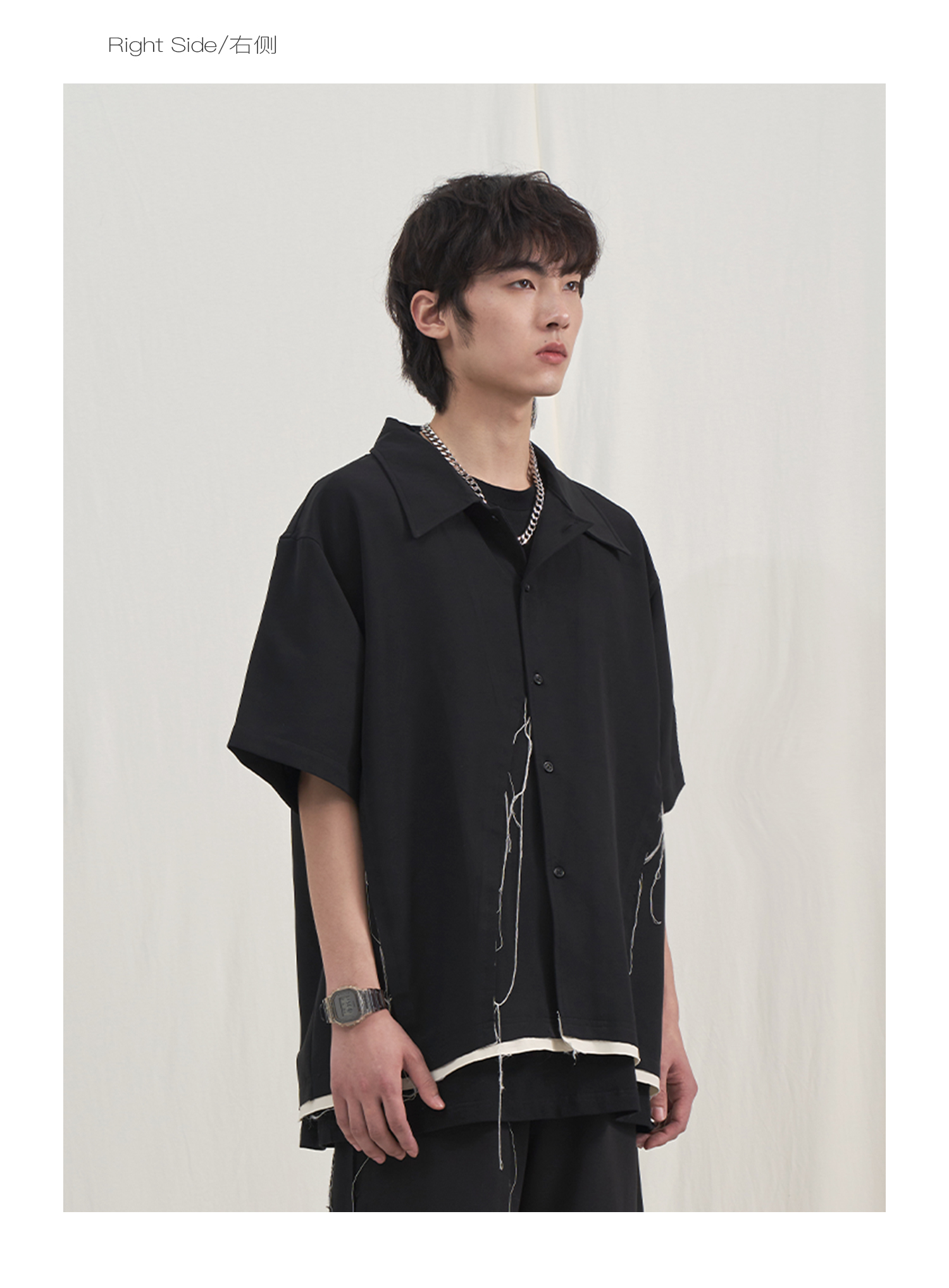 PCLP(PERCLIPS) 毛边破坏短袖衬衫国潮牌黑色休闲夏季半袖衬衣男