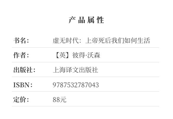 不可错过彼得•沃森所著的《虚无时代》,这本565页的书明快地讲述了上帝从西方文化中发生的位置变转与替代。