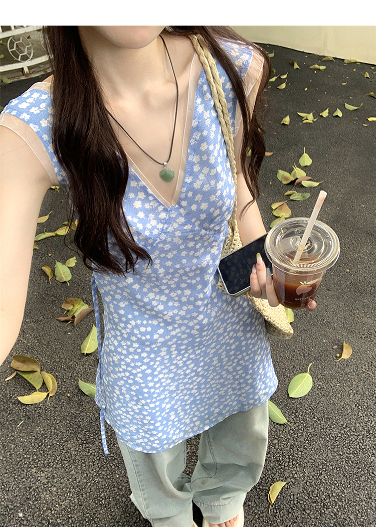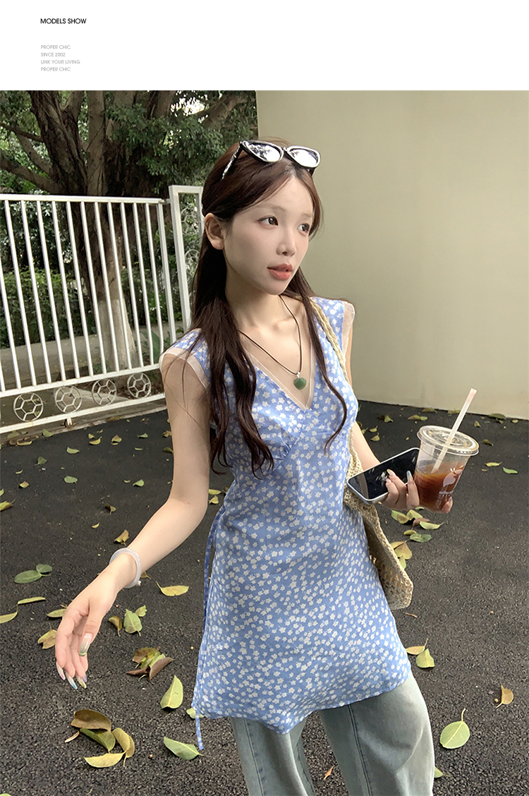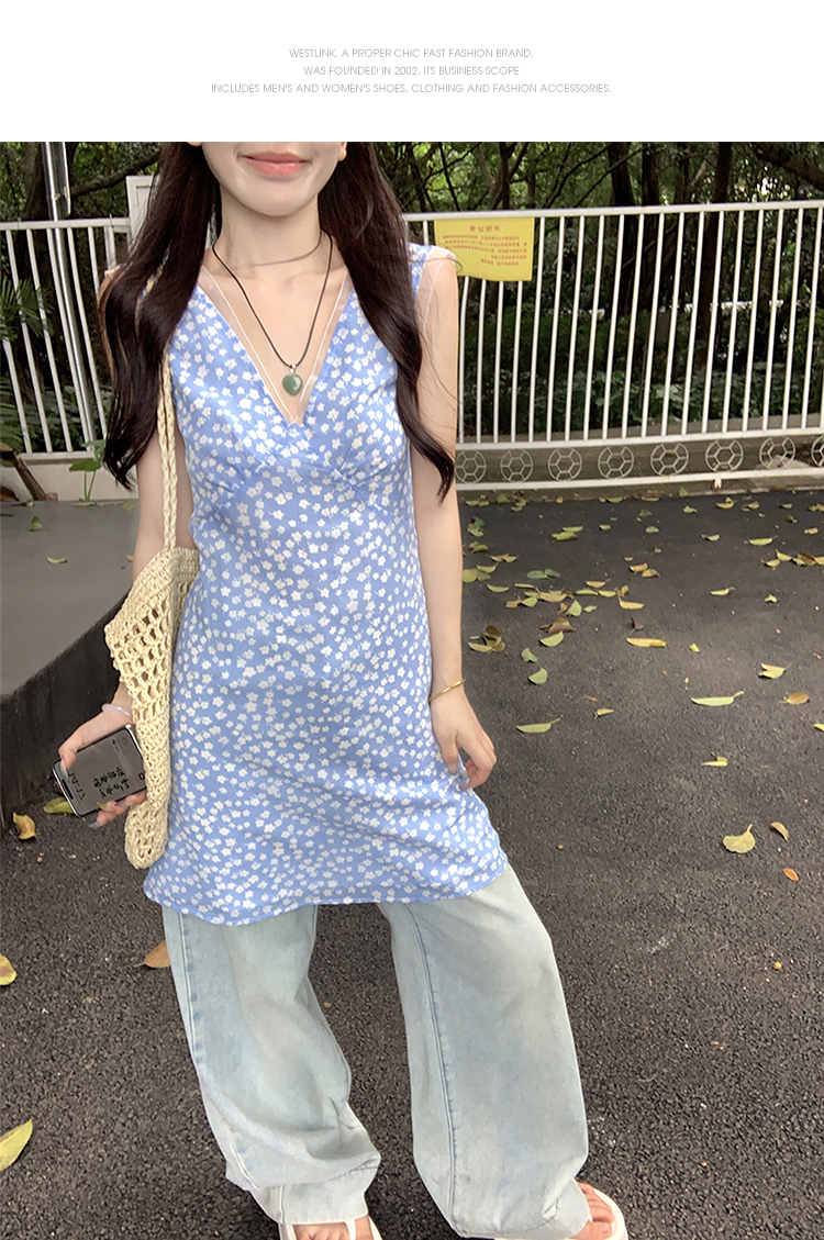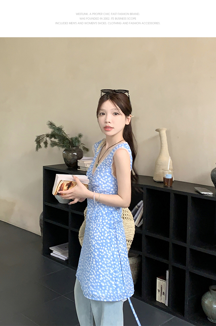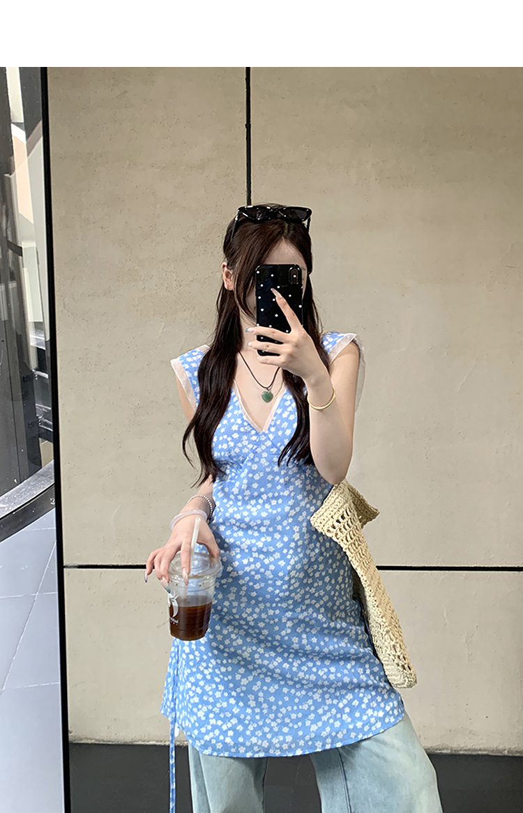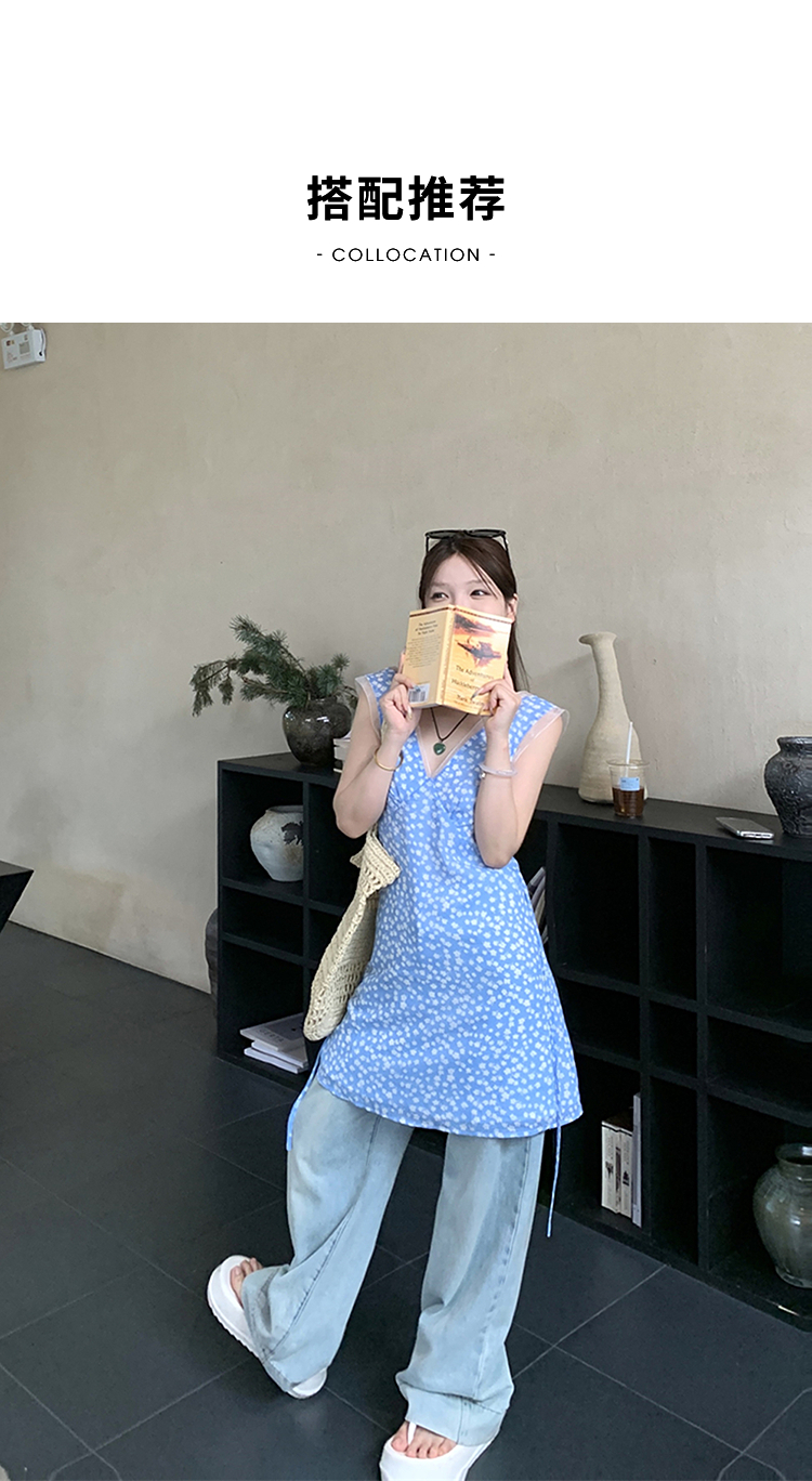 西遇波点衬衫上衣女夏季新款叠穿连衣裙收腰蓝色v领罩衫SS050460