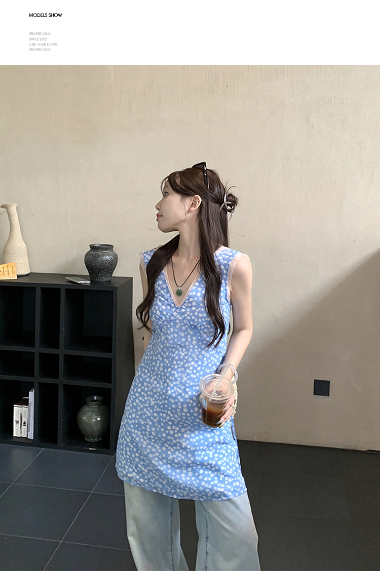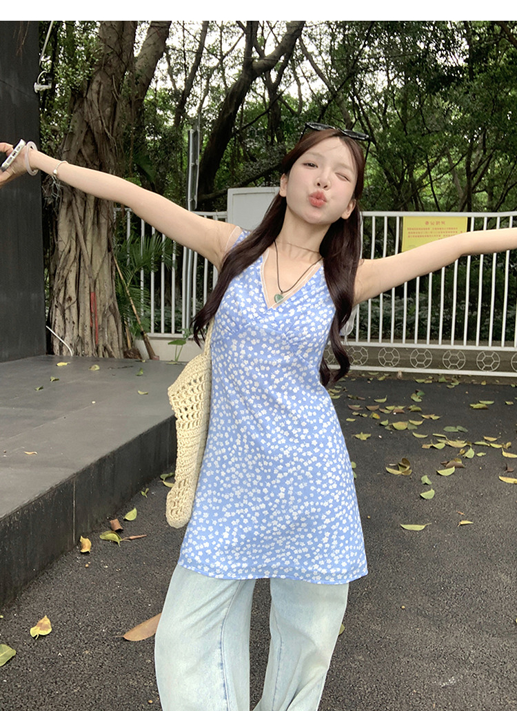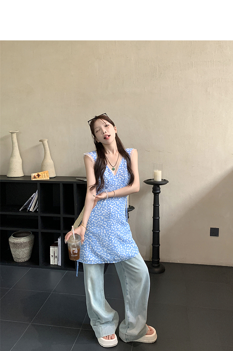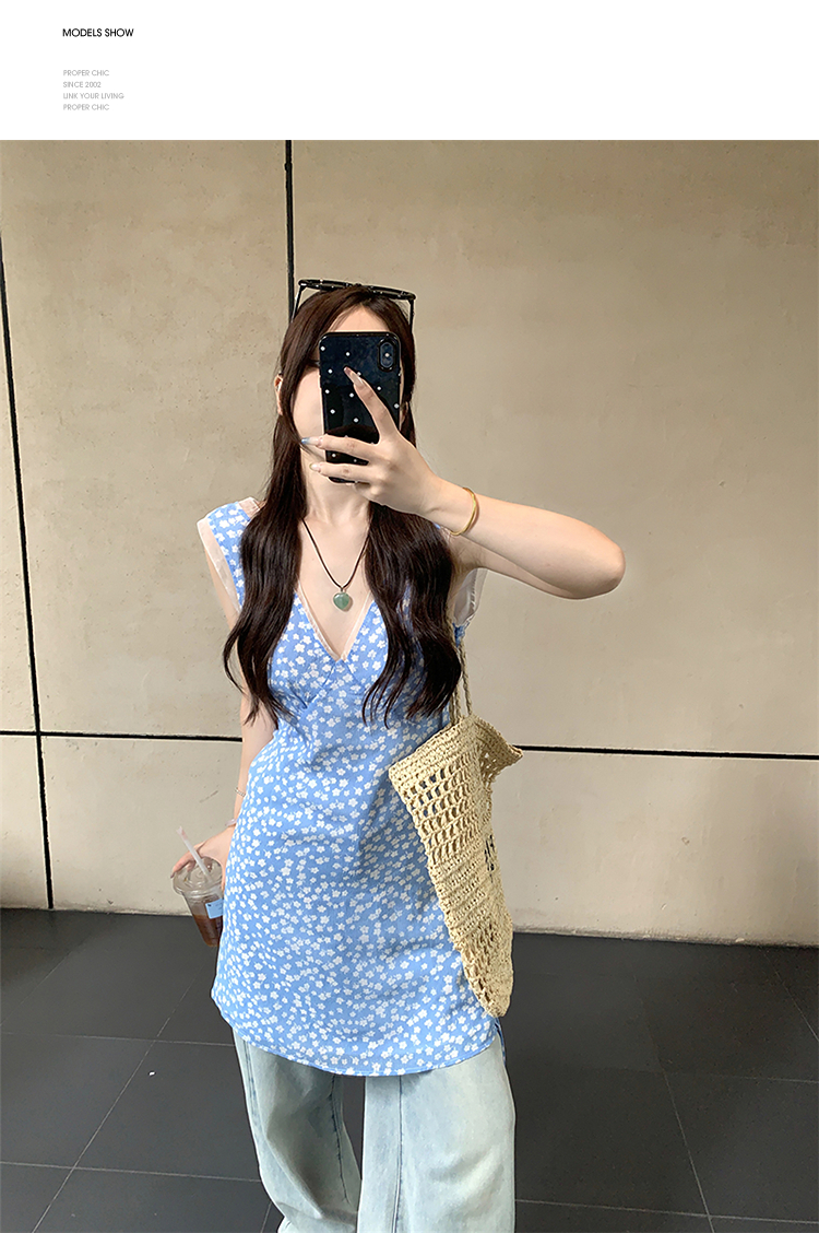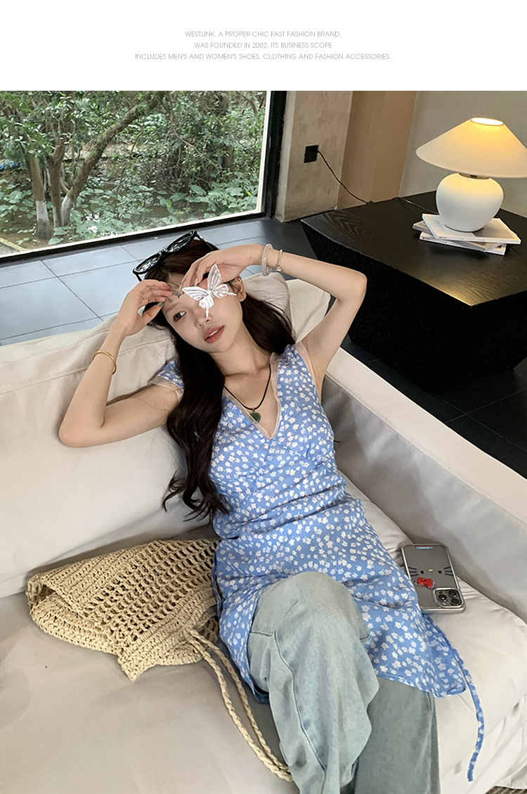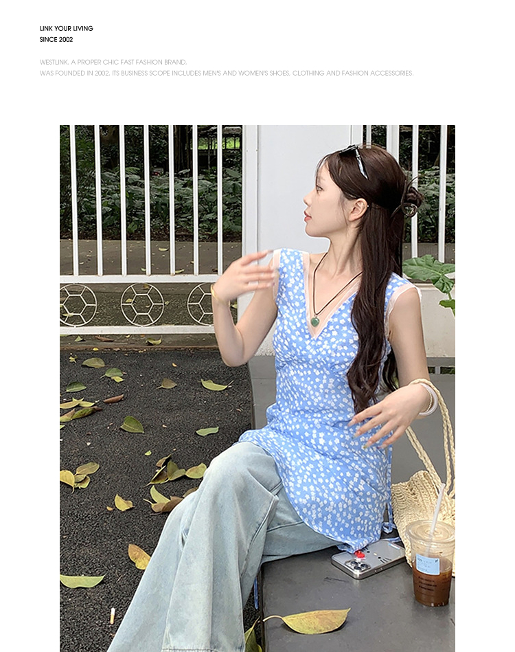 西遇波点衬衫上衣女夏季新款叠穿连衣裙收腰蓝色v领罩衫SS050460