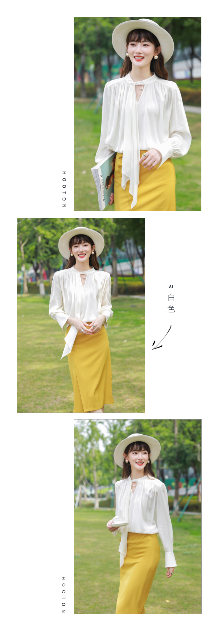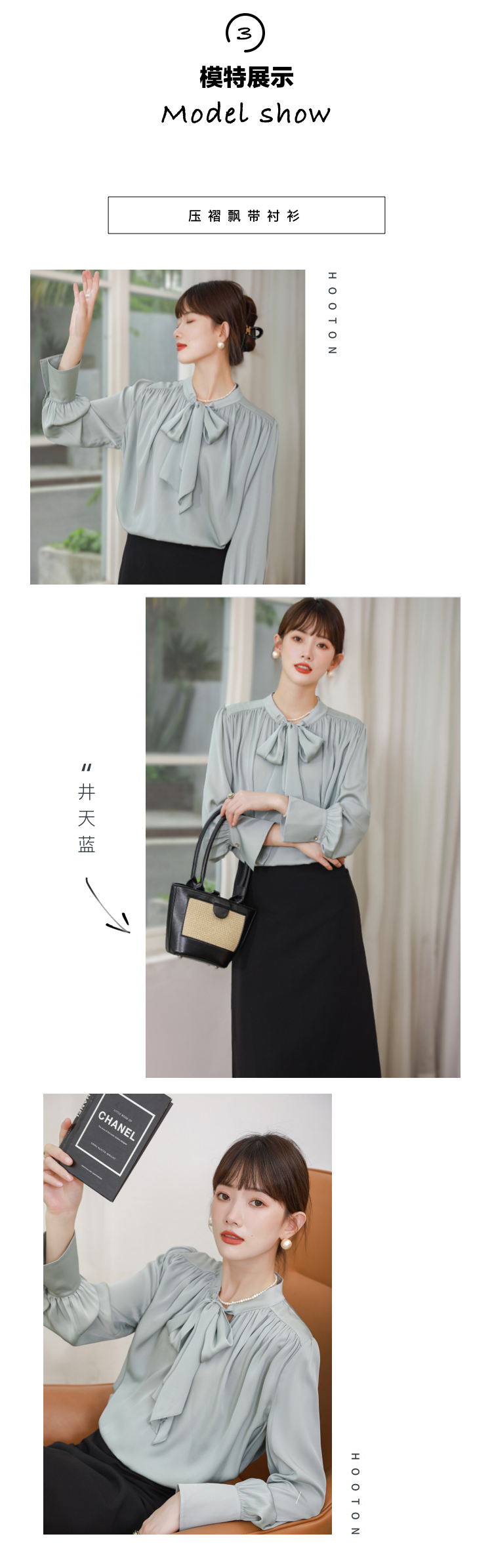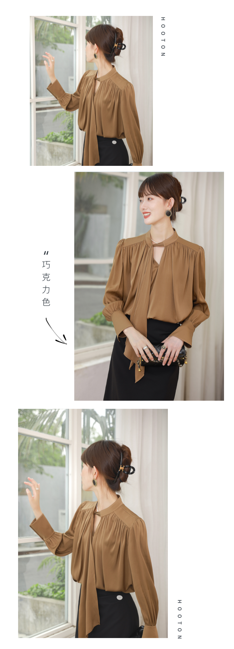 【产品卖点】这其实是一款非常经典的飘带款式,大身属于廓形款,配合双乔面料的光色感,整体会有种非常高级的感觉,加上领子错位锁眼,可以穿插飘带,又有细节又年轻,非常不挑人。选的颜色也非常有质感,有带有金属感的巧克力色,也有高级的乳白色,更有清透的井天蓝,选择非常多,年龄段跨越度也很广,是一款名副其实的好卖款