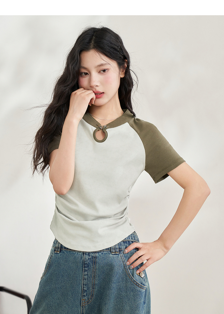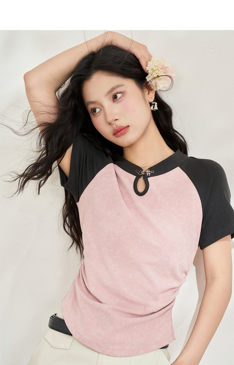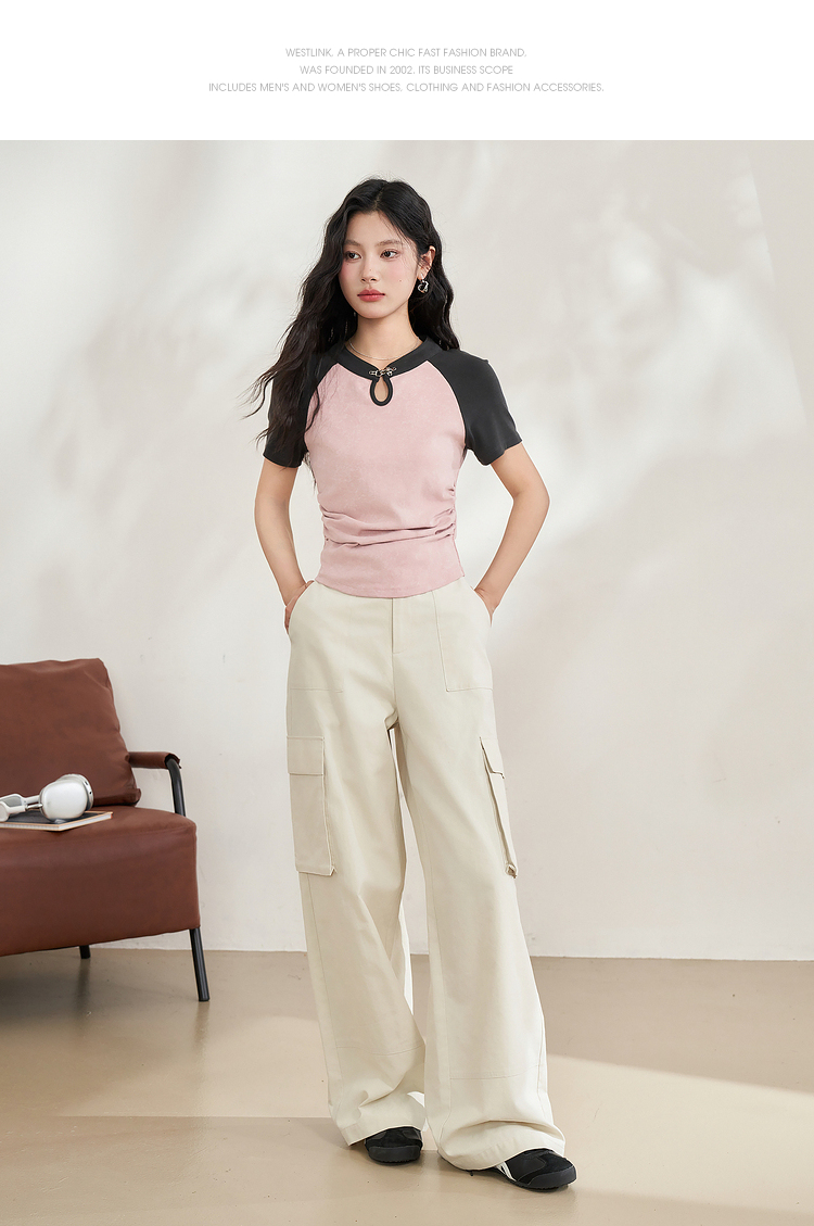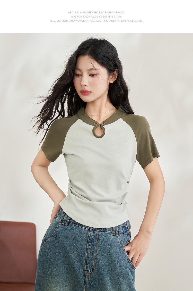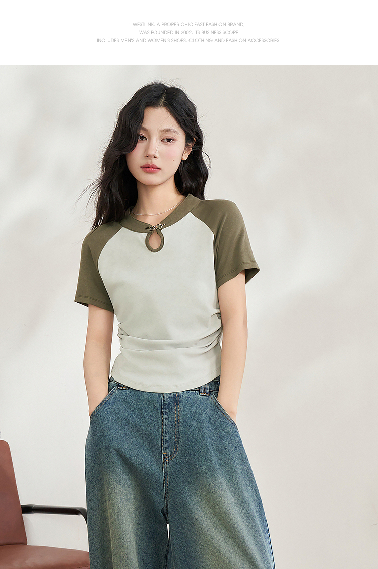 西遇新中式立领插肩袖短袖女新款褶皱抽绳显瘦短款T恤10540180/V0050548