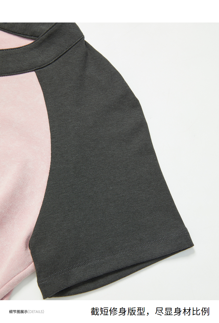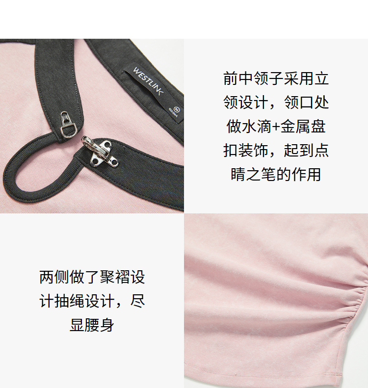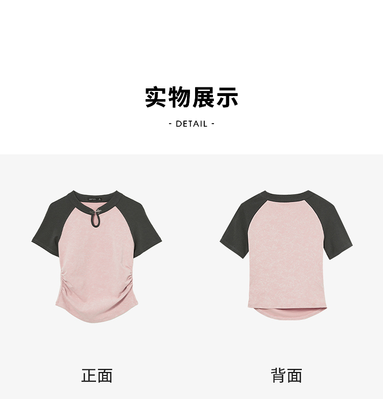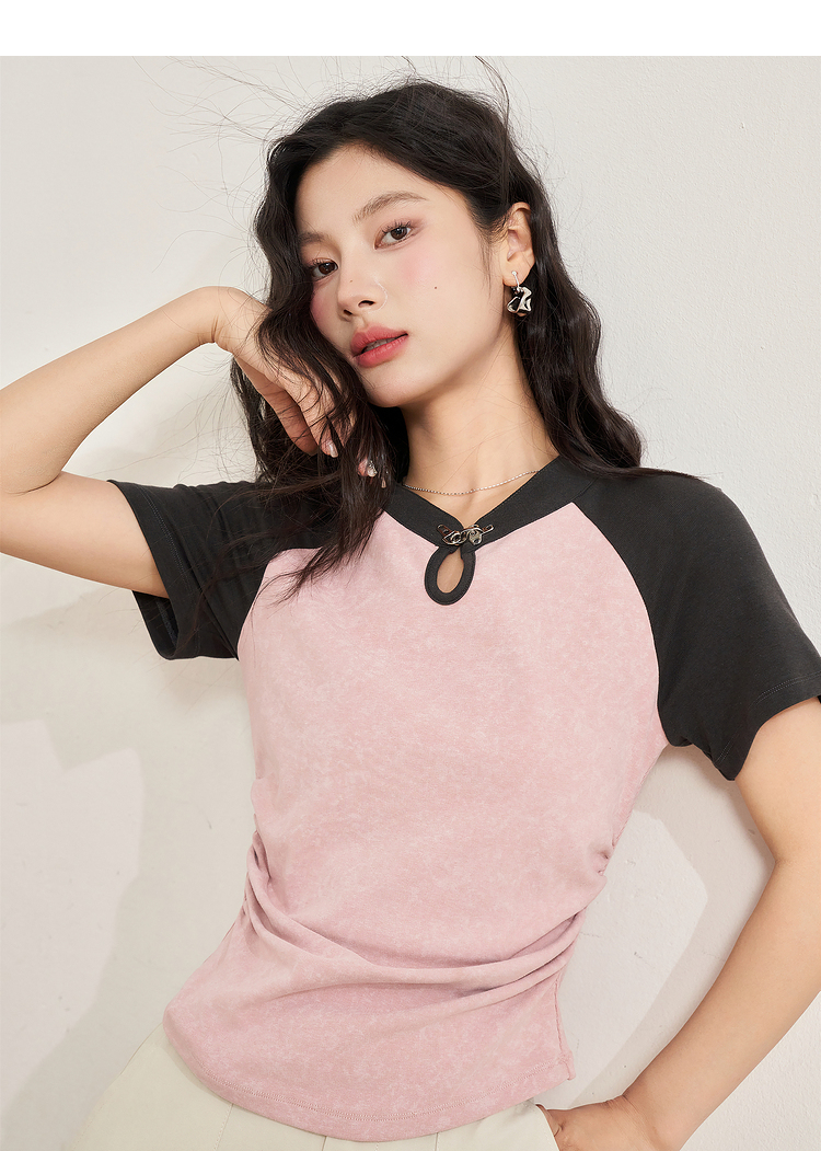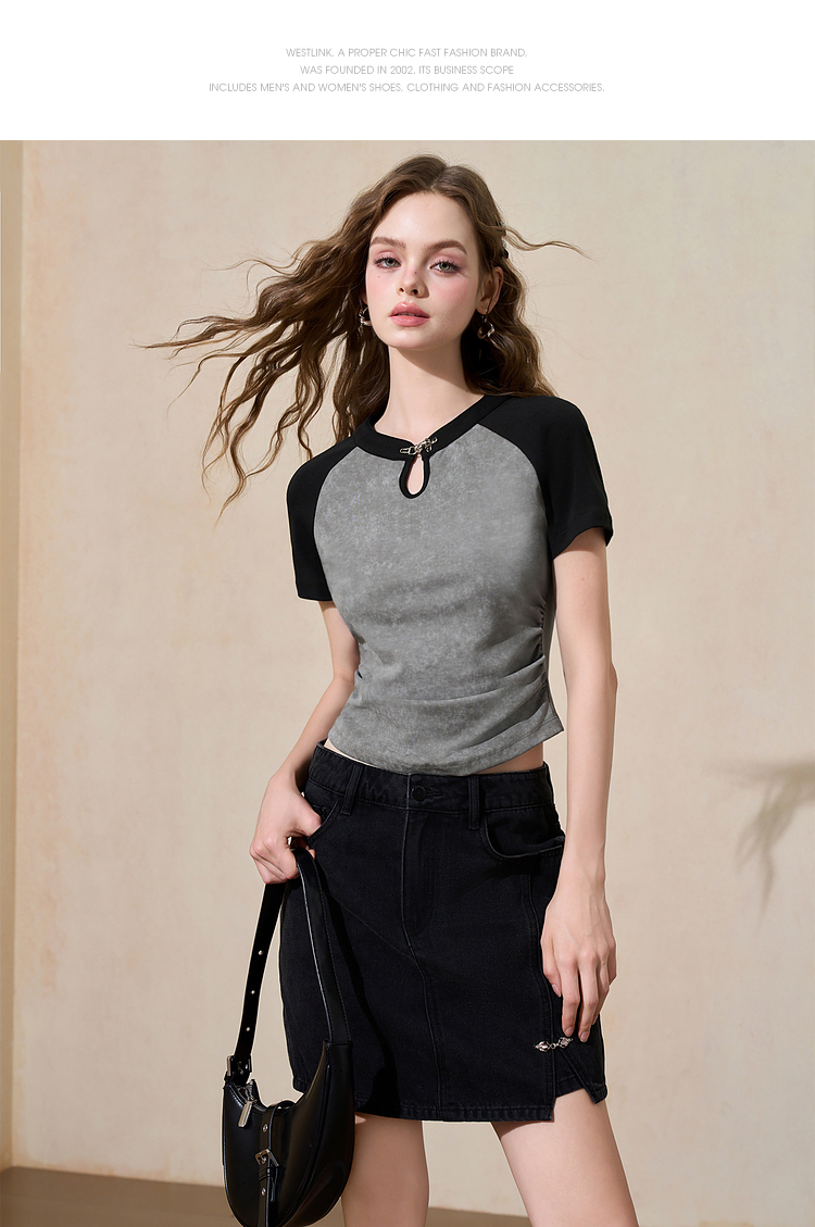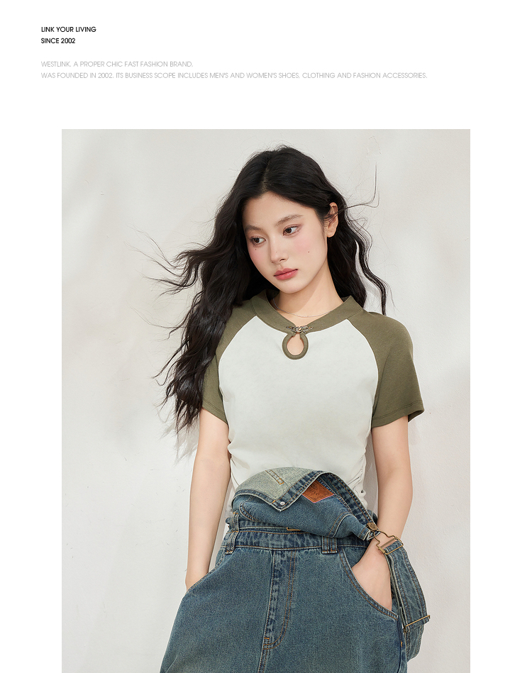 西遇新中式立领插肩袖短袖女新款褶皱抽绳显瘦短款T恤10540180/V0050548