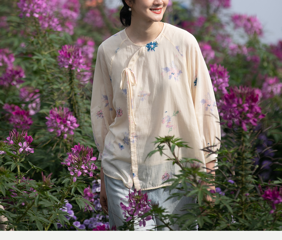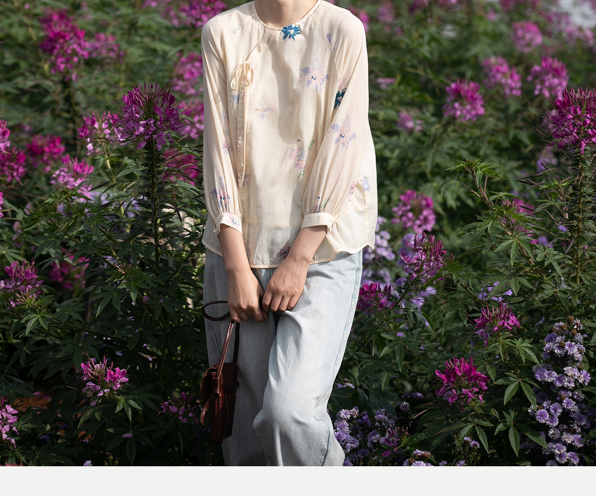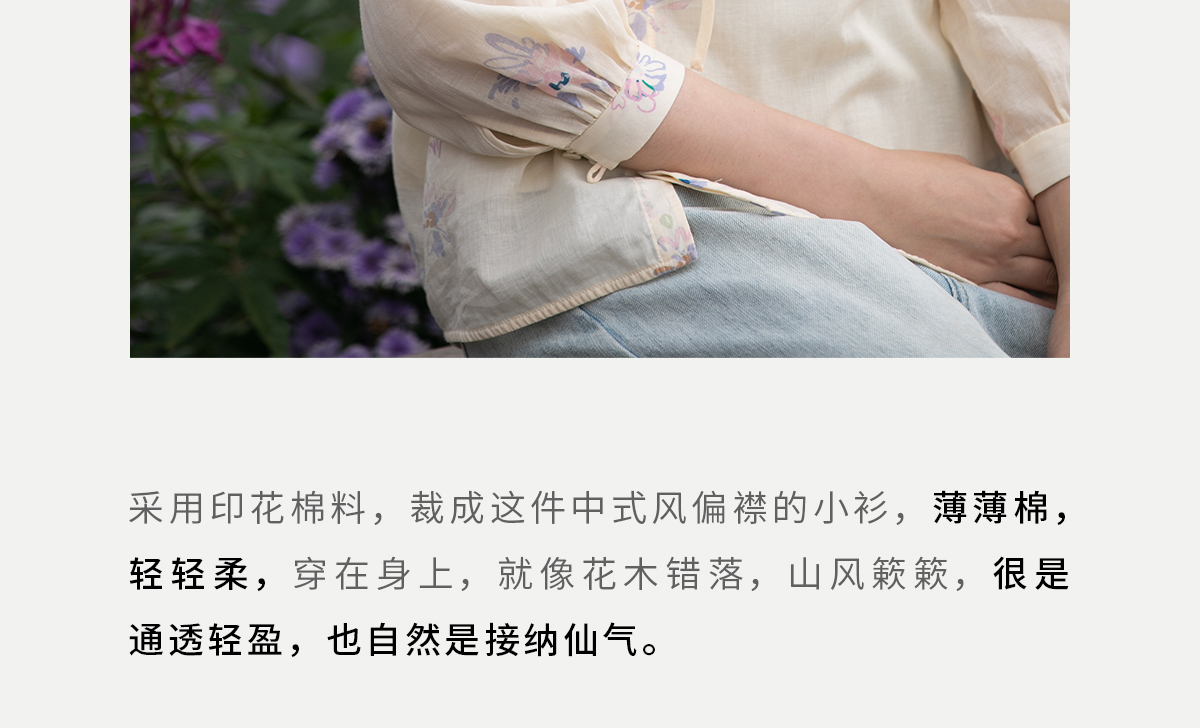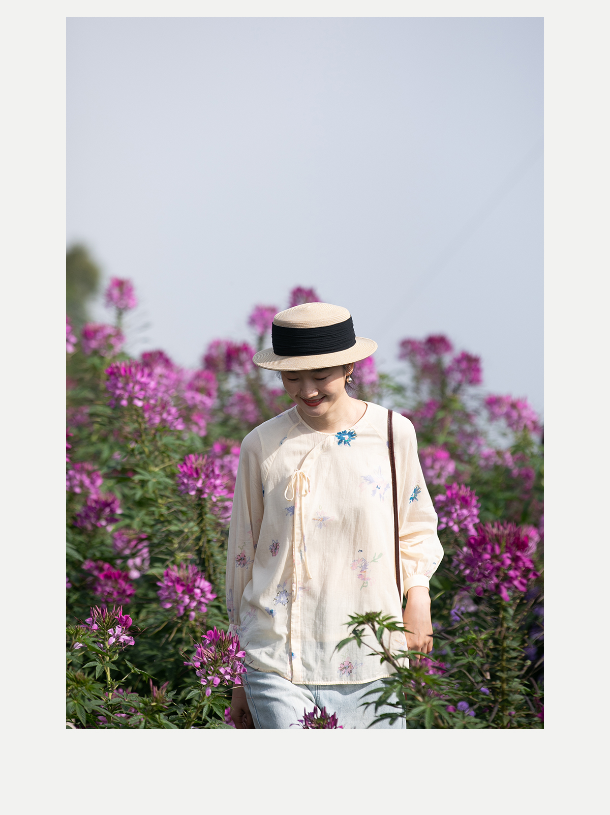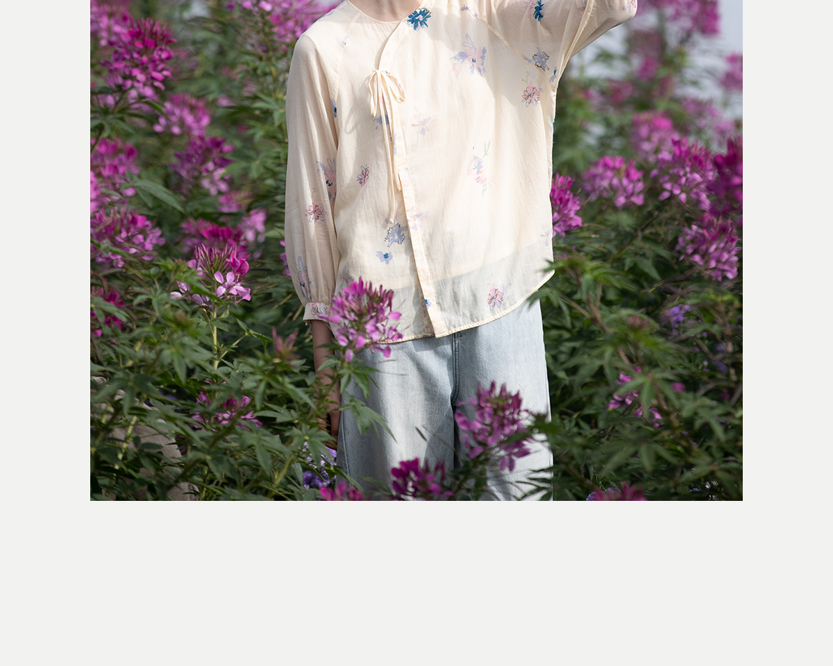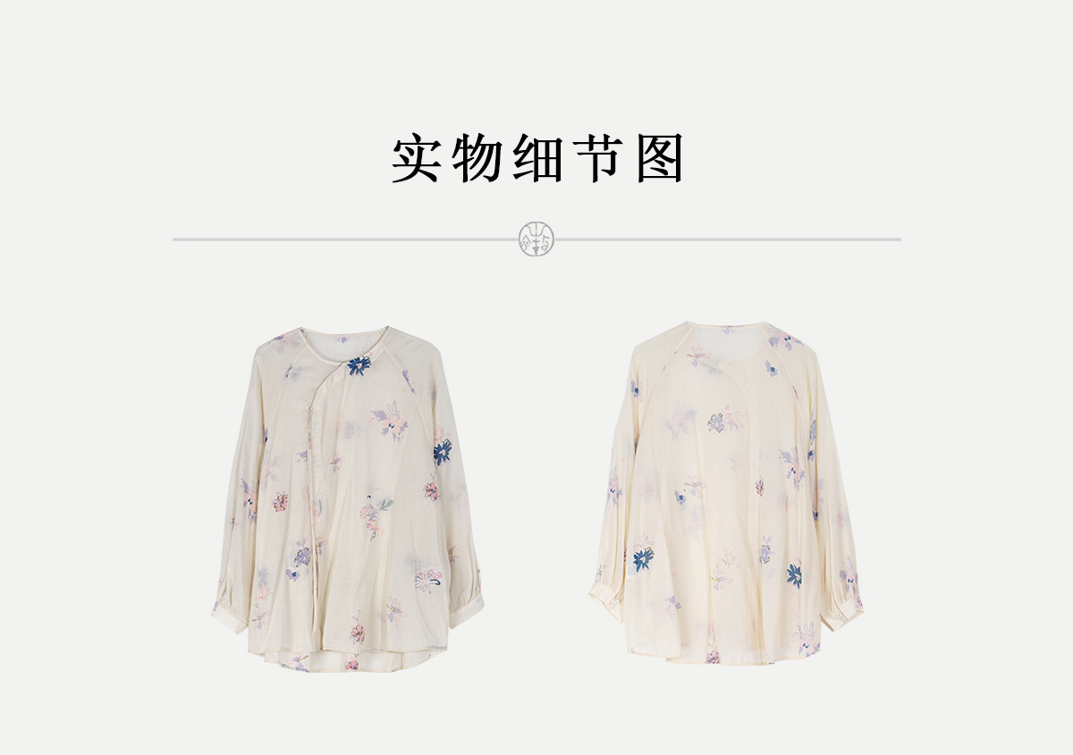 牧衣游原创 印花精棉衬衫女新款纯棉轻薄文艺偏襟中式风小衫 清浅