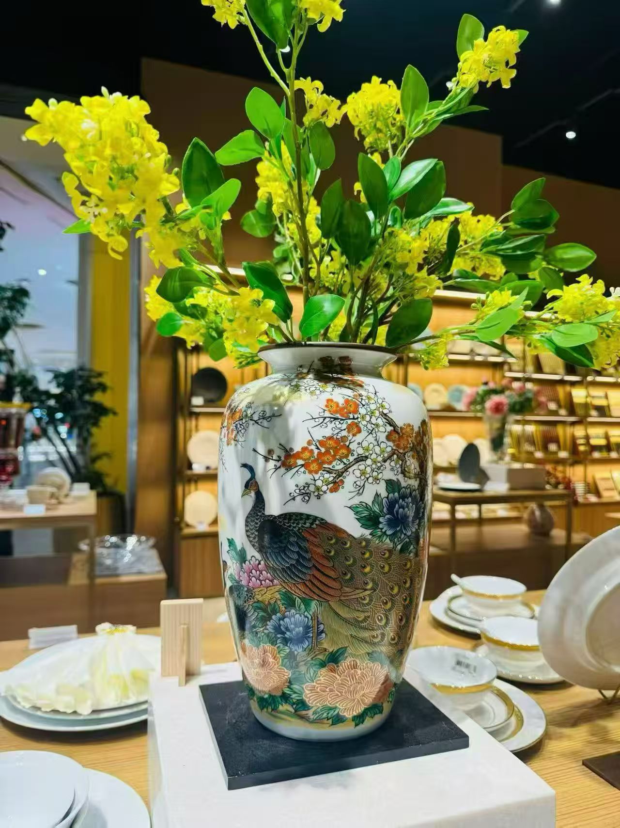 九谷烧10号花瓶牡丹与孔雀(带底座)花瓶花器流行礼30.5cm