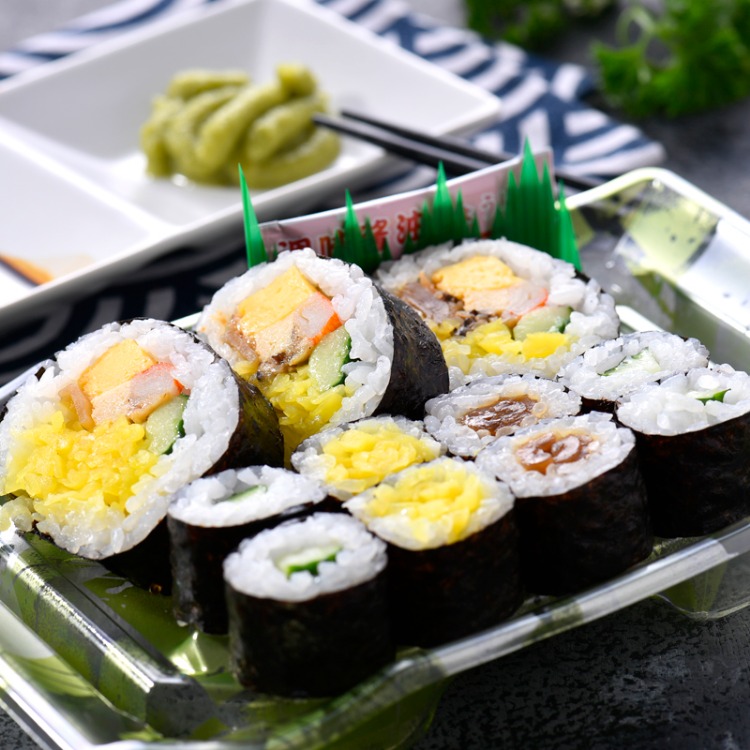 "寿司组合/盒约200g 原料生长地:【非海产品】越光米-辽宁丹东;切丝大根-辽宁;干瓢丝-山东;黄瓜-成都【海产品】卷芯-莱西市"