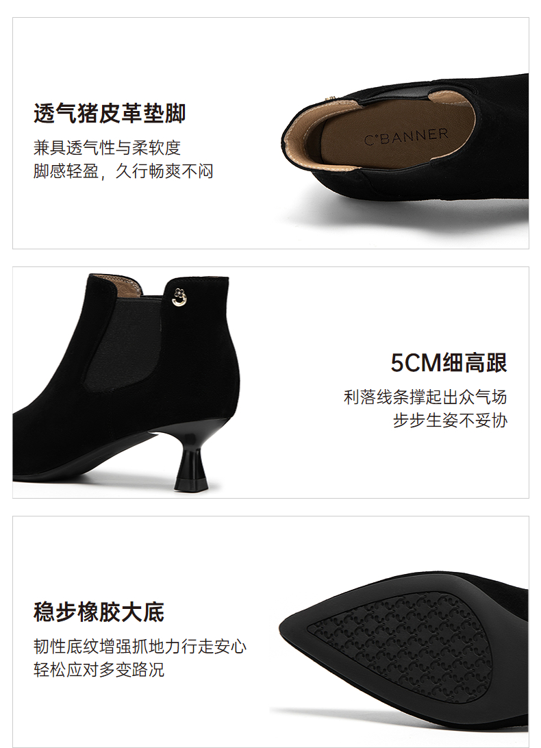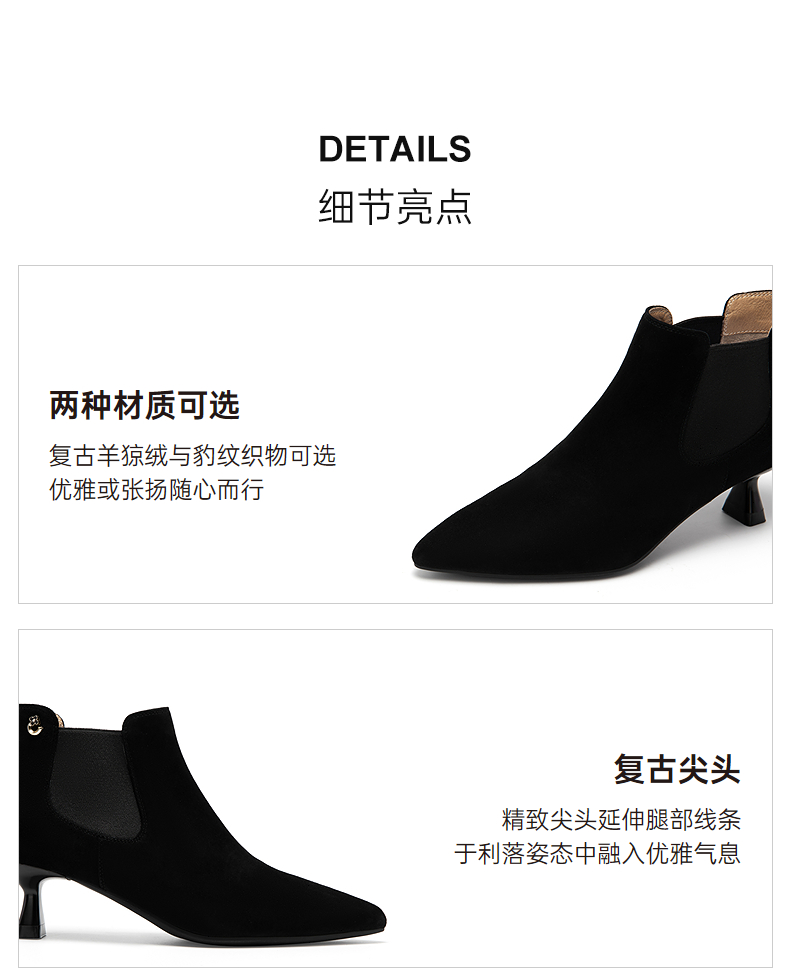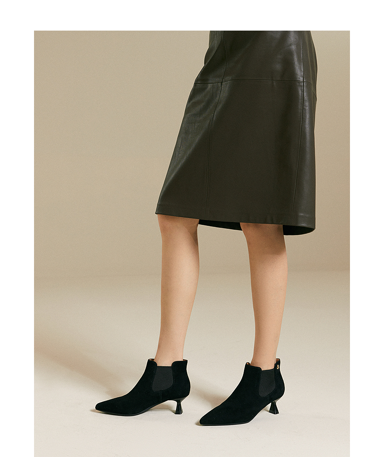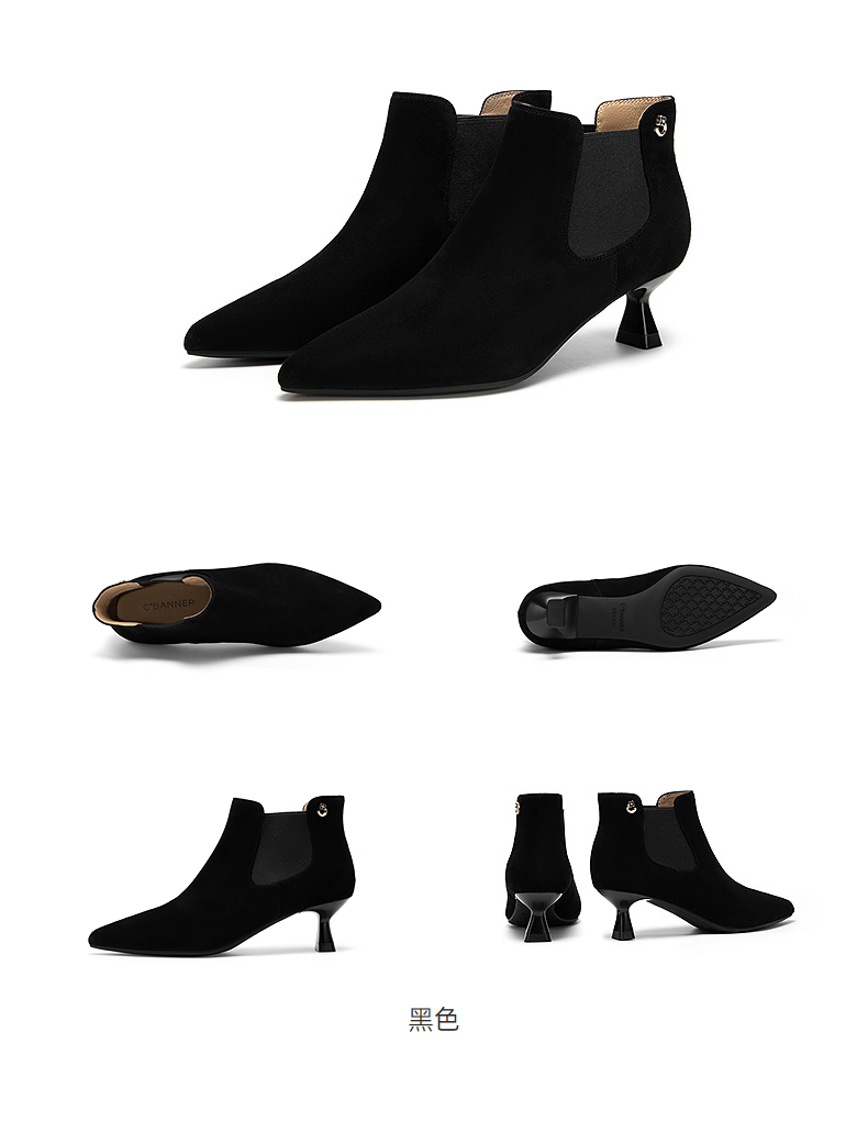 千百度复古尖头中跟时装靴女气质细高跟通勤踝靴A25586871