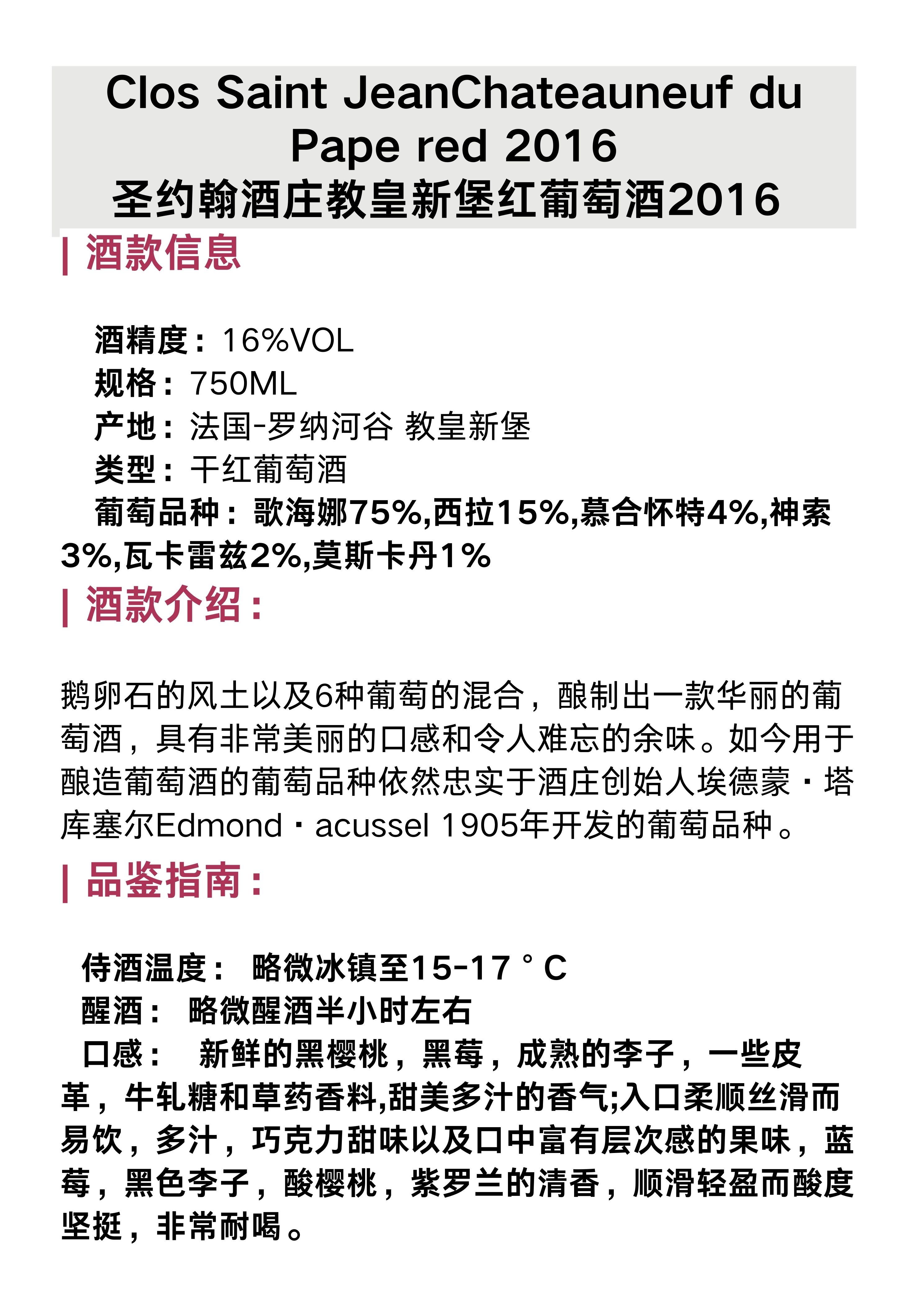 圣约翰酒庄教皇新堡红葡萄酒2016 Chateauneuf du Pape red Clos Saint Jean2016