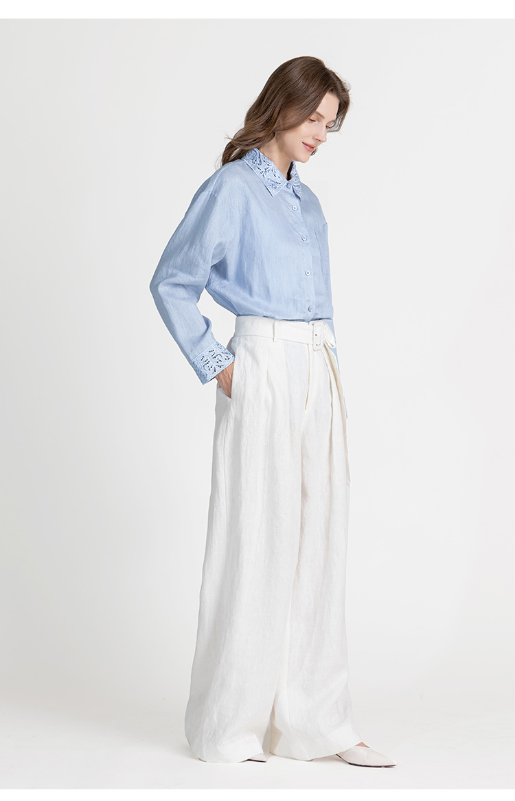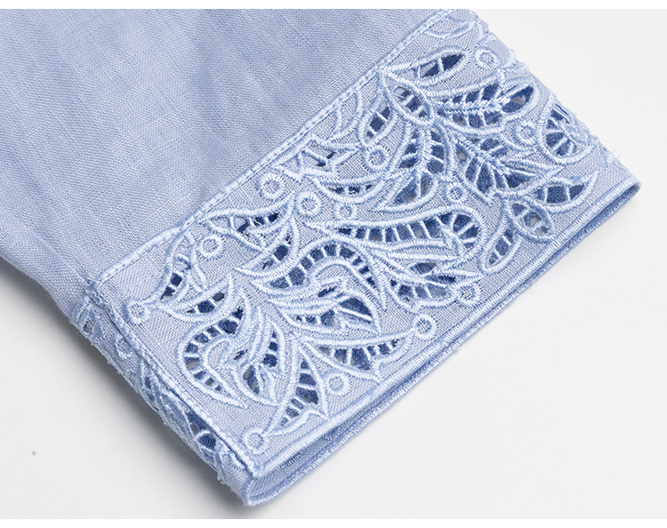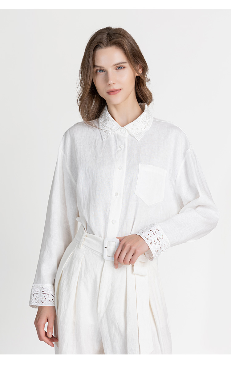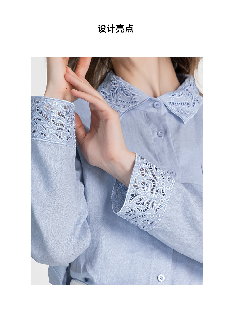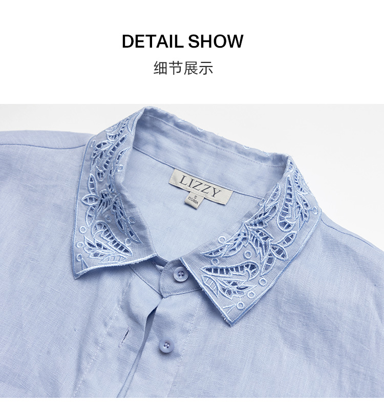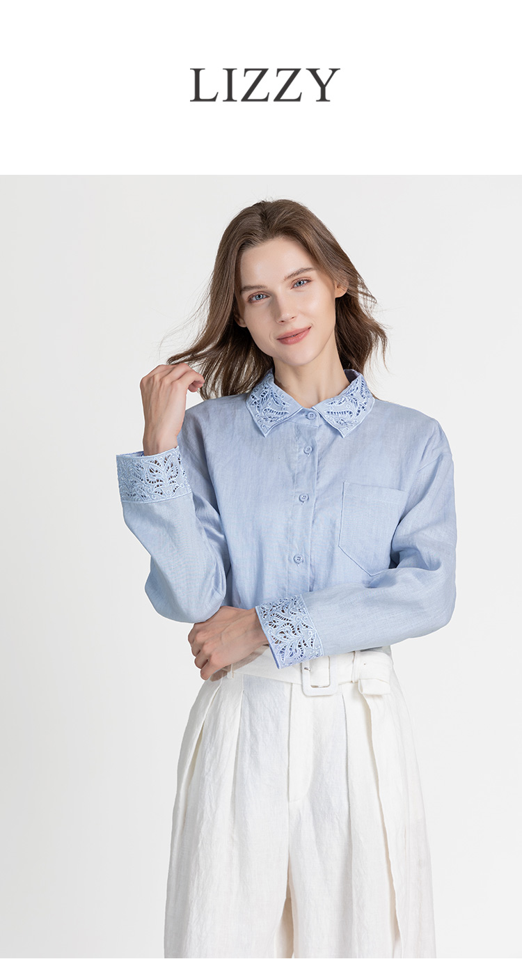 LIZZY春夏精致亚麻刺绣领百搭通勤长袖衬衣8132