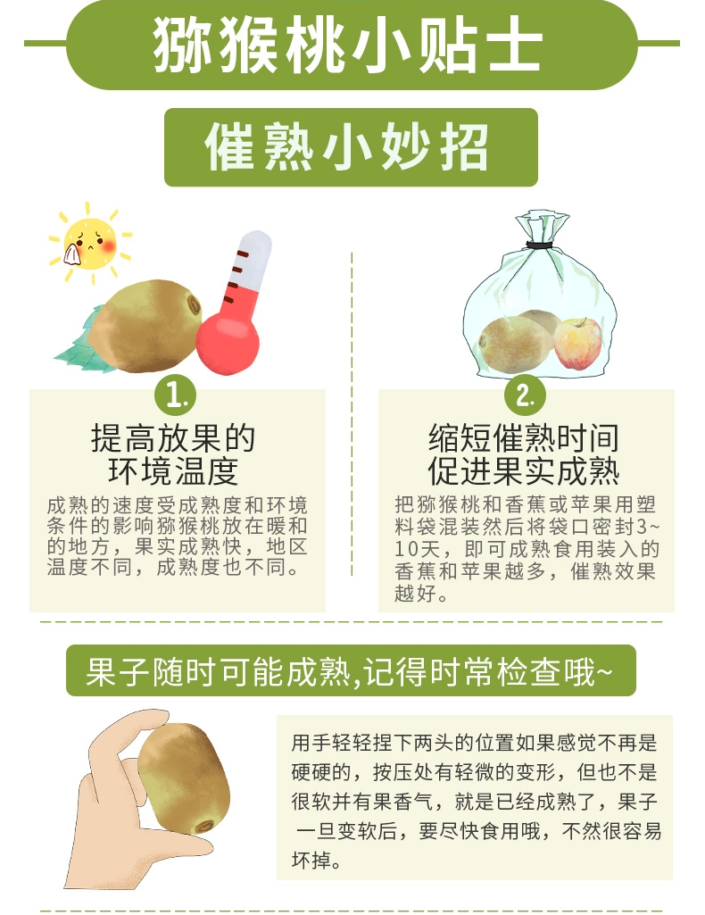 因软果在快递途中易损且不易储存,故寄出的猕猴桃均为硬果,需自行催熟后食用。(催熟方式见详情页描述)