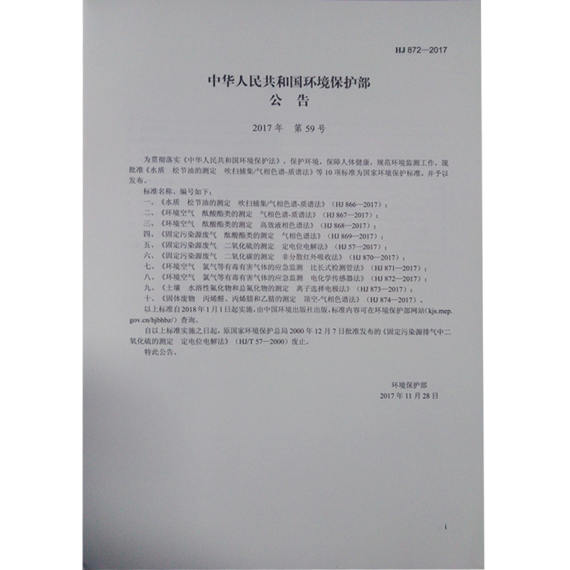 HJ872-2017 环境空气 氯气等有毒有害气体的应急监测 电化学传感器法