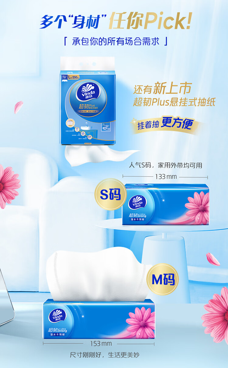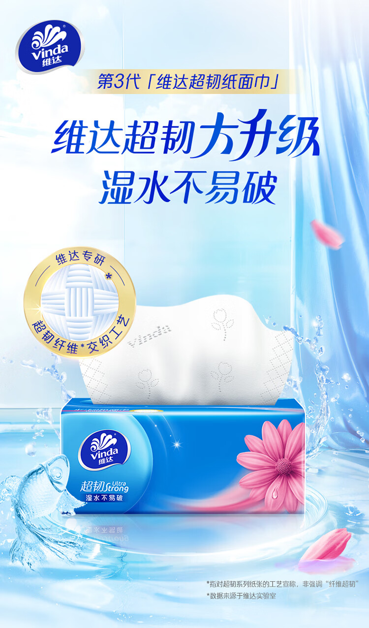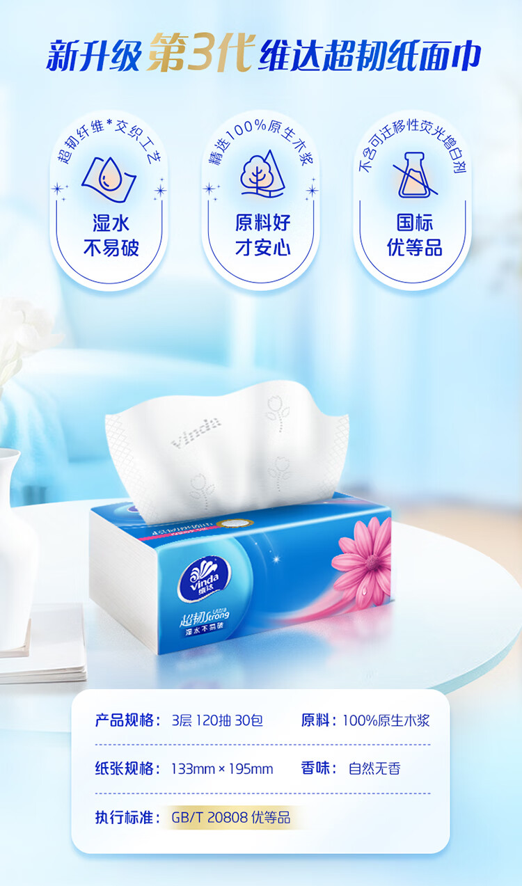 维达(Vinda)抽纸 超韧3层120抽*30包S码 大分量纸巾 卫生纸 餐巾纸 整箱