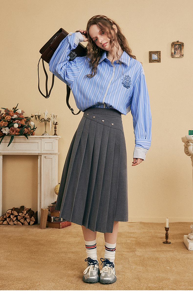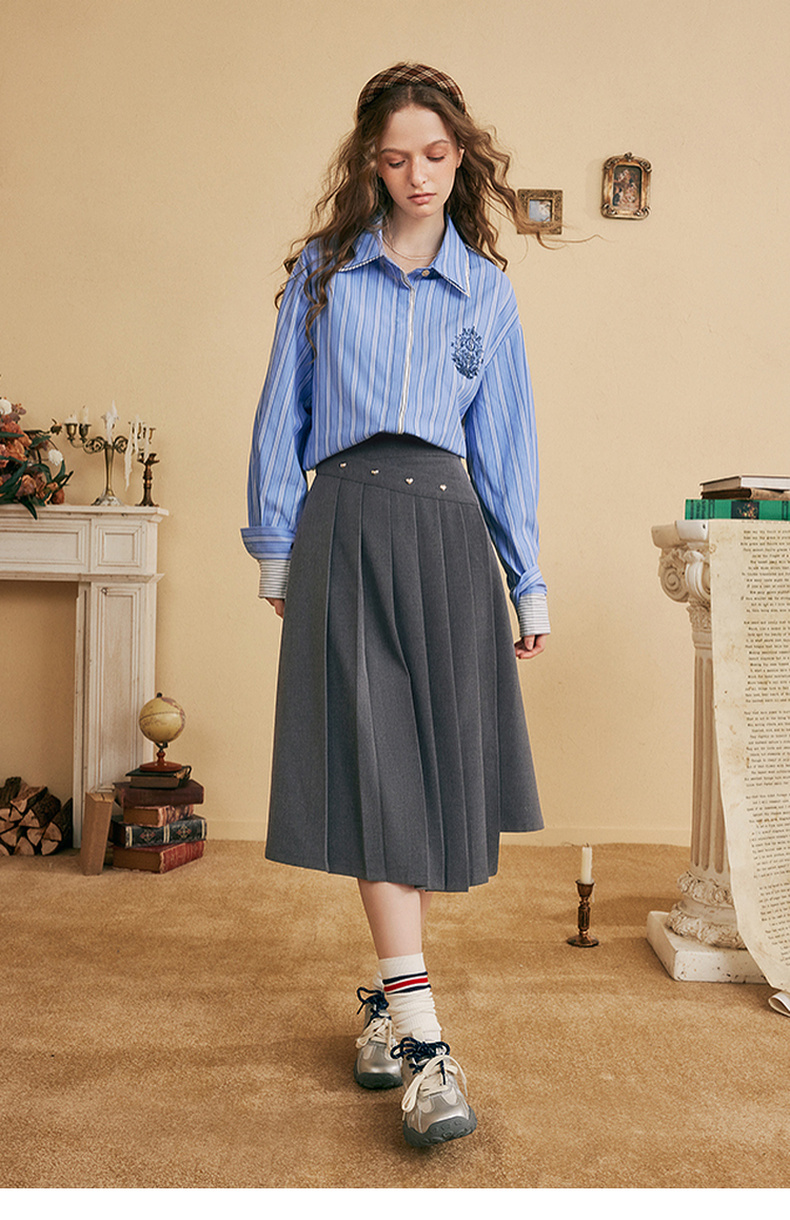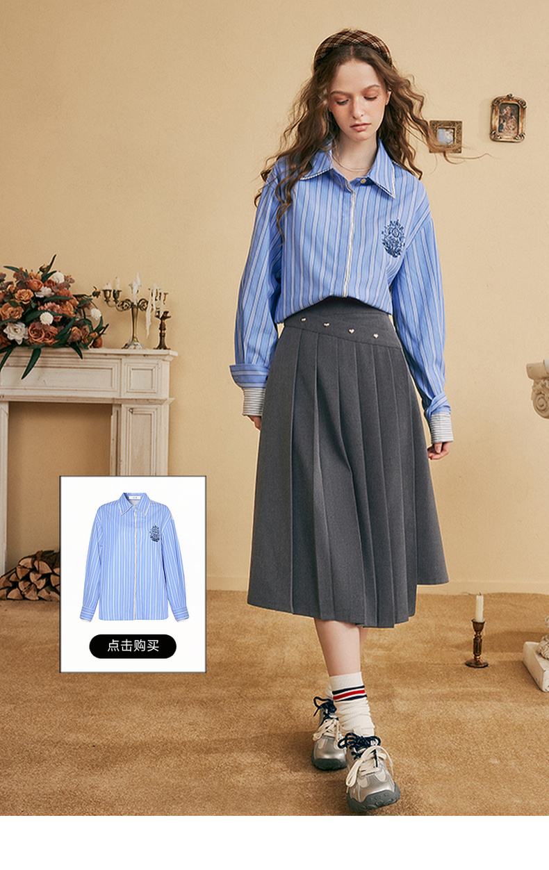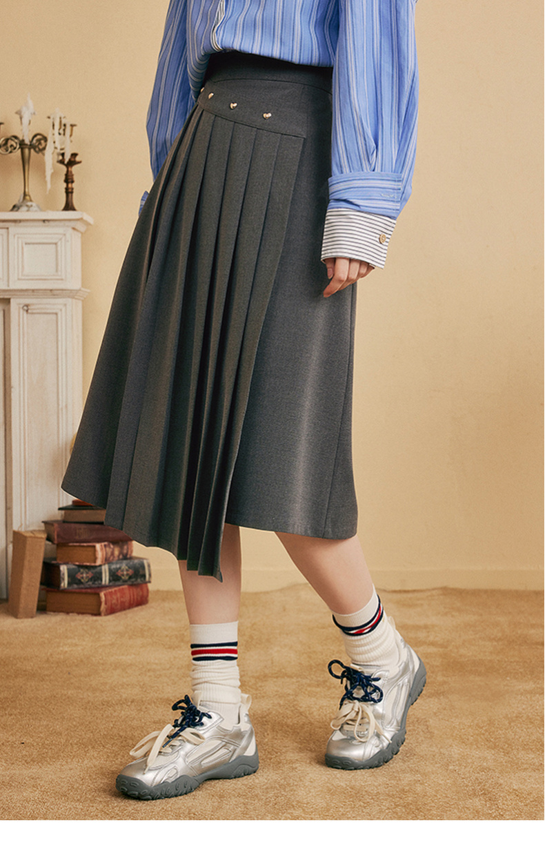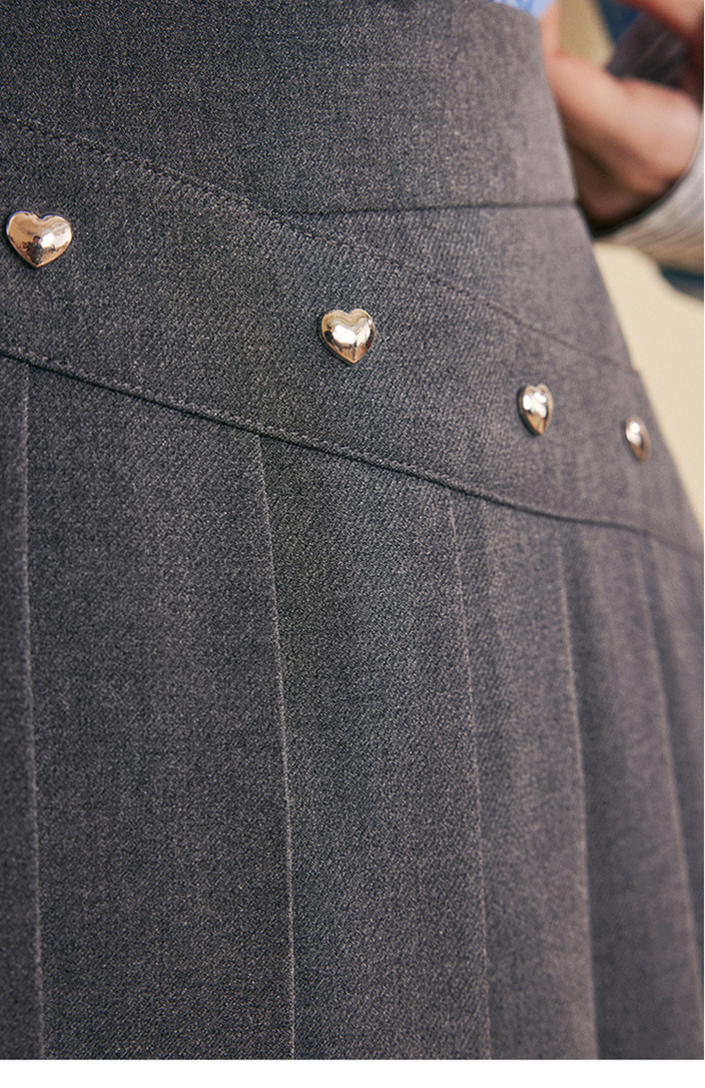 两三事书卷之旅2024秋季新款学院风爱心钉珠毛呢百褶裙高腰半身裙