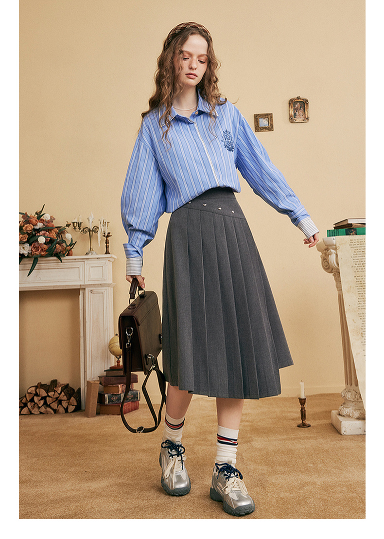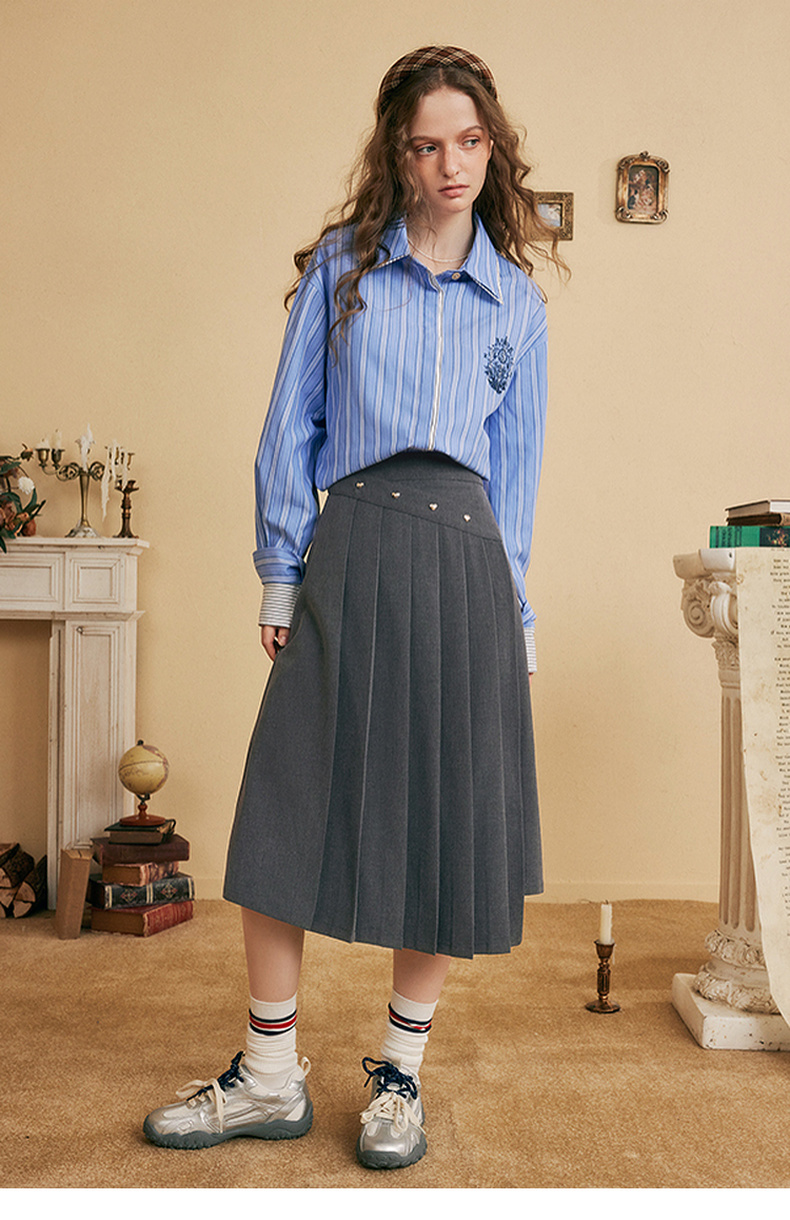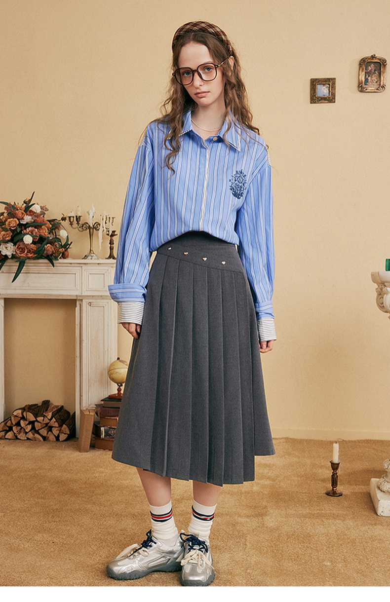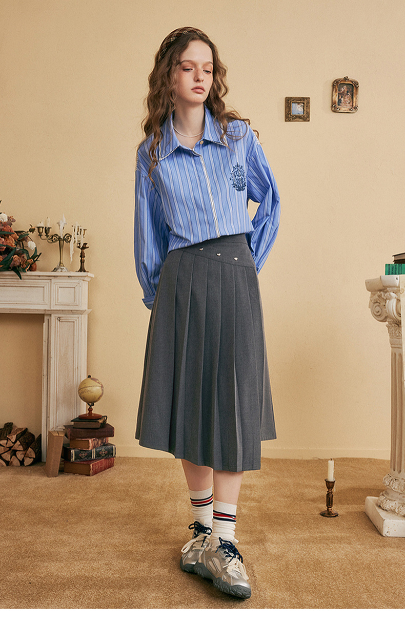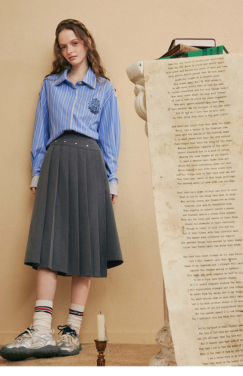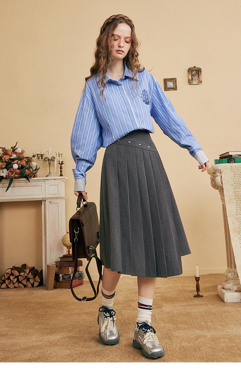 两三事书卷之旅2024秋季新款学院风爱心钉珠毛呢百褶裙高腰半身裙