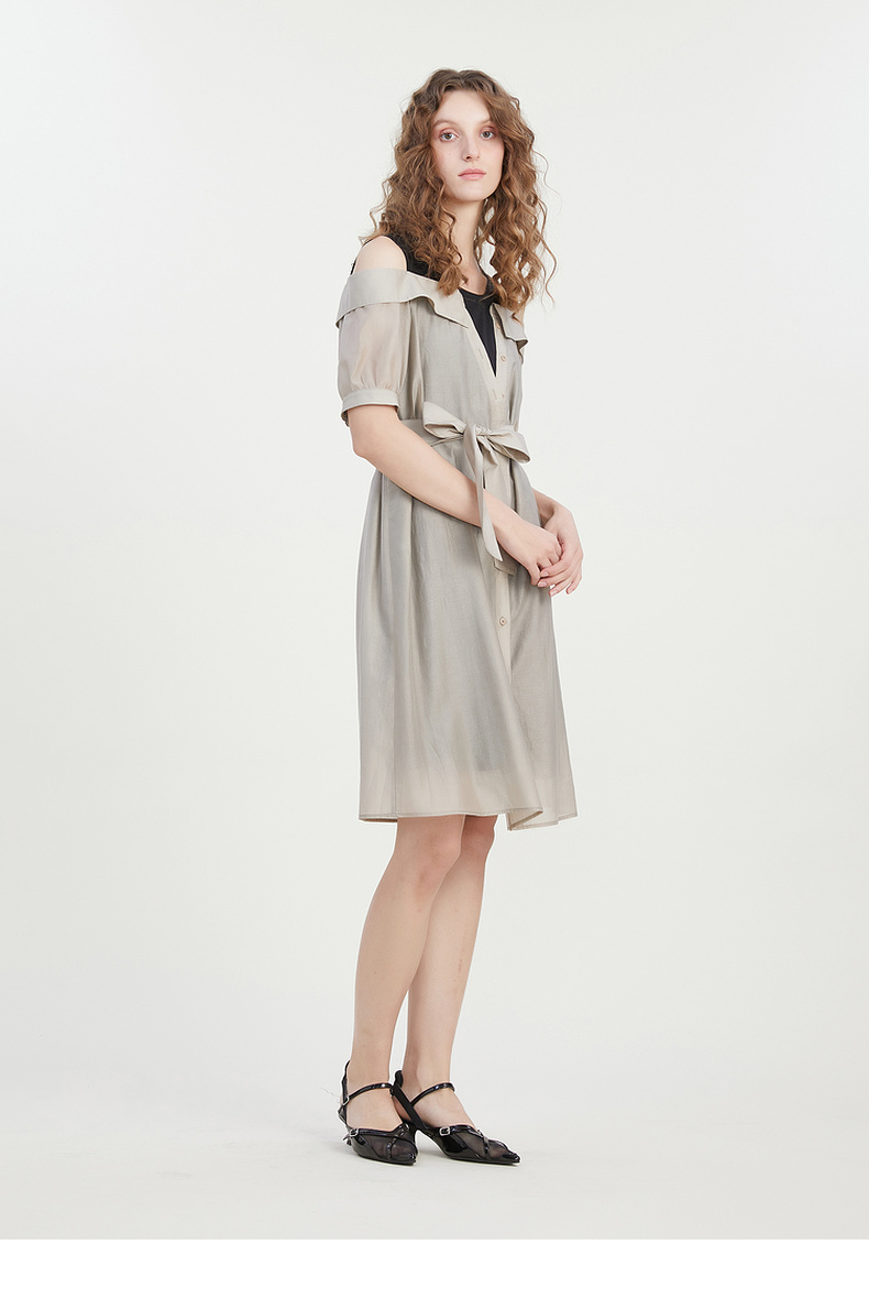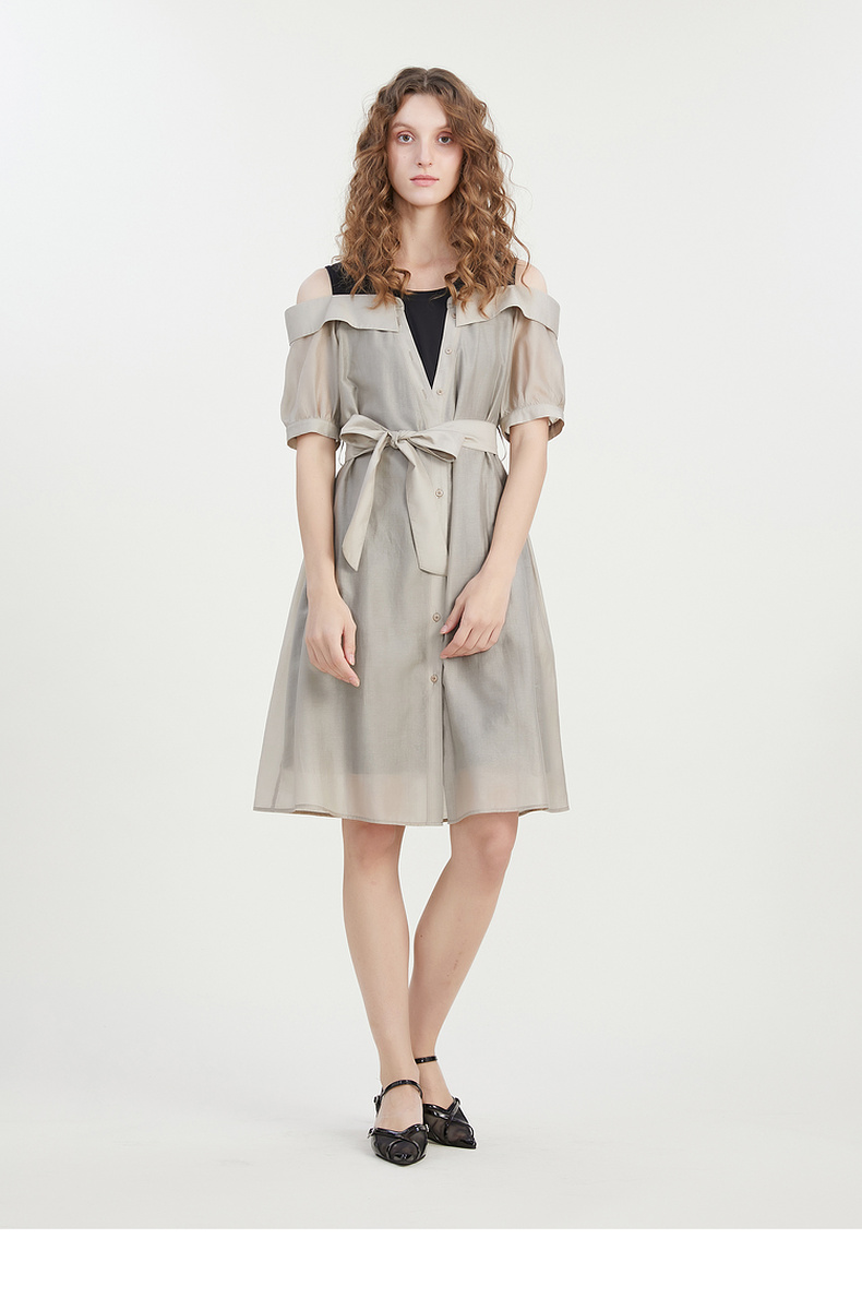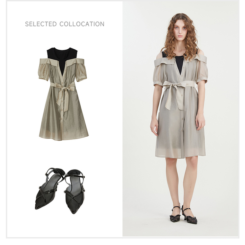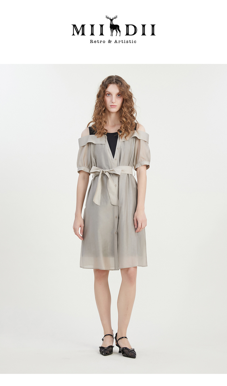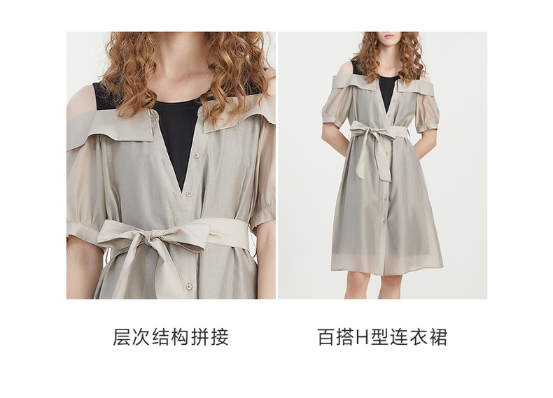 谜底连衣裙2023夏新款时尚通勤圆领拼接中长裙短袖露肩232ML0727
