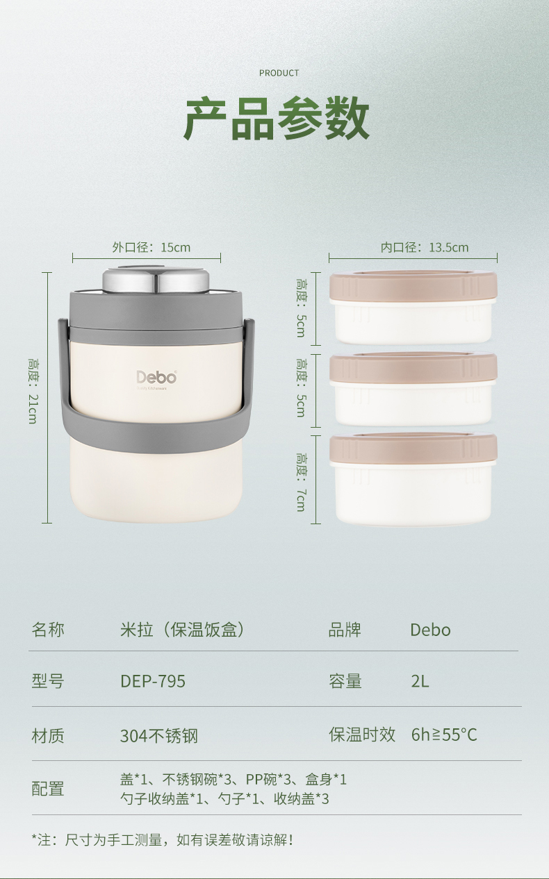 配置:盖*1、不锈钢碗*3、pp碗*3、盒身*1、勺子收纳盖*1、勺子*1、收纳盖*3