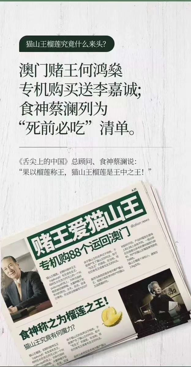 真正让其名声鹊起源于澳门赌王StanlyHo(何鸿燊),他曾经派人驾驶私人飞机从新加坡运了88颗“猫山王”榴莲回HK,请李嘉诚和其他生意大亨大吃 榴莲,被当时香港,澳门,新马一带的媒体大肆报道,一夜之间猫山王名声大噪,其知名度盖过其他所有榴莲品种。