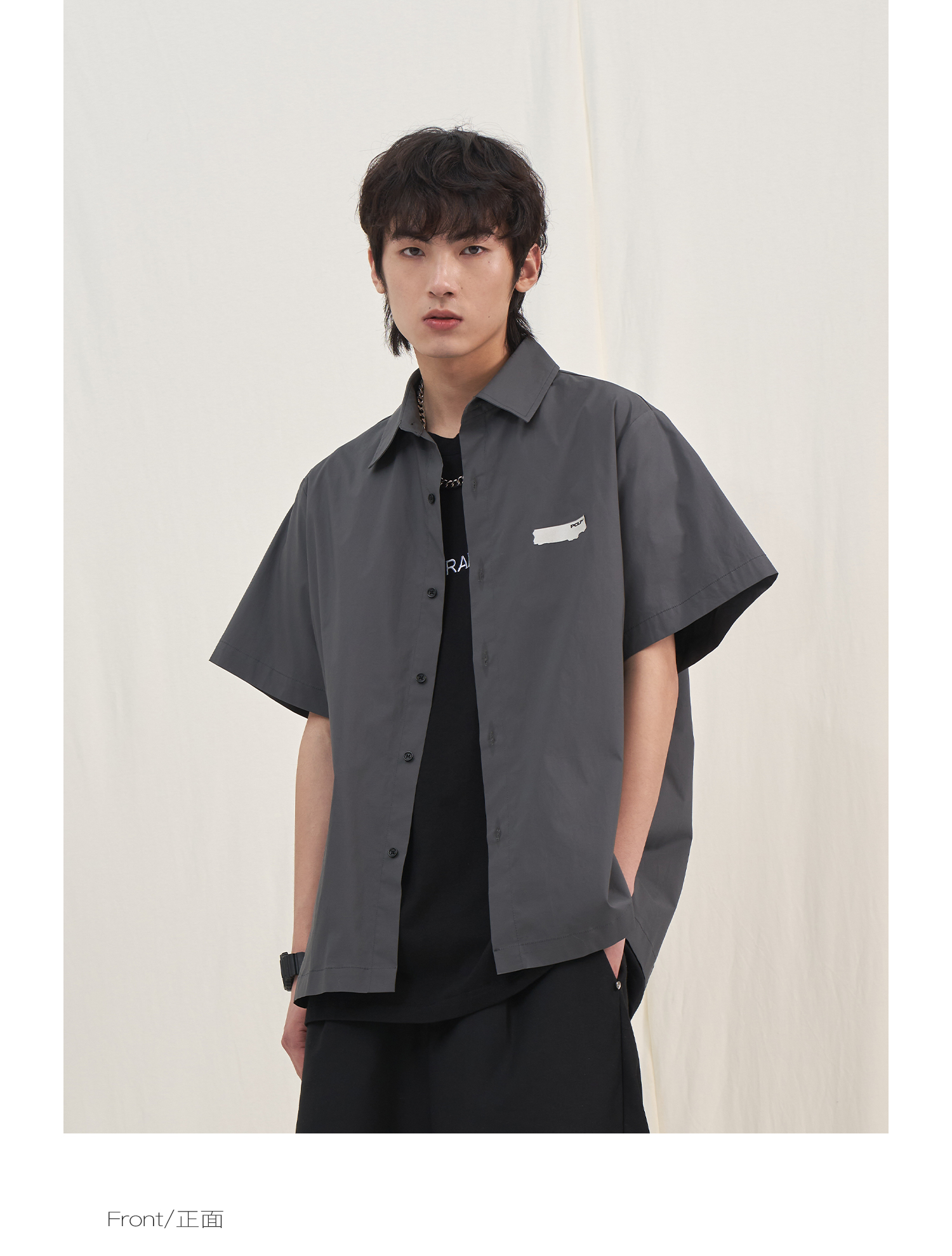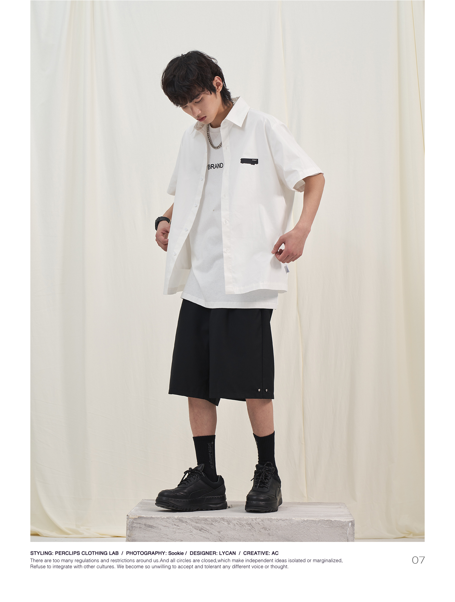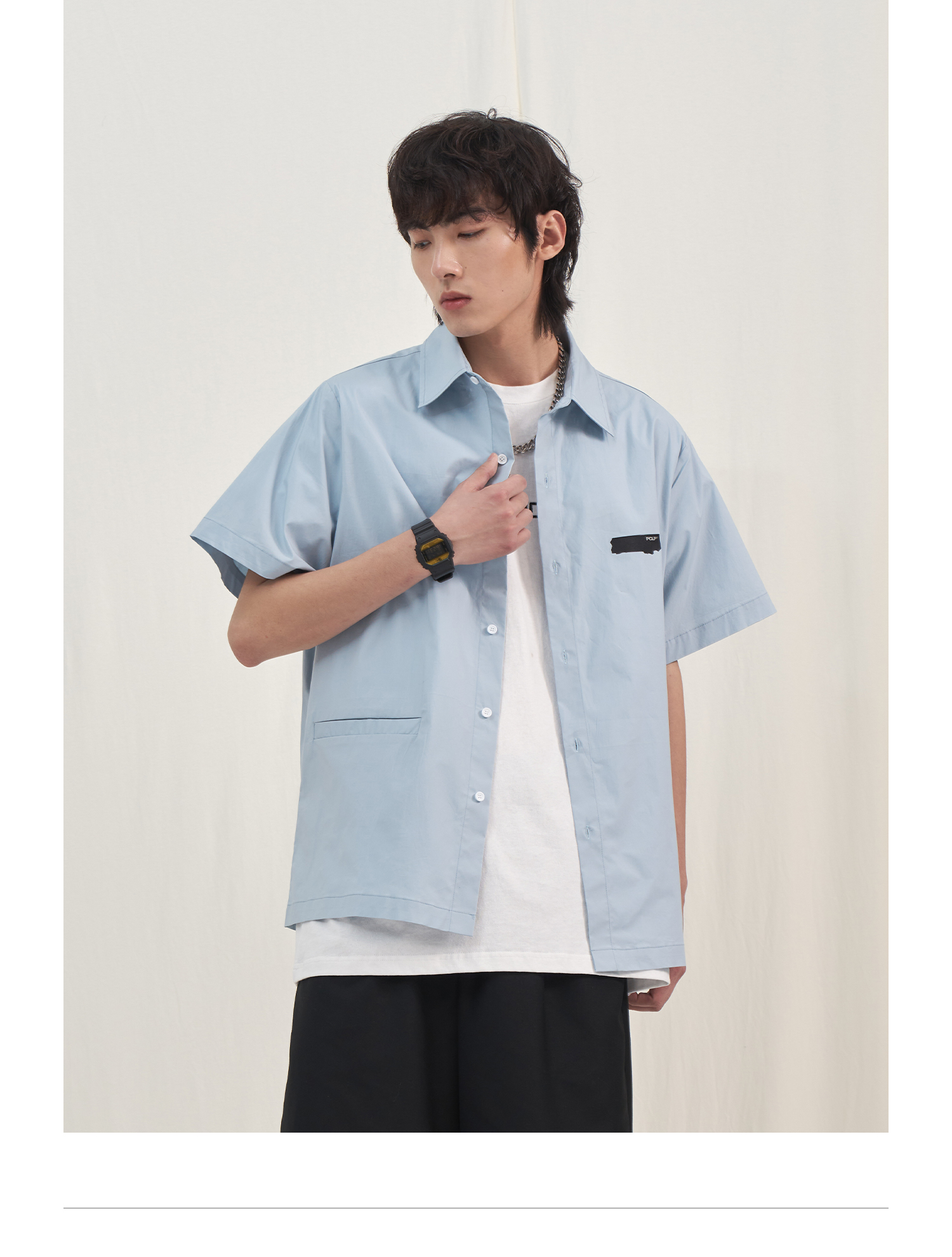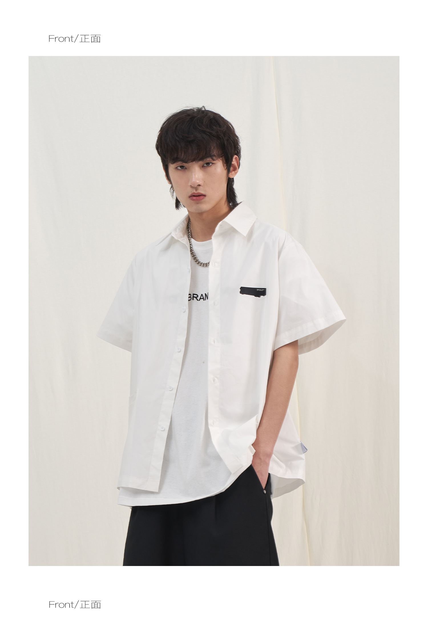 PCLP(PERCLIPS) 烫唛短袖衬衫 国潮牌休闲宽松纯色白色半袖衬衣男