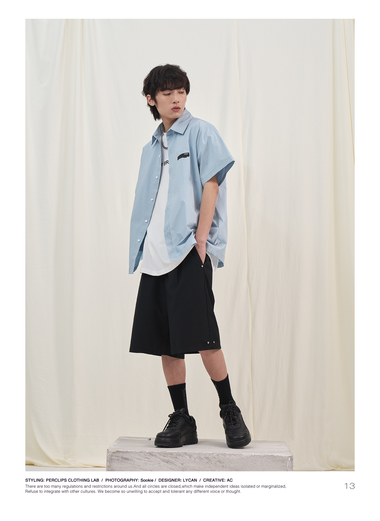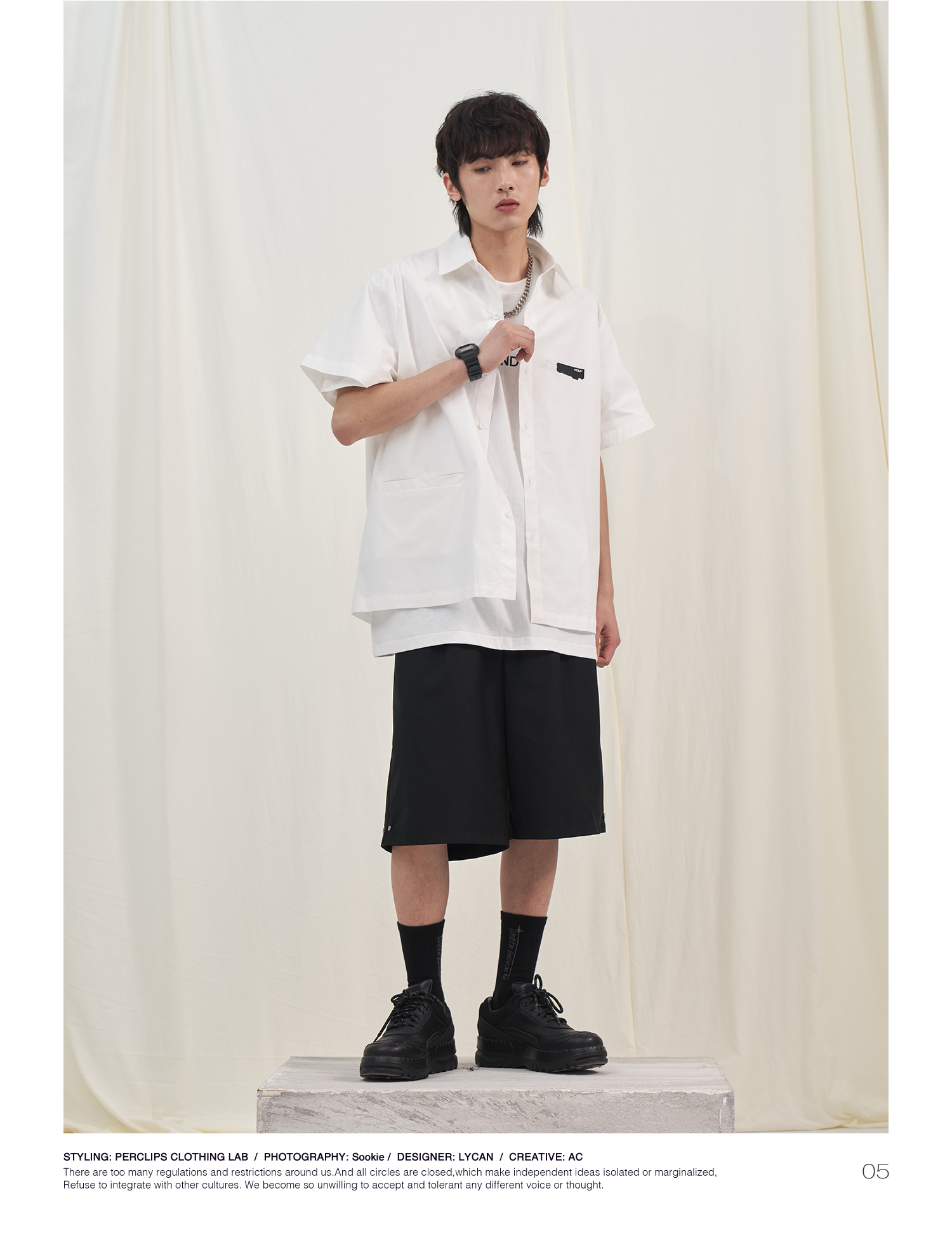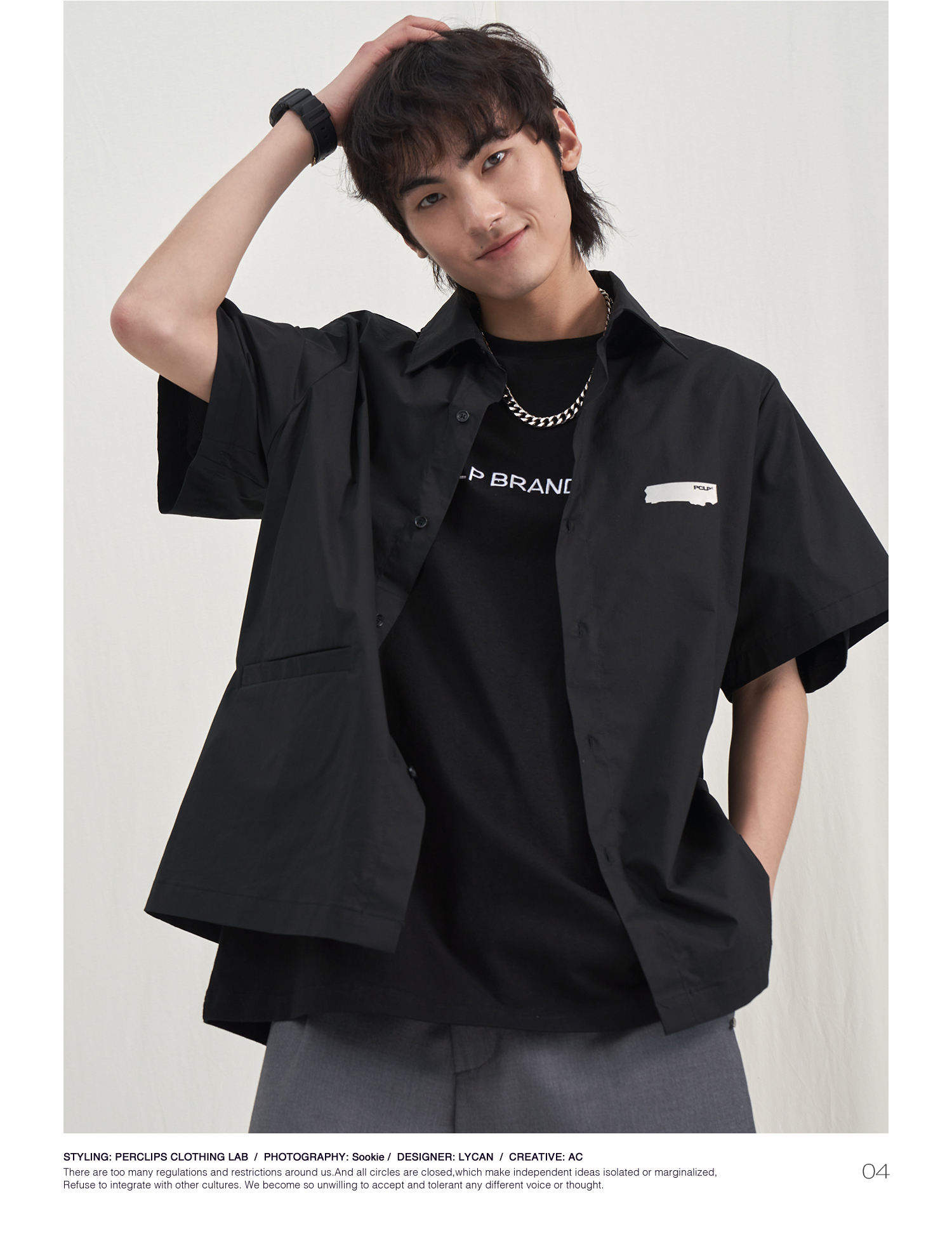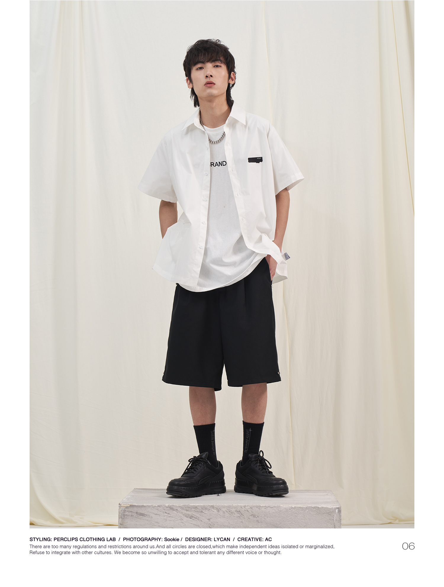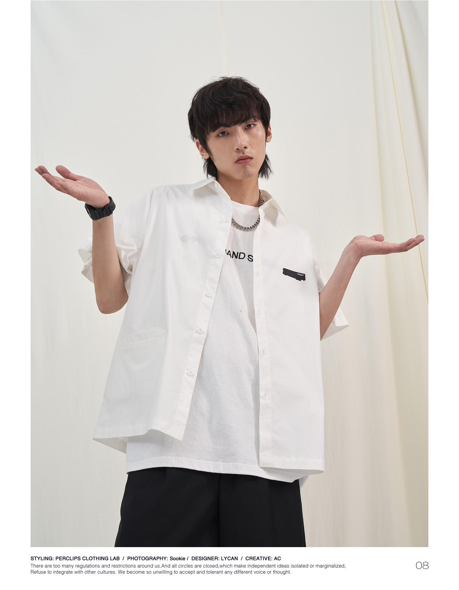 PCLP(PERCLIPS) 烫唛短袖衬衫 国潮牌休闲宽松纯色白色半袖衬衣男