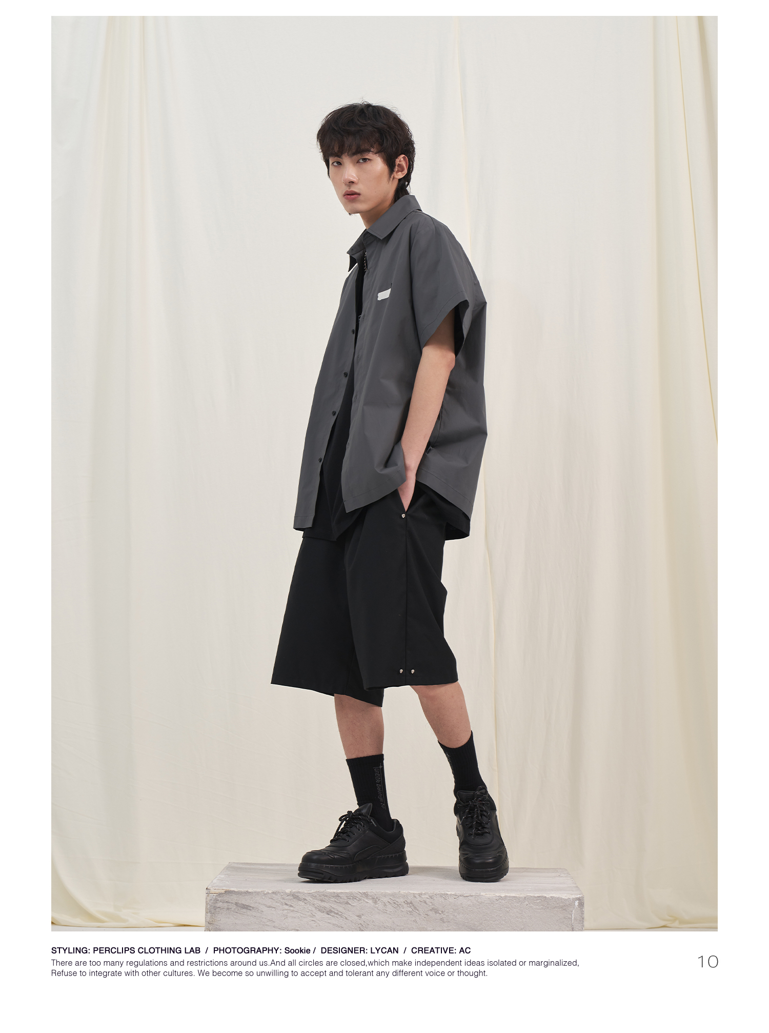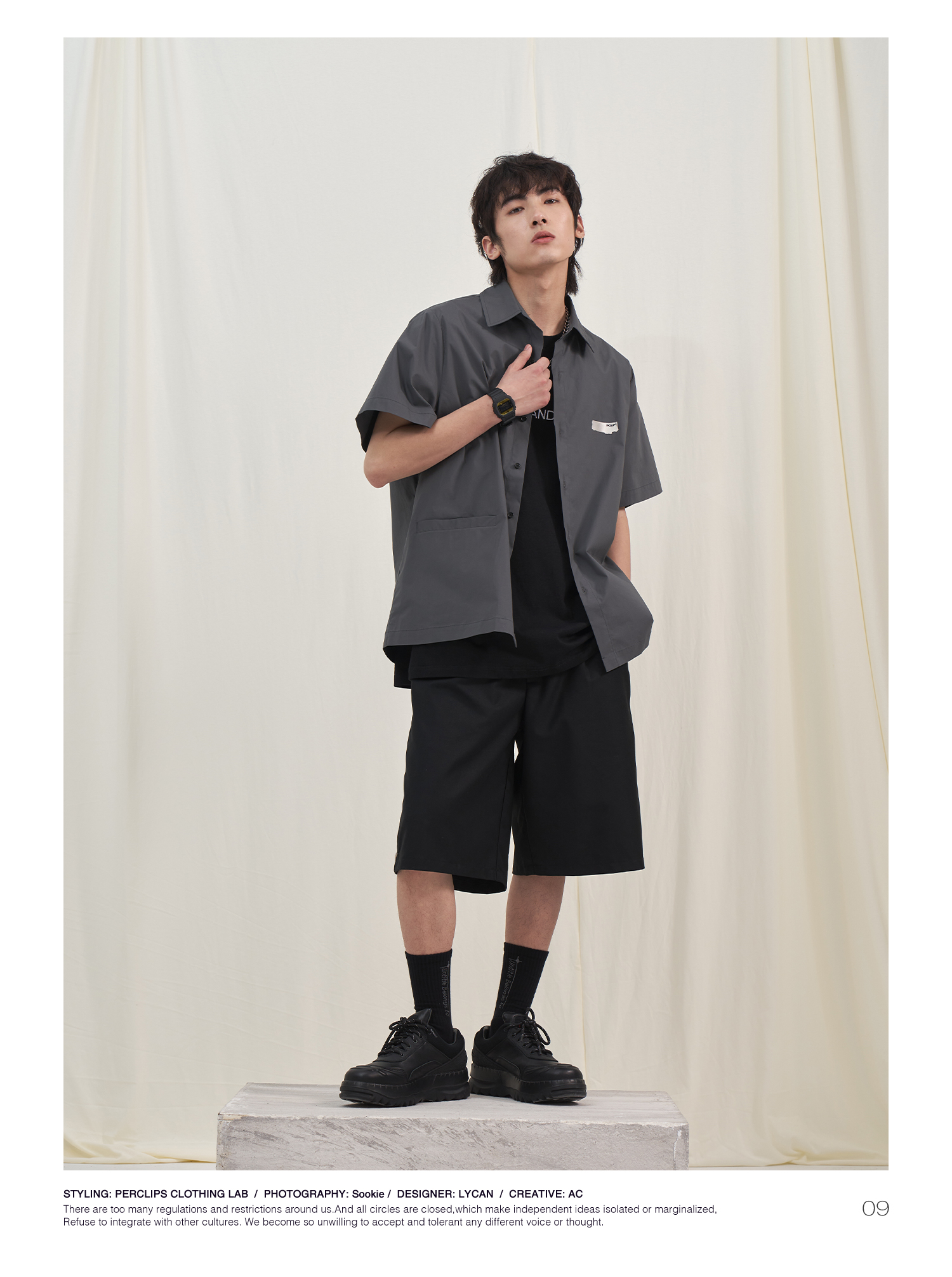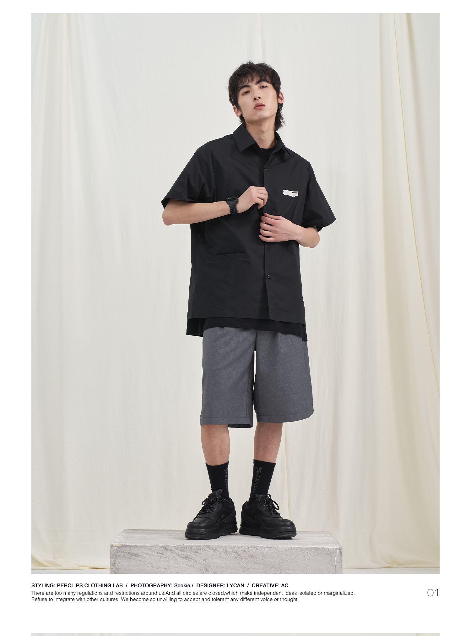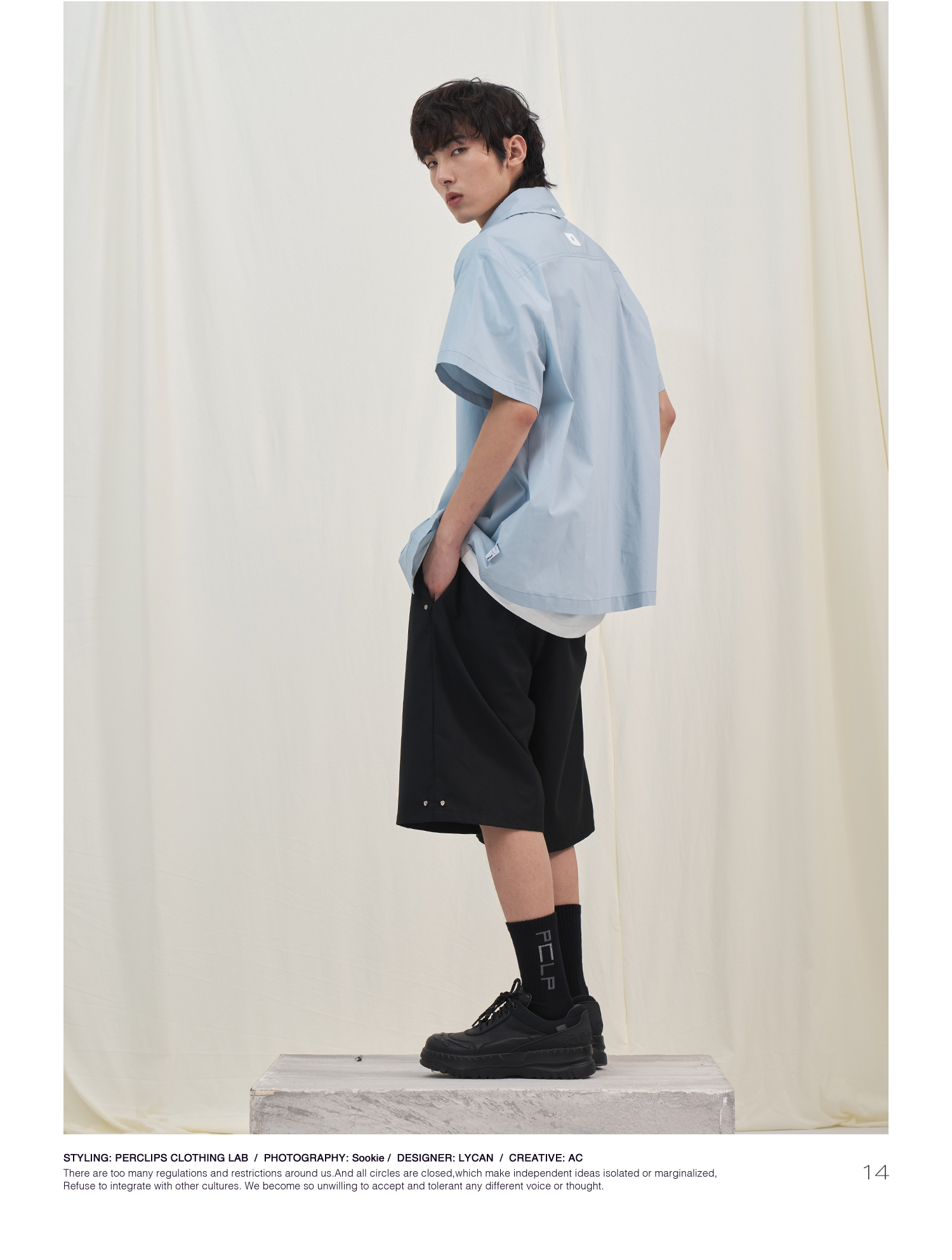 PCLP(PERCLIPS) 烫唛短袖衬衫 国潮牌休闲宽松纯色白色半袖衬衣男