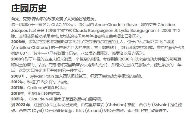 Clau de Nell酒庄葡萄园共占地10公顷,主要种植Cabernet Franc、Grolleau、CabernetSauvignon和Chenin Blanc,酿造出的葡萄酒Clau de Nell酒清新纯净、单宁紧实、具有很好的结构感,完美的呈现了Anjou的风士特色,具有卓越的陈年潜力。