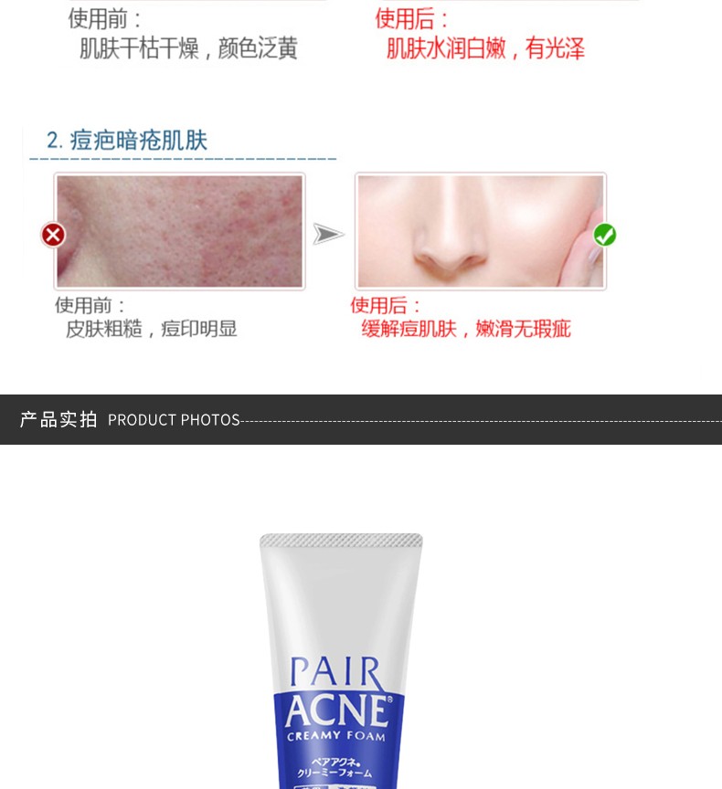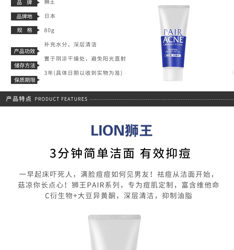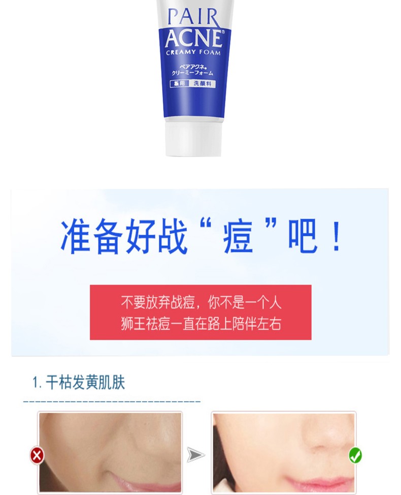 一早起床吓死人,满脸痘痘如何见男友!祛痘从洁面开始,菇凉你长点心!狮王PAIR系列,专为痘肌定制,富含维他命C衍生物+大豆异黄酮,深层清洁,抑制油脂!接近肌肤PH值!浸透入角质层,发挥效果。3分钟简单洁面,你不是一个人在战痘!