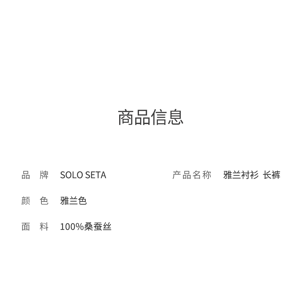 - soloseta专注于真丝织物,灵感源自意大利语,中文含义为“只做真丝”的意思。让睡衣变时尚,居家和外出瞬间切换,使其更具有出街,度假,参加宴会等功能。