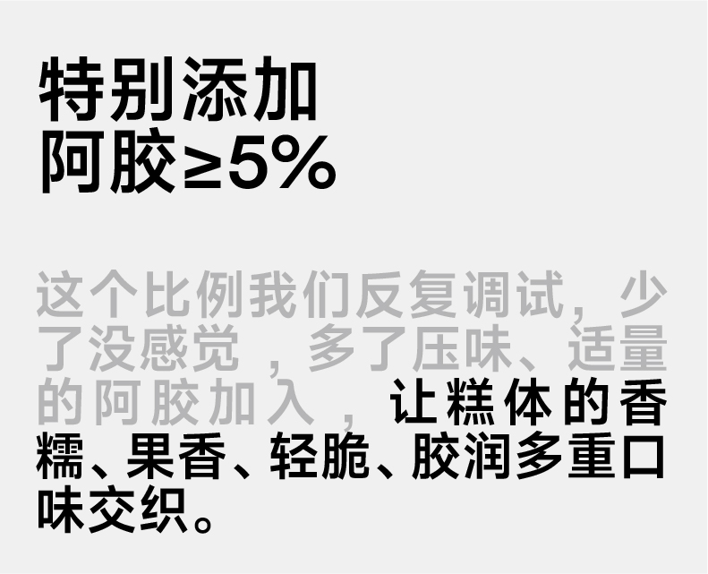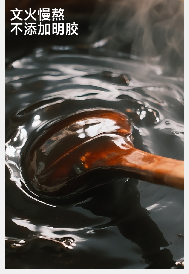 传统古法熬制工艺,慢火熬足30~40分钟,再中小火慢慢收浓,不添加明胶,也能做出软中带糯,、 韧而不粘牙的口感