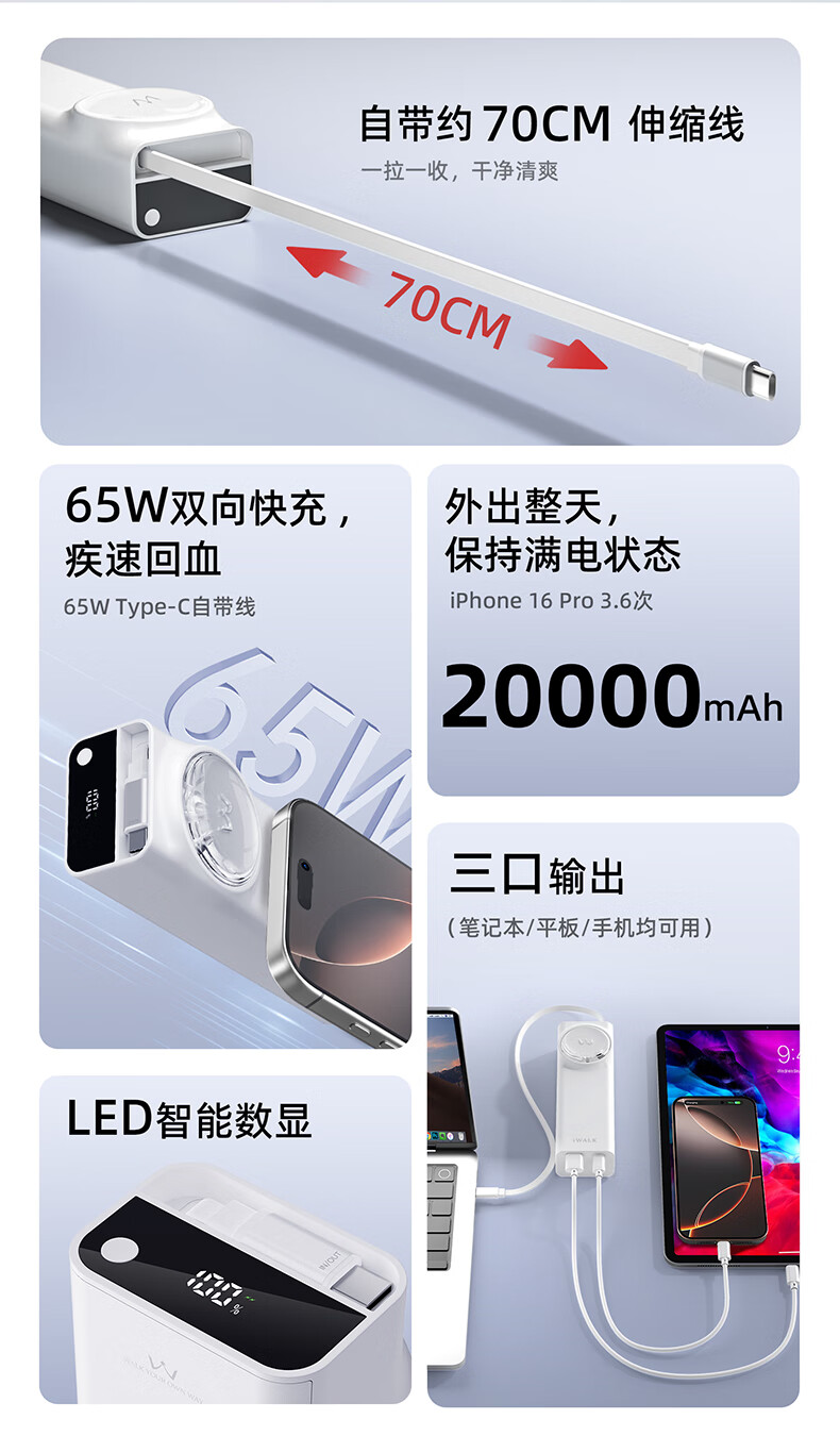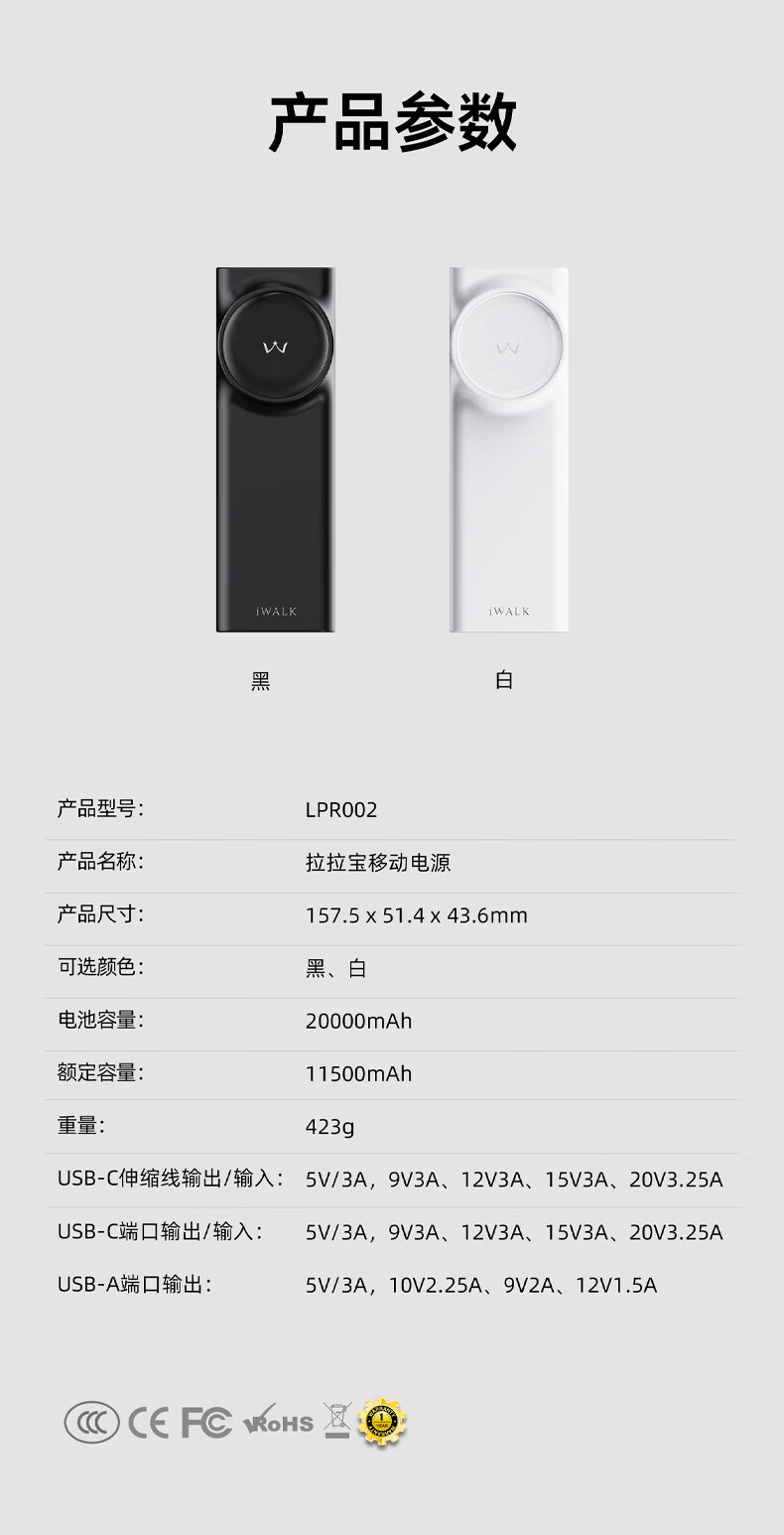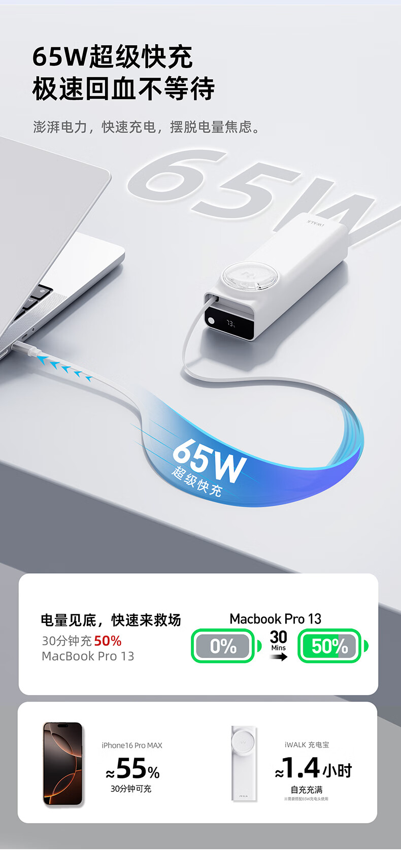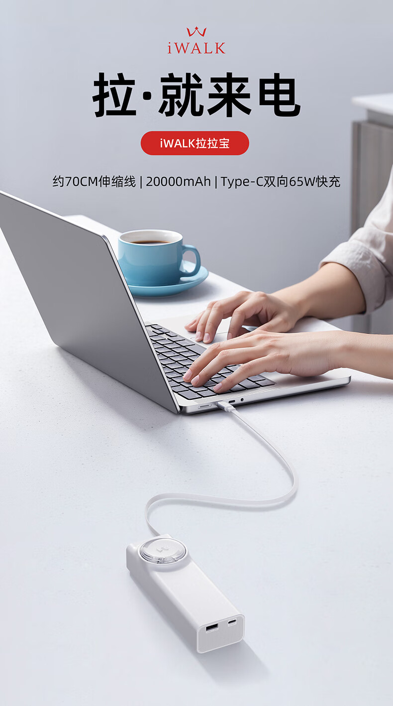 【国家3C认证】爱沃可(iWALK)拉拉宝20000毫安充电宝LPR002L/C 自带线双向65W快充便携笔记本电脑适用苹果华为小米小巧大容量手机电源