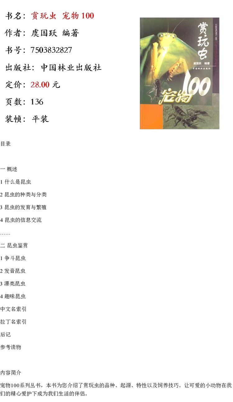 赏玩虫 宠物100 虞国跃 3282 昆虫鉴赏 饲养技巧 基本知识 中国林业出版社 畅销书