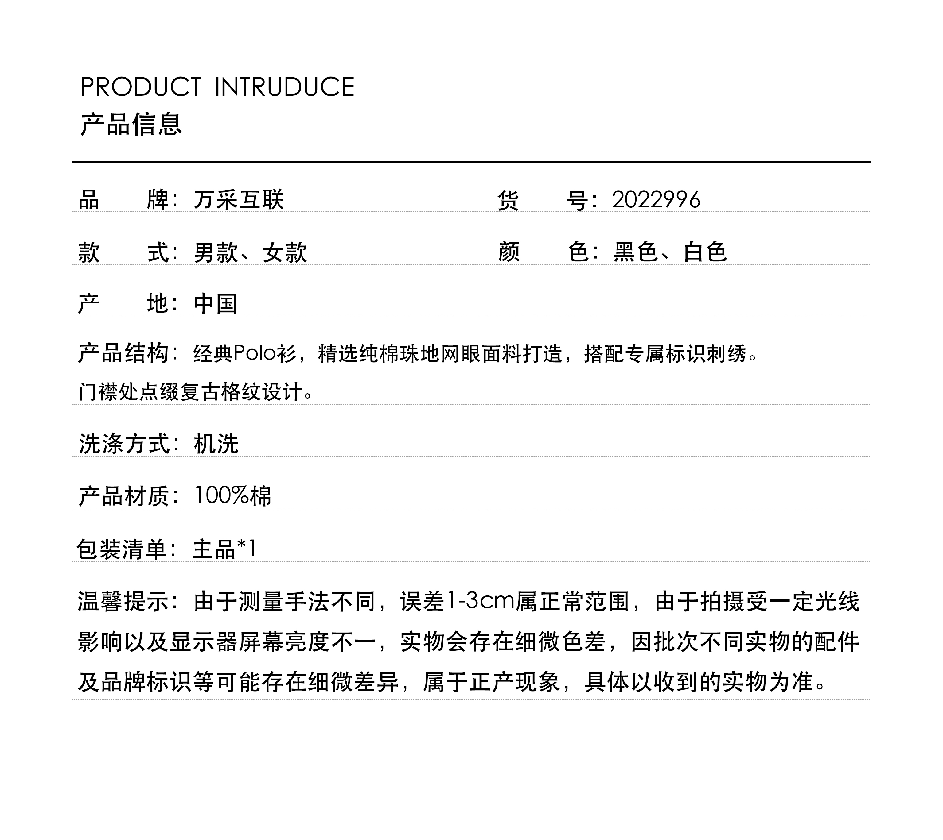 万采互联POLO衫(短袖) 纯棉 时尚百搭 经典版 门襟处点缀复古格纹设计
