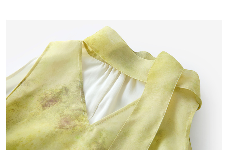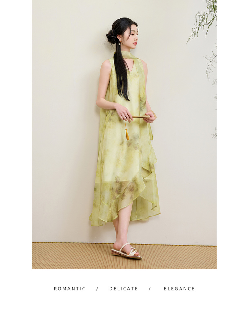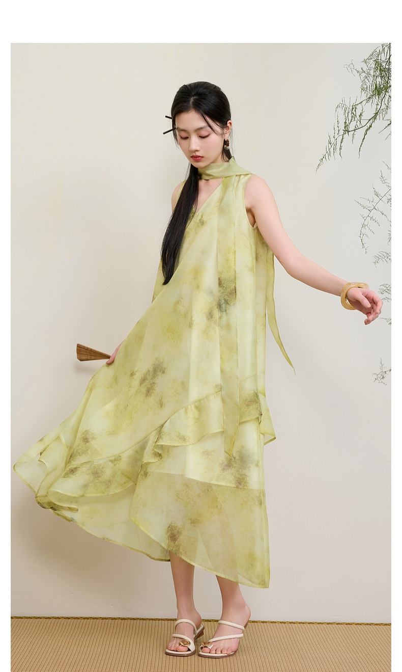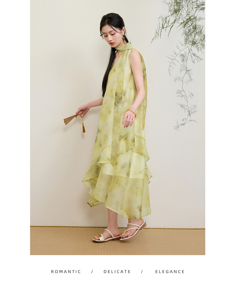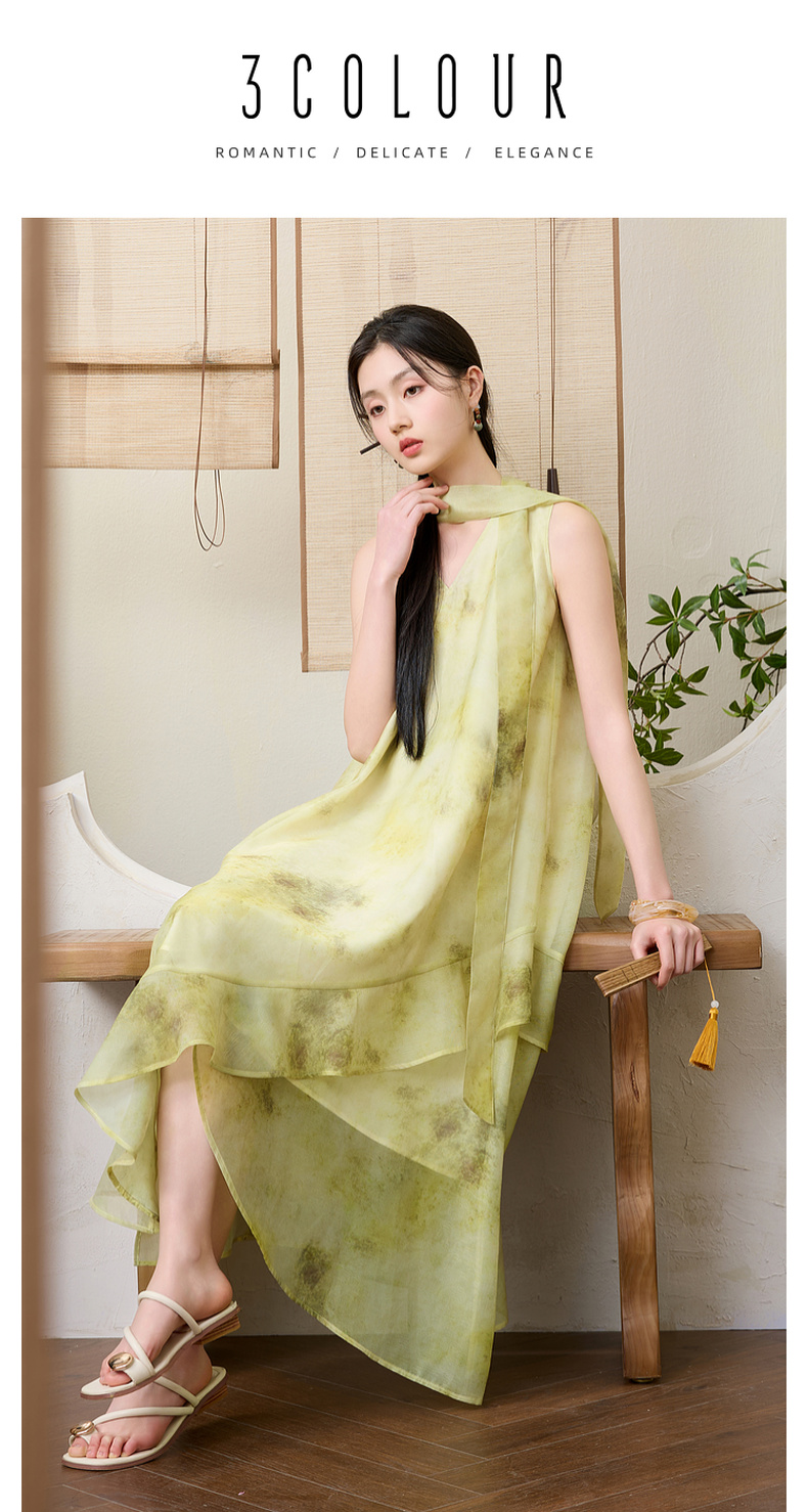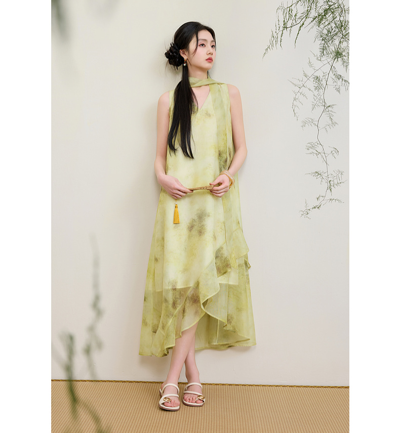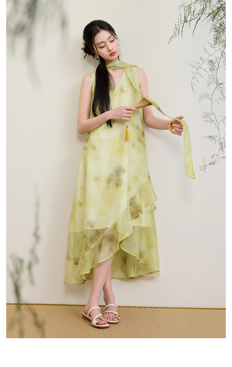 三彩2025夏季新款新中式连衣裙飘带无袖背心裙荷叶边长裙M