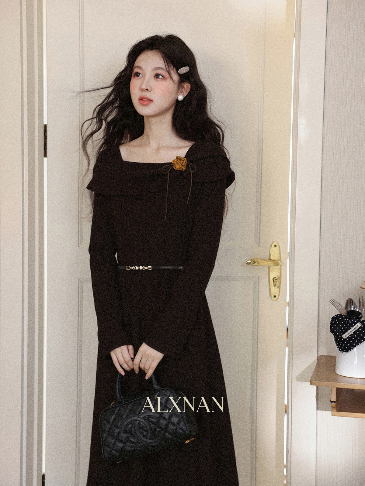 鹿向南「椿日粟子」法式连衣裙女秋冬新款设计感收腰显瘦内搭长裙