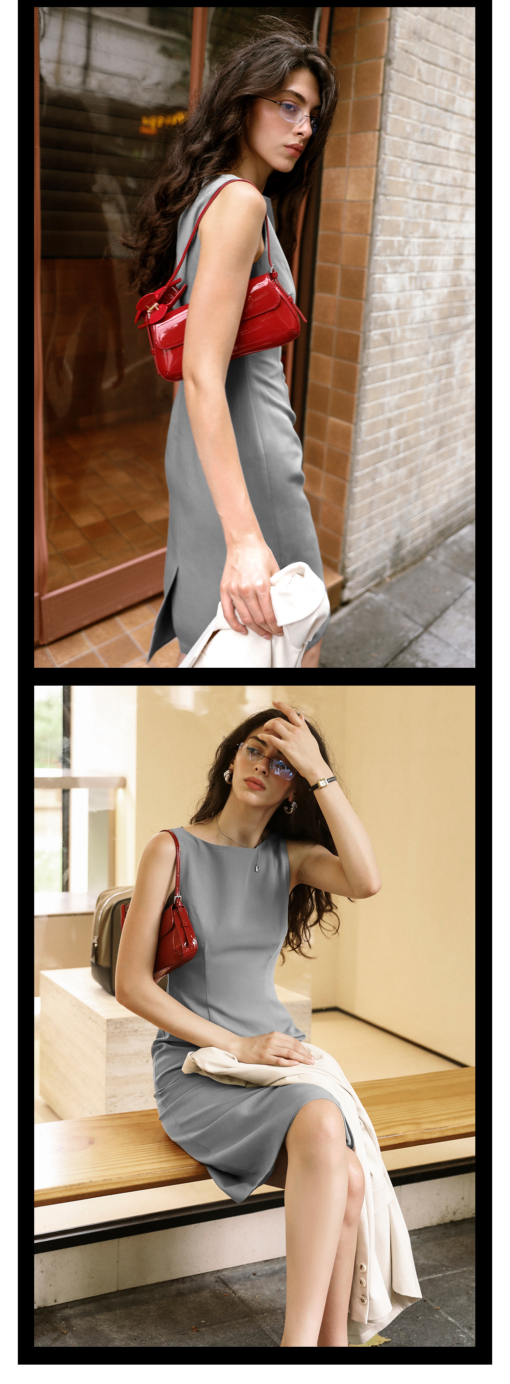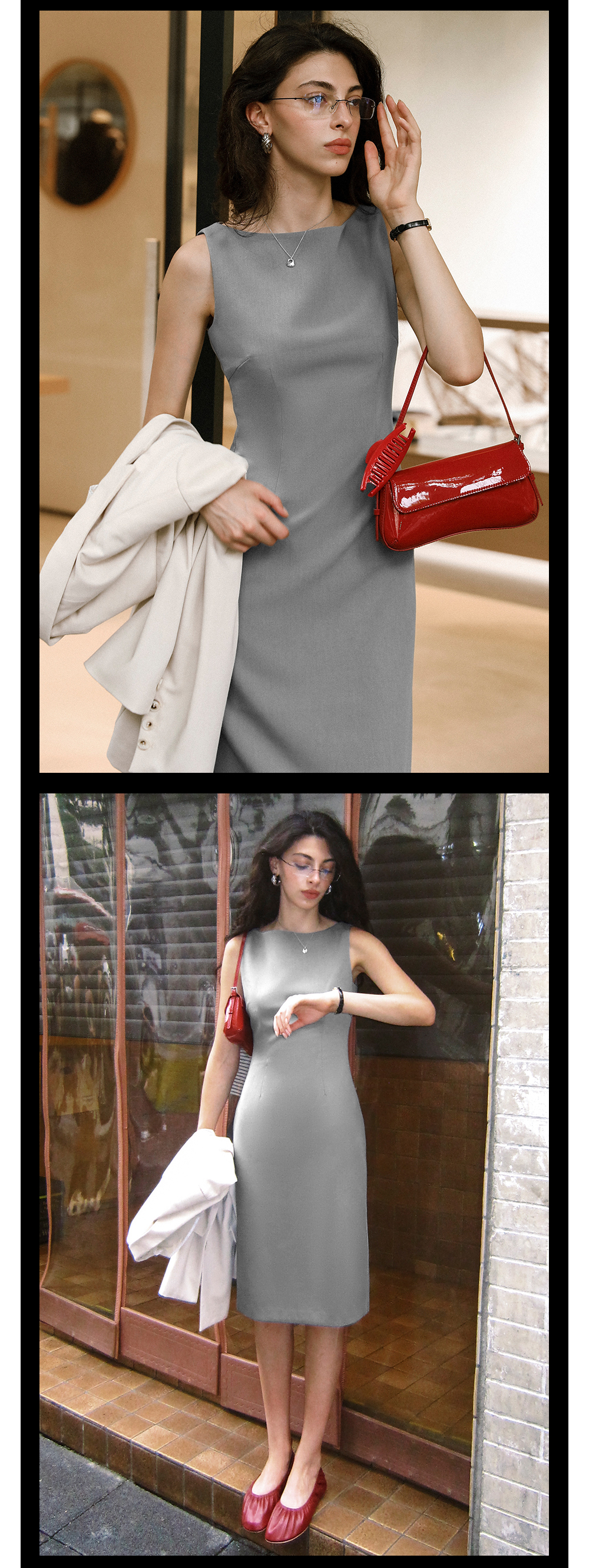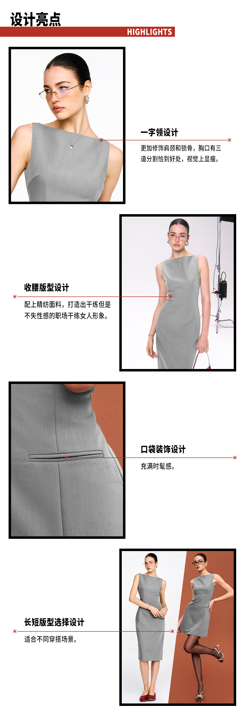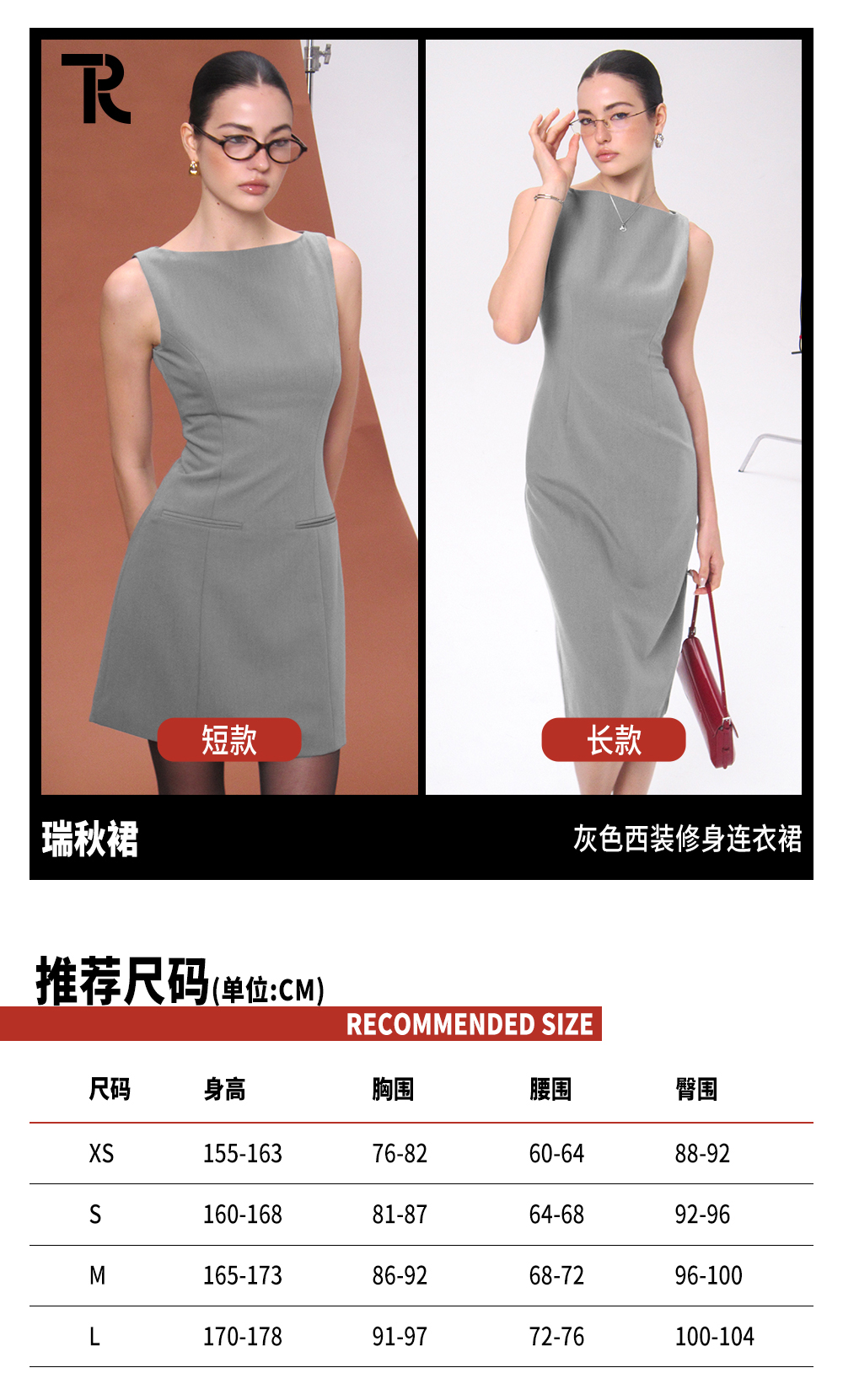 TR她热 瑞秋裙 灰色西装通勤无袖一字领收腰弹力辣妹显瘦连衣裙