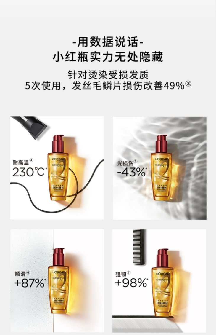 这款欧莱雅奇焕润发精油小红瓶 是专为烫染受损发质定制的! 主打修复功效!! 用数据说话,小红瓶实力无处隐藏!! 染烫后用小红瓶护理头发可以强效修护受损发质 5次使用,发丝毛鳞片损伤改善49% 适合所有发质!真的是“懒人救星”!!