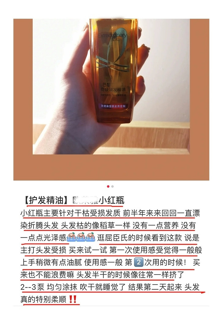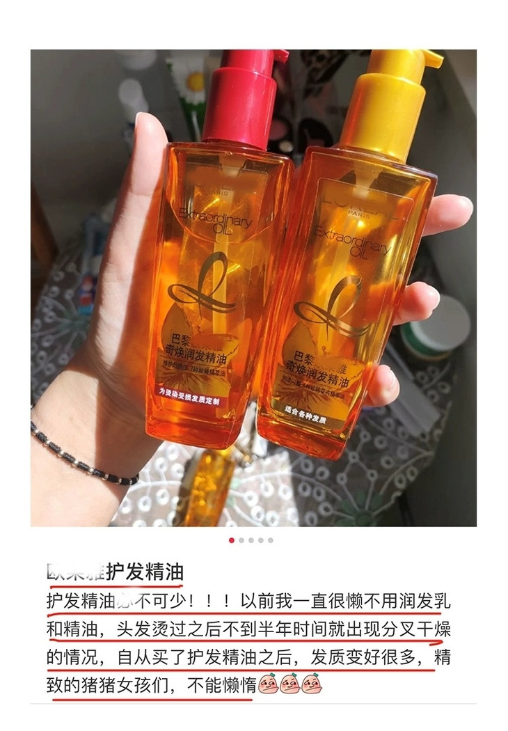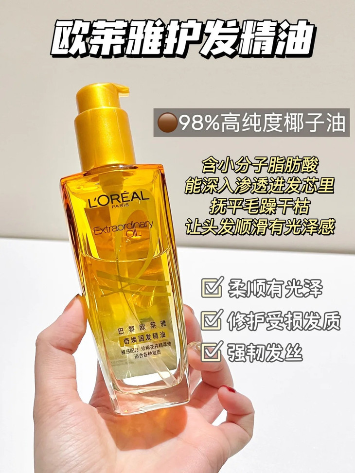 欧莱雅这个品牌的护发产品根本不用过多介绍 女明星的挚爱,李冰冰、刘雯、辛芷蕾、奚梦瑶都为它家产品实力代言!! 并且只要去搜烫染护法精油有这款精油的身影!! 简直是烫染女孩的护发宝藏!!! 小红书上的口碑也多到数不过来!!