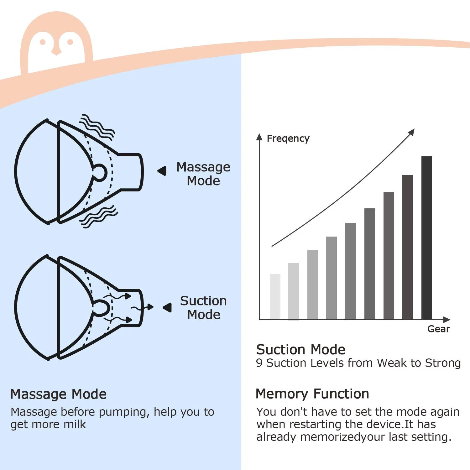 无痛且快速吸吮——2个模式(泵奶模式和按摩模式),每个模式有9个等级。按摩模式有助于将乳汁从乳管中排出,减轻乳房的不适;9级吸力等级确保每位妈妈找到自己的节奏,在更短时间内产出更多奶水。